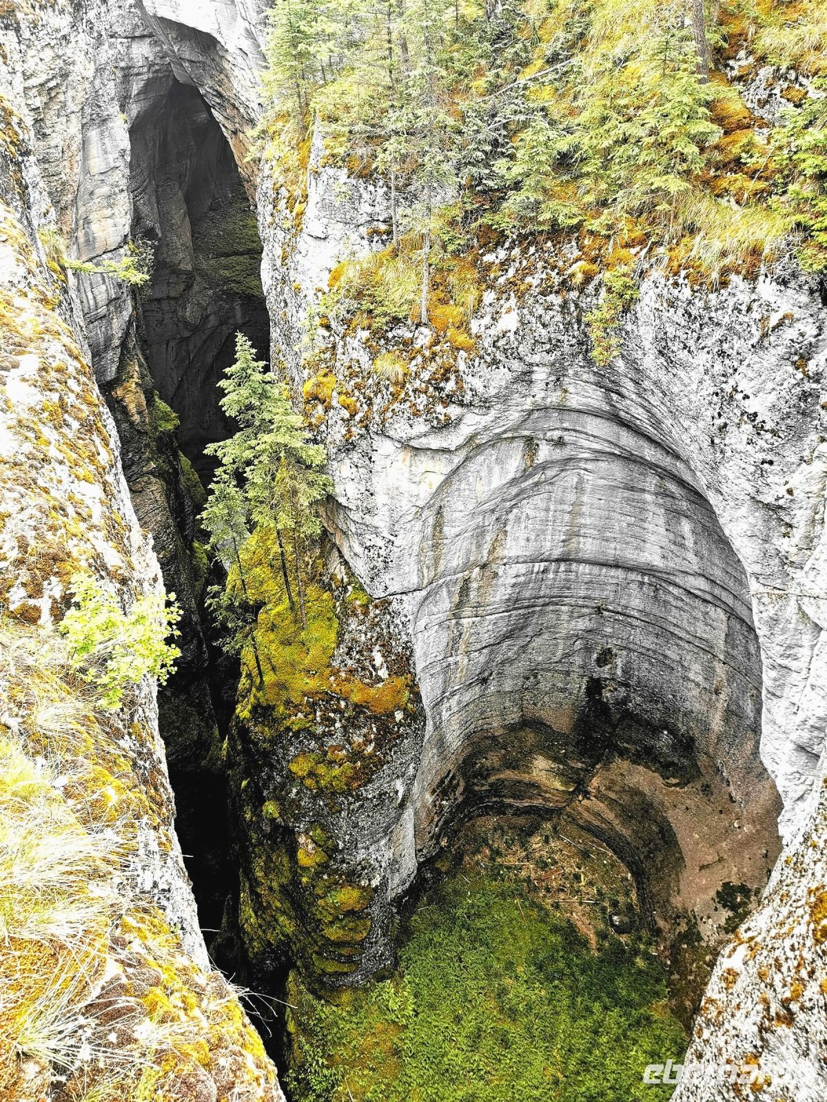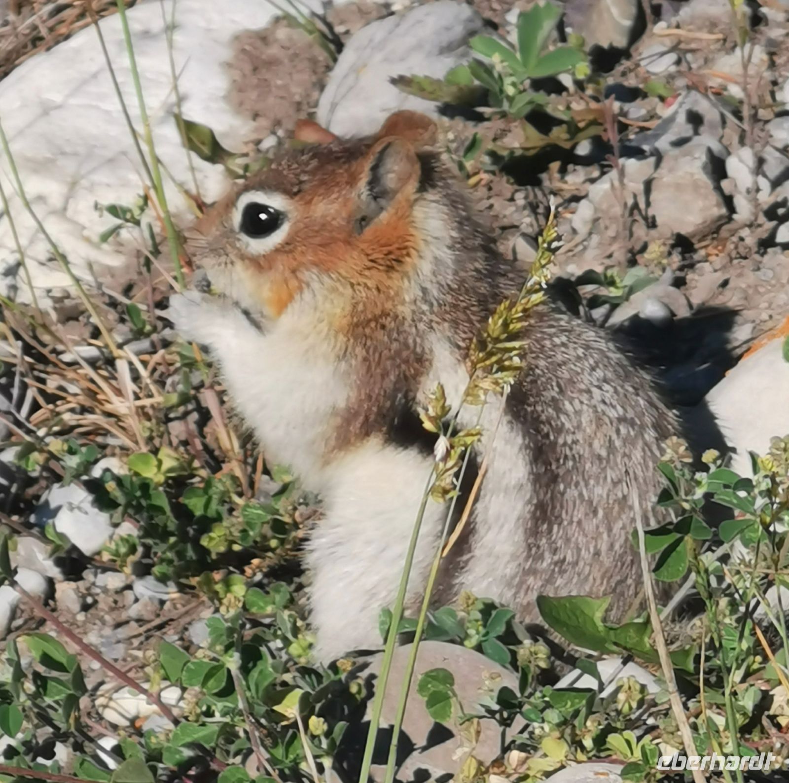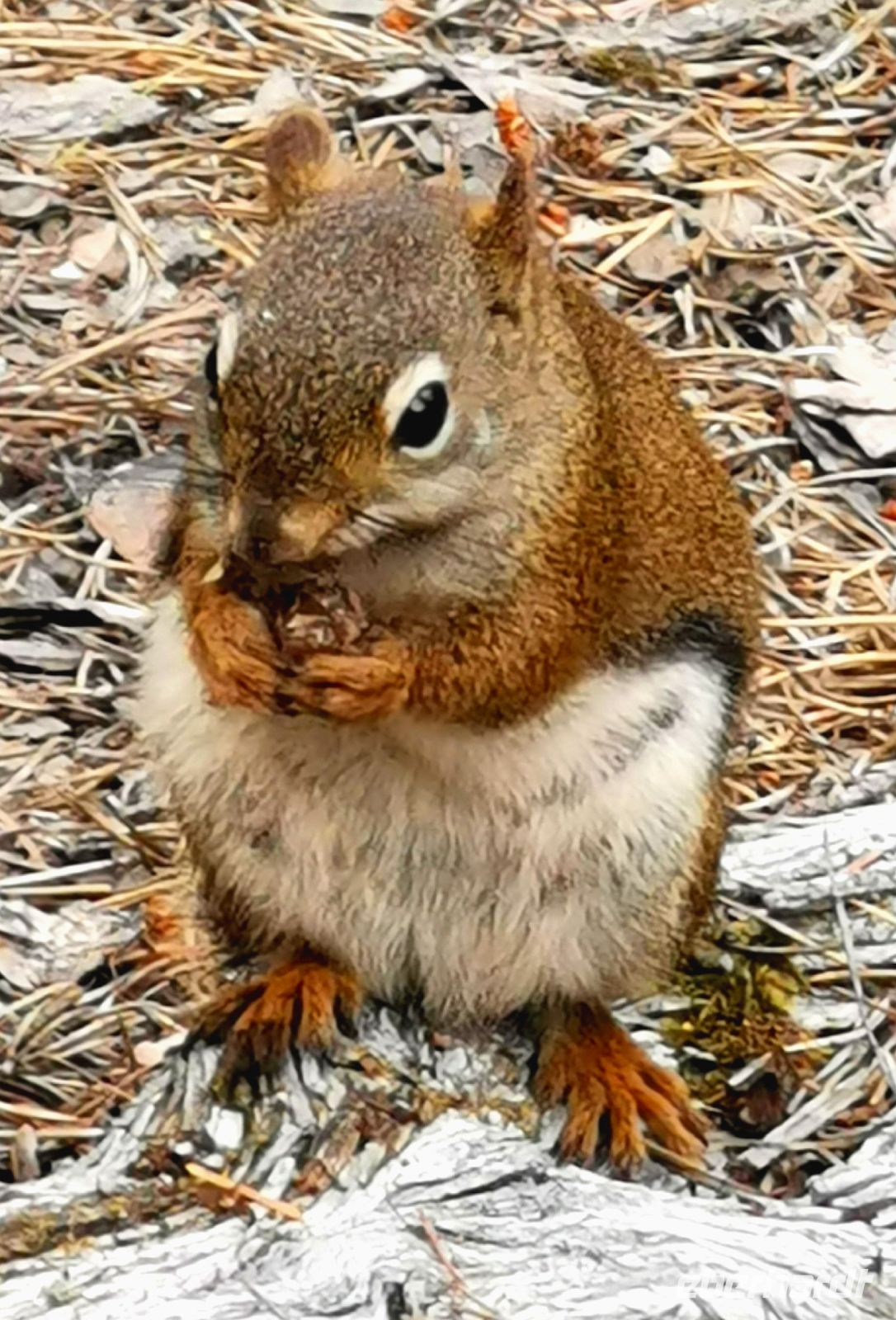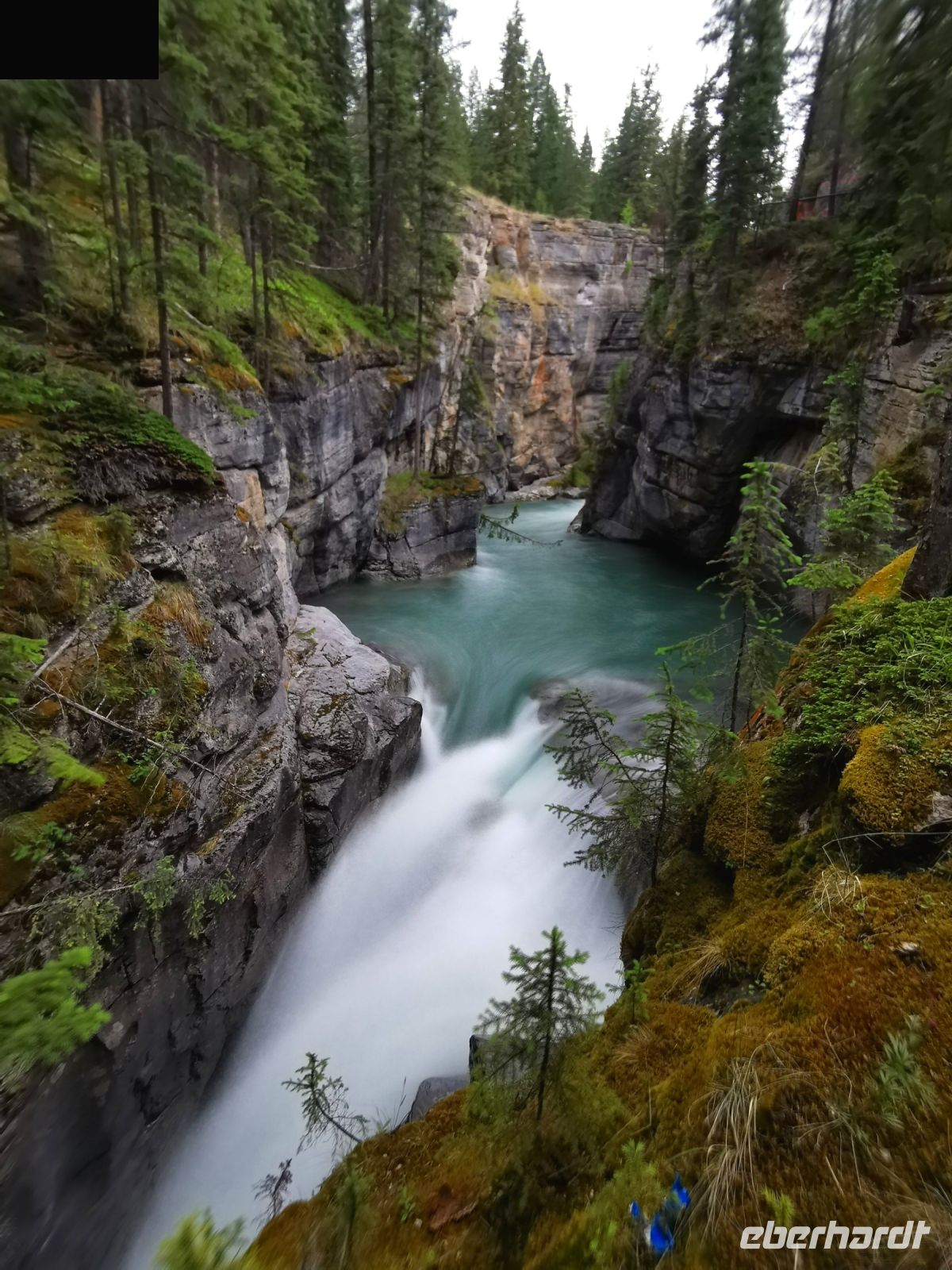 Mit etlicher Verspätung erreichen wir den Maligne Canyon, der sich mit einem Karstsystem verbindet. Er zählt zum UNESCO Weltkulturerbe und der wasserreiche Strom der durch die Schlucht fließt reißt etliche Baumstämme mit sich. Gleich neben dem Waldweg hüpfen munter die Eichhörnchen und fressen genüßlich Zapfen, so daß wir sie hervorragend beobachten können.