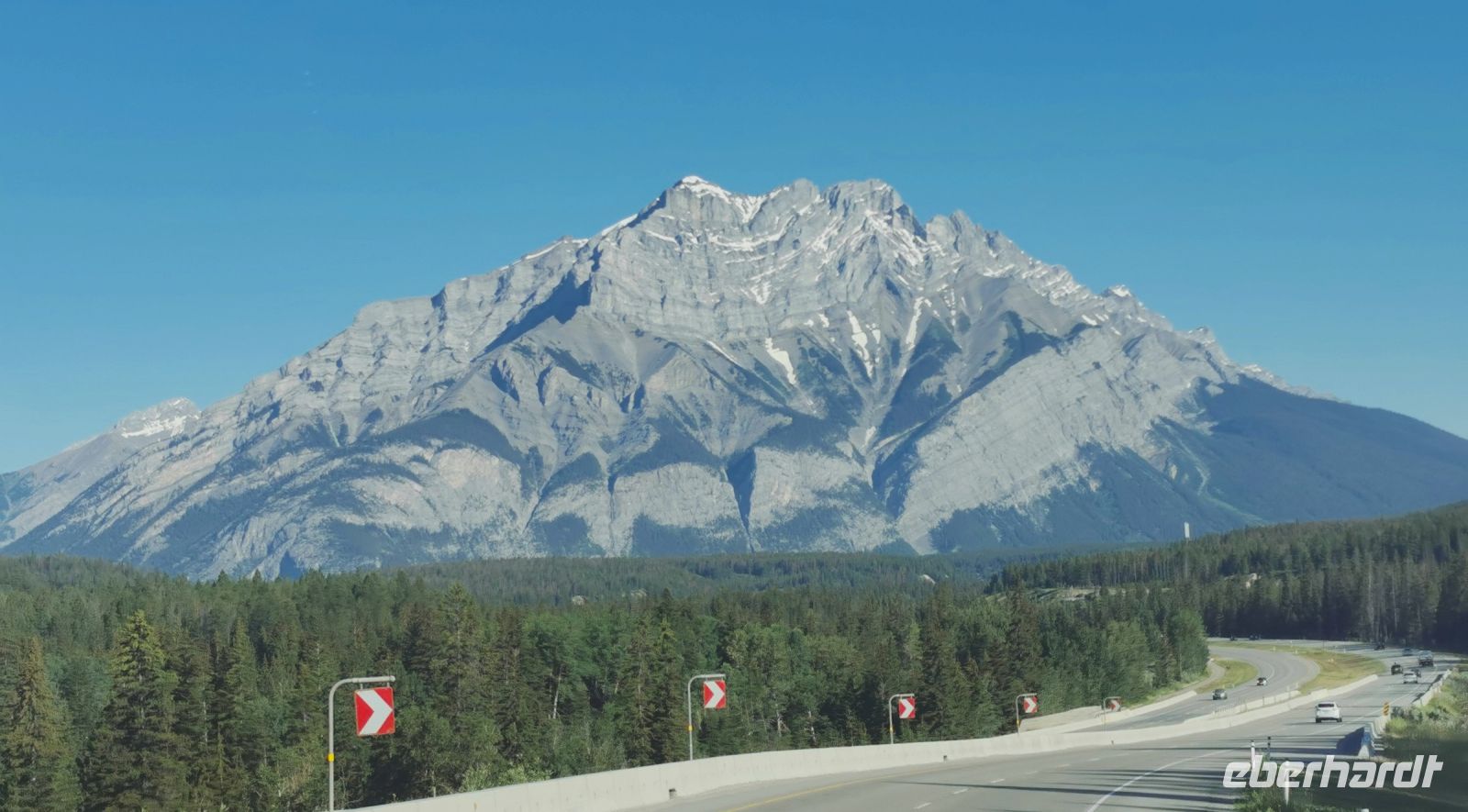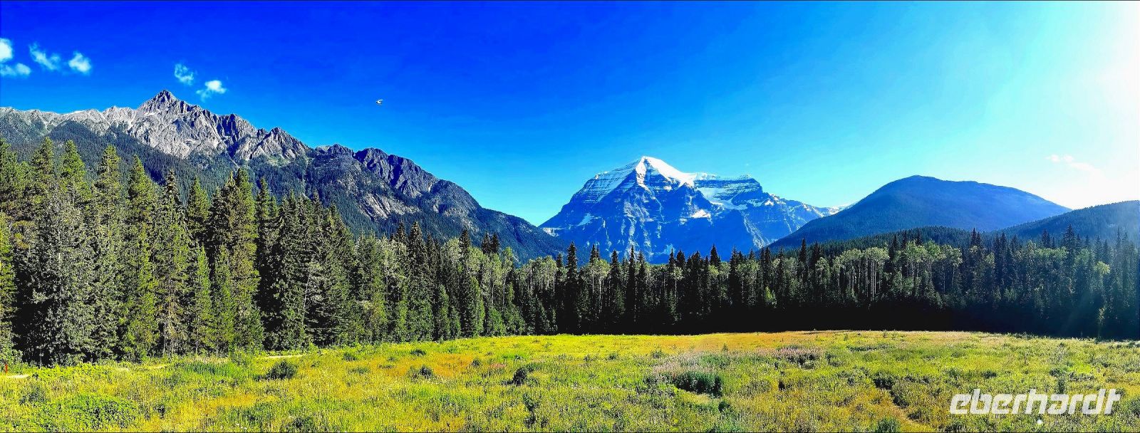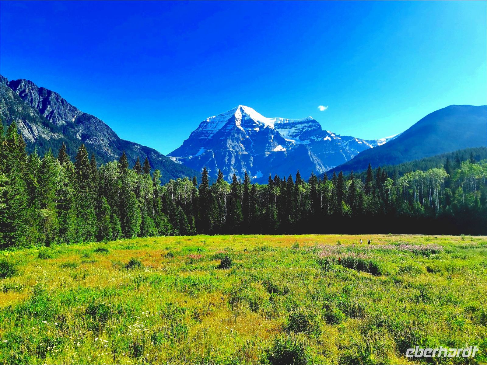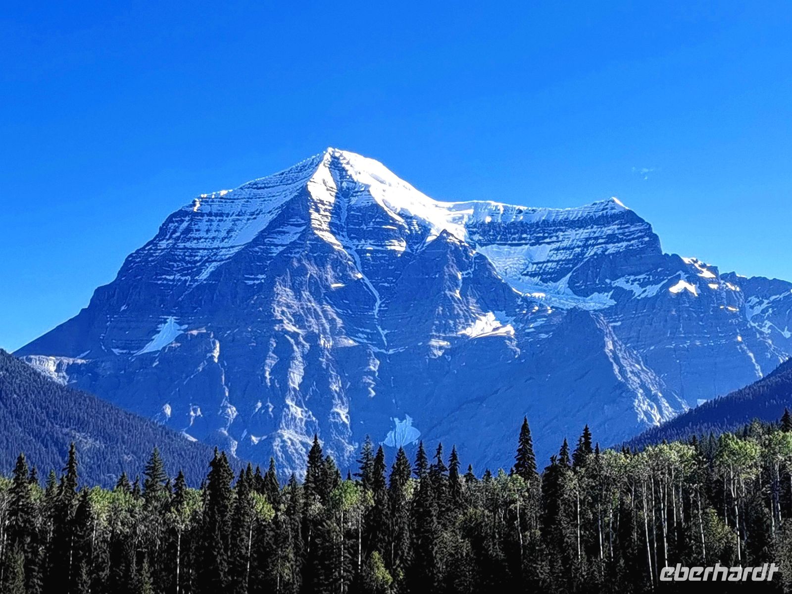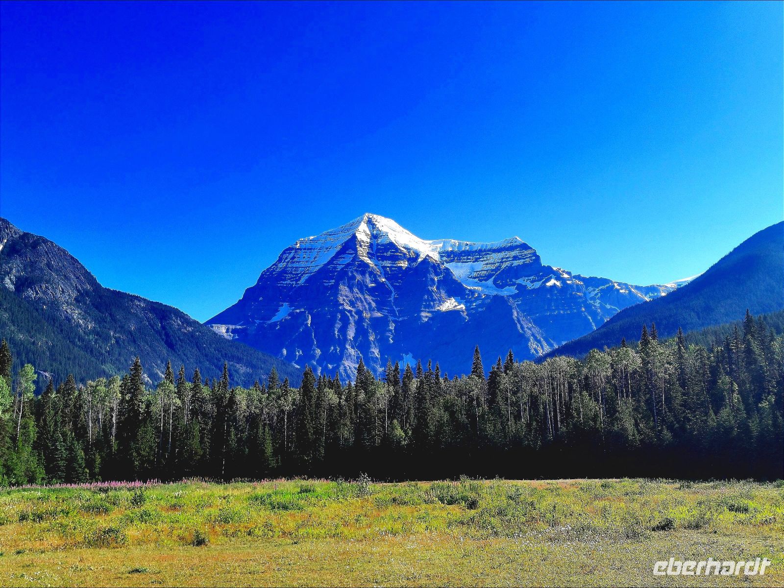 Als wir wenig später auf den Parkplatz des etwas weiter gelegenen Mount Robson abbiegen, erblicken wir den 3.954 Meter hohen Berg in voller Schönheit. Er ist der höchste Berg in den kanadischen Rocky Mountains. Wir haben großes Glück heute, kein Wölkchen ist am Himmel zu sehen und die Konturen des schneebedeckten Gipfels zeichnen sich klar vor dem azurblauen Himmel ab.