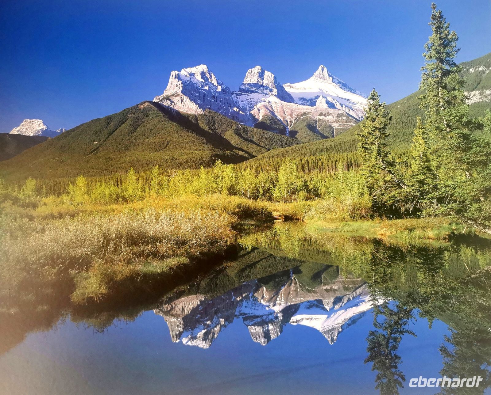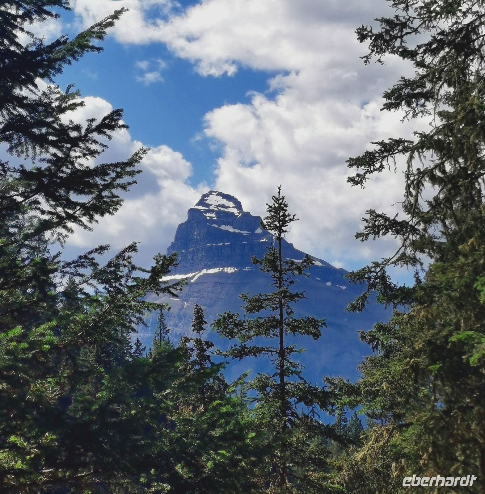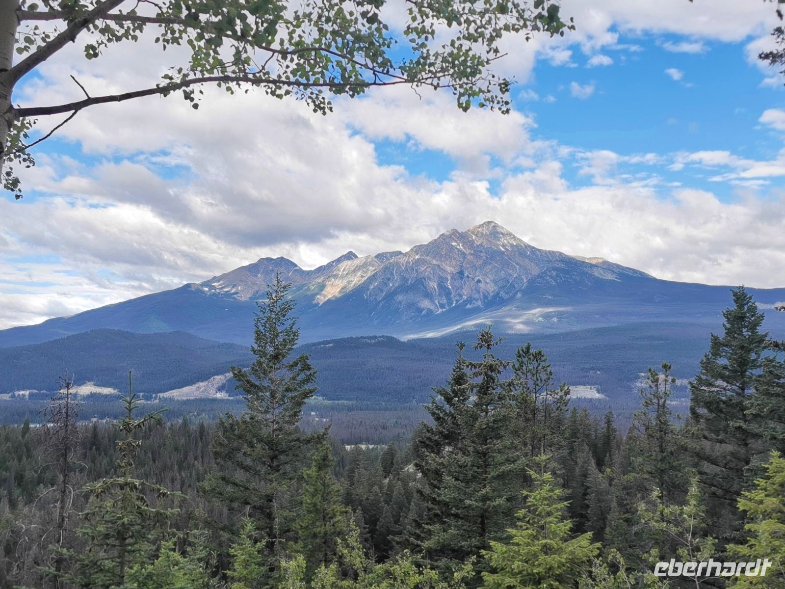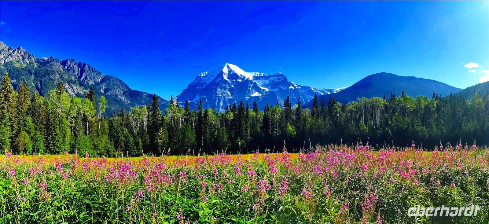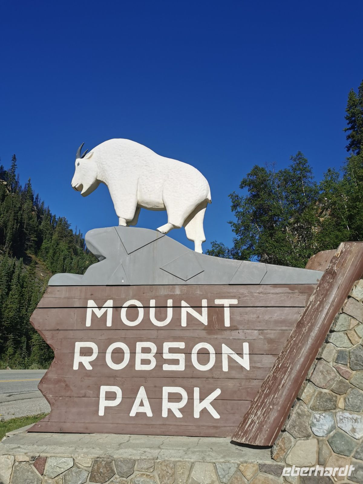 Als wir wenig später auf den Parkplatz des etwas weiter gelegenen Mount Robson abbiegen, erblicken wir den 3.954 Meter hohen Berg in voller Schönheit. Er ist der höchste Berg in den kanadischen Rocky Mountains. Wir haben großes Glück heute, kein Wölkchen ist am Himmel zu sehen und die Konturen des schneebedeckten Gipfels zeichnen sich klar vor dem azurblauen Himmel ab.