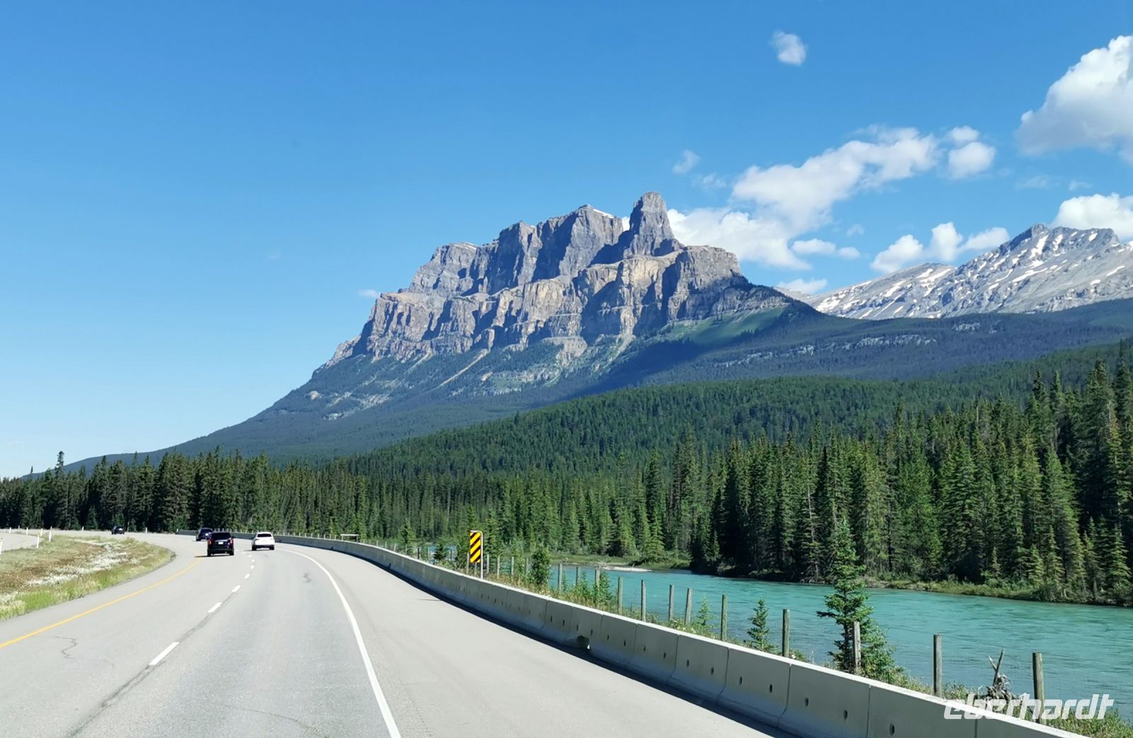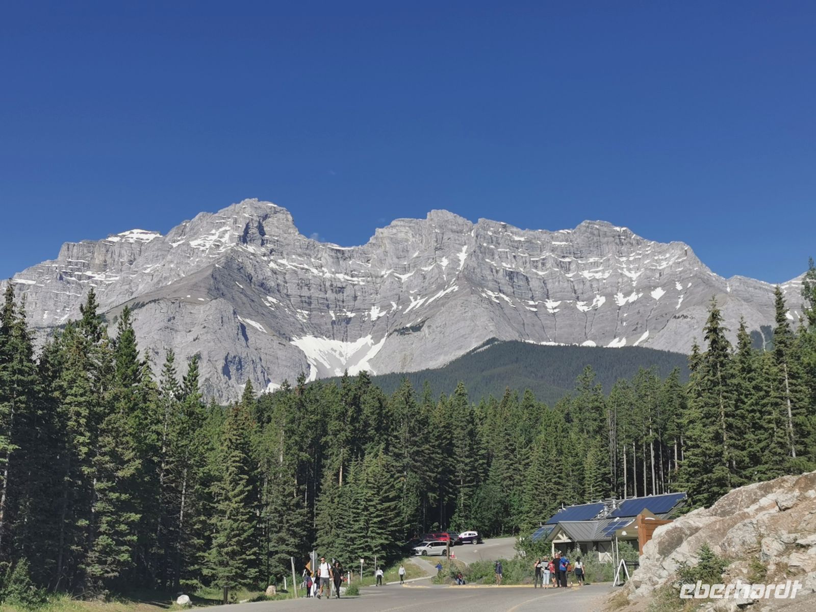 Nach einer kurzen Fahrt erreichen wir den Eingang zum Banff Nationalpark. Mit seinen 6.641 km² ist er zwar nicht der größte Kanadas, aber der mit Abstand beliebteste, sowohl bei den Einheimischen, als auch bei ausländischen Gästen. Im Winter kommen hier vor allem die Skifahrer her und im Sommer laden Wasserfälle und Seen zum Wandern ein. Dieser wundervolle Park ist der älteste Kanadas und der einzige, in dem eine Stadt wie Banff liegt.
