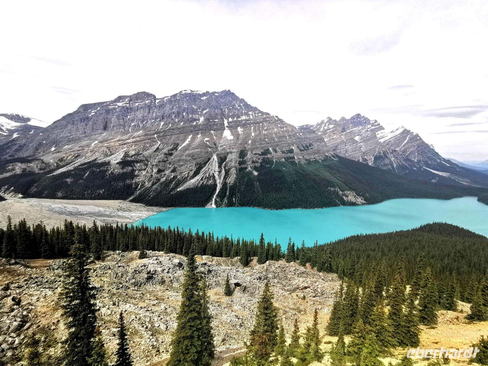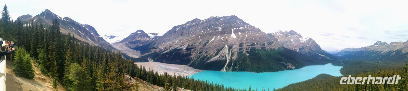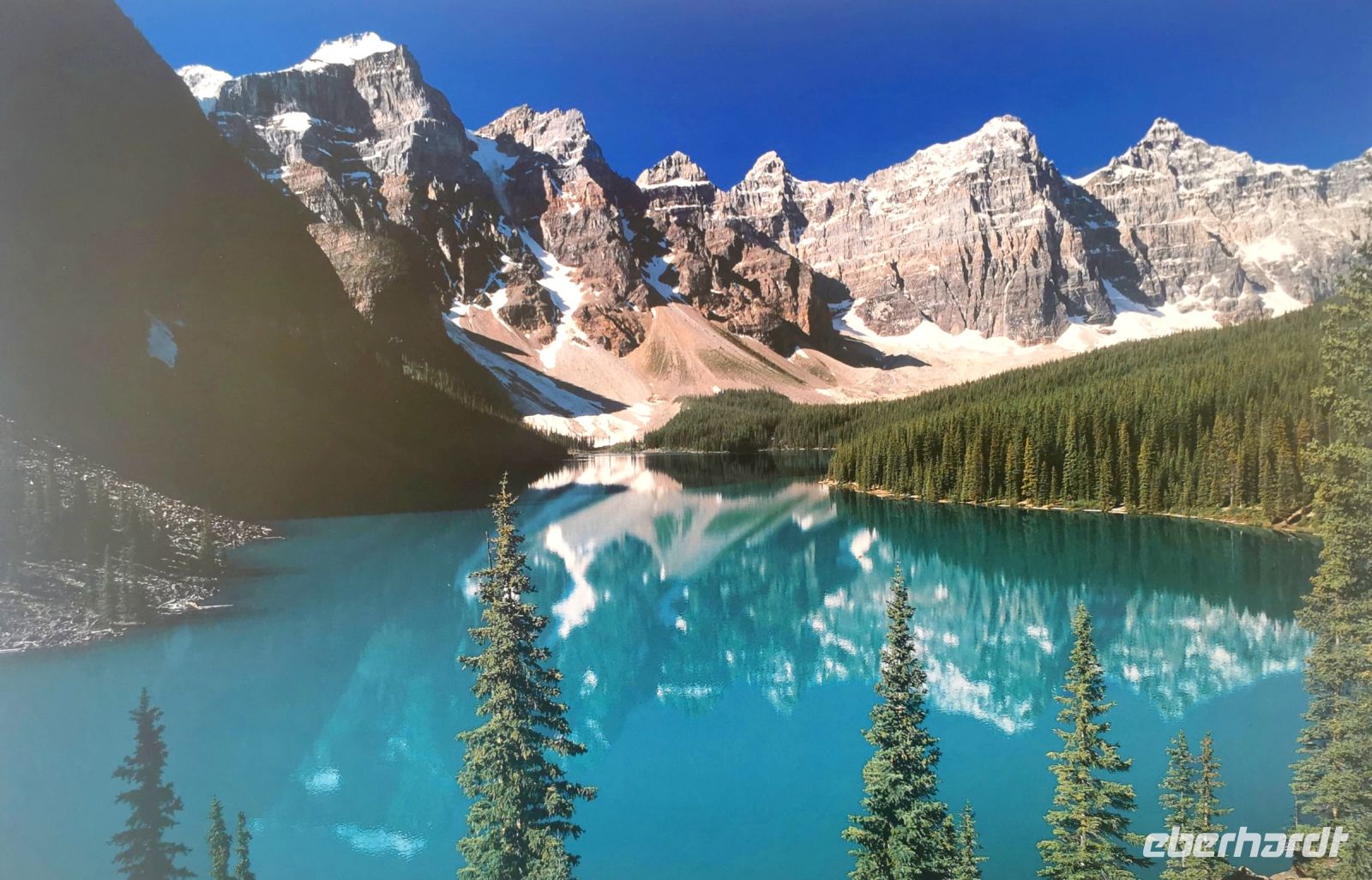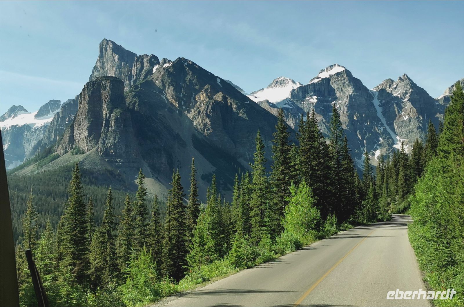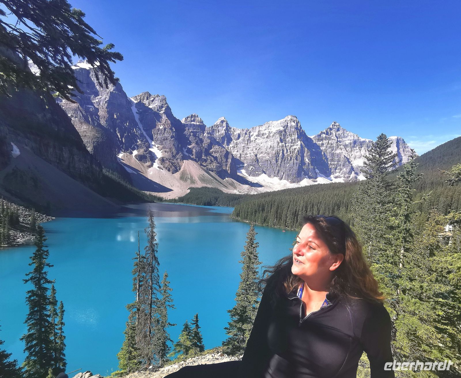 Erneut dürfen wir im Sage Bistro frühstücken und der Himmel ist azurblau wie gestern Morgen. So sind wir voller Erwartung auf den Gletscher. Unseren ersten Halt machen wir am Morraine Lake, wir steigen Stufen den Berg hinauf und was uns oben erwartet, ist atemberaubend. Mitten in der Bergkulisse liegt ein tief türkisfarbener See, dahinter die riesigen Berge mit etwas Schnee oben drauf, im Wasser spiegelt sich alles nochmals und der Himmel ist azurblau. Wir sind verzaubert und wollen alle ein Porträt vor dieser Kulisse haben.