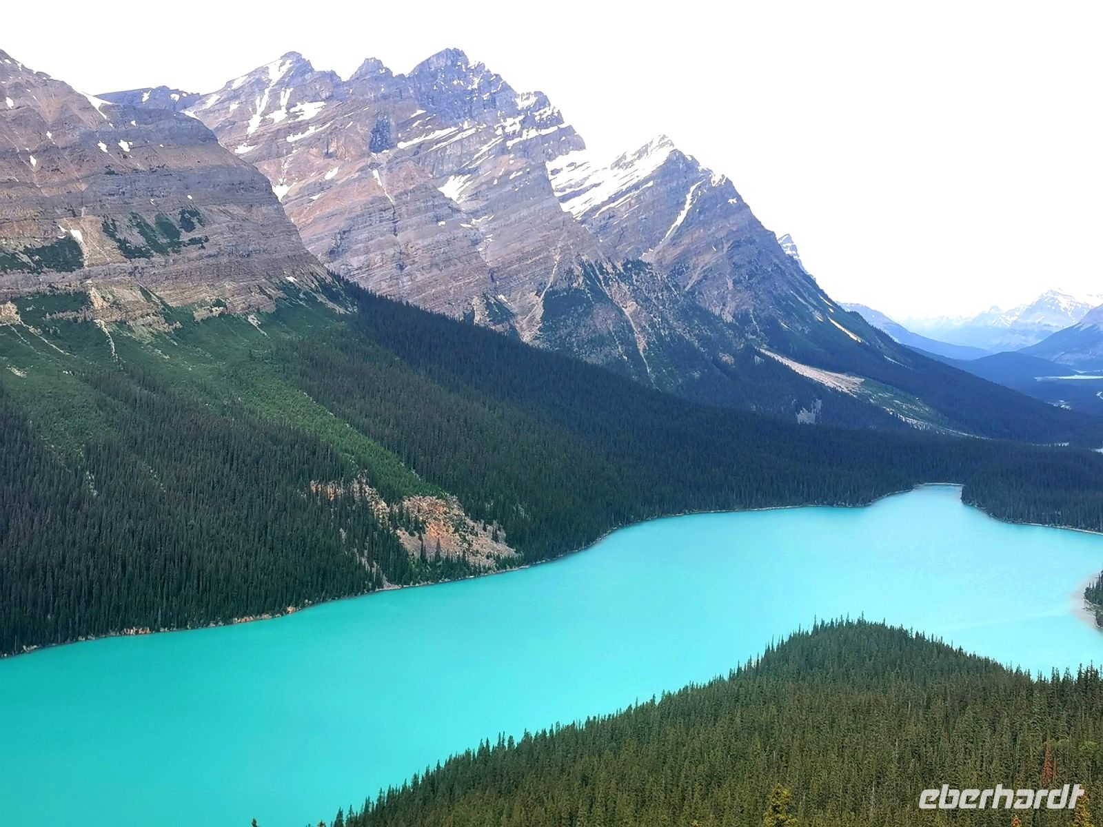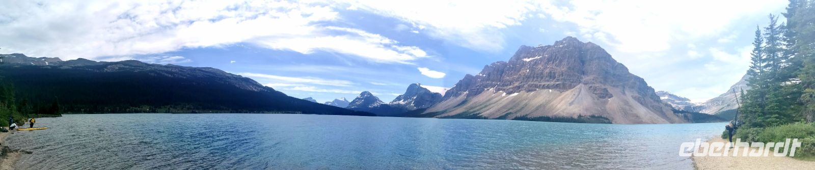 Die nächsten Seen, die wir besuchen, sind der Bow Lake und der Peyto Lake, wiederum sehen wir türkisfarbenes Wasser und majestätische Berge im Hintergrund. Wir können uns gar nicht satt sehen und hätten gern eine Woche zum Wandern Zeit. Als wir wieder in den Bus steigen, ertönt der Ruf: Ein Bär, ein Bär! Und tatsächlich, oben am Hang schaut ein Schwarzbär auf uns herab, findet unser Motorengeräusch nicht schön und verschwindet ganz schnell wieder zwischen den Bäumen.