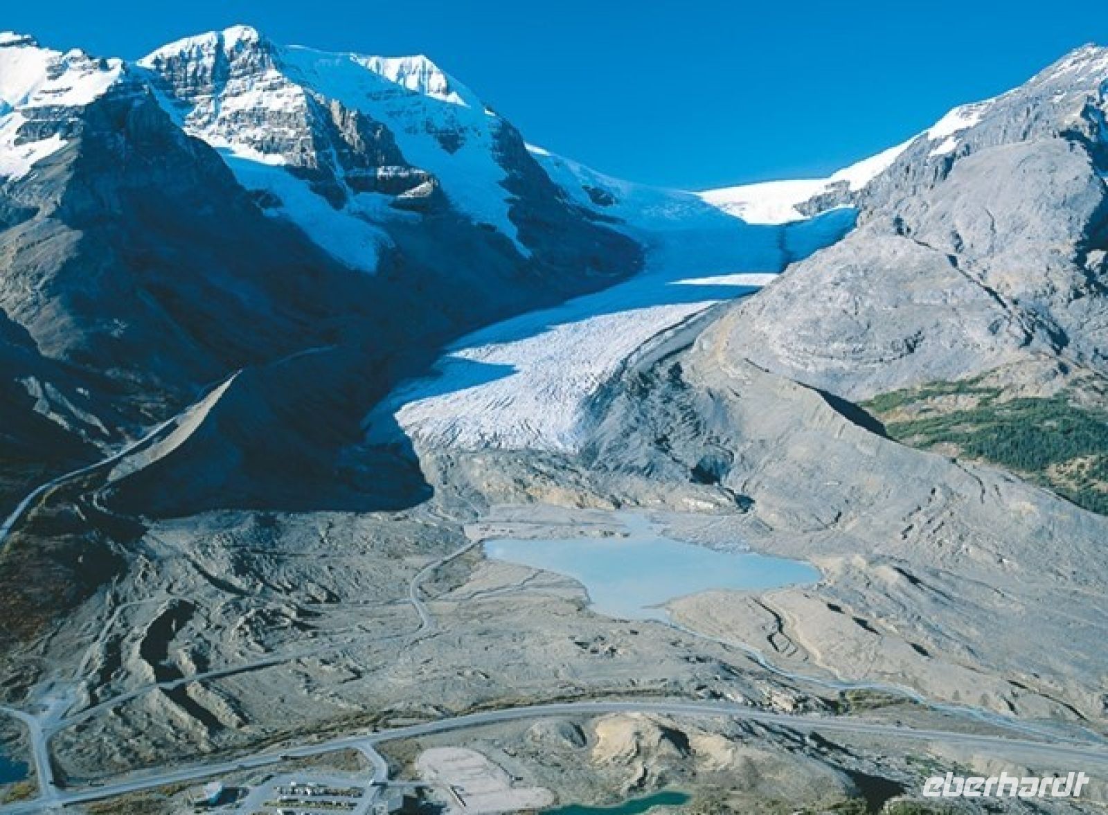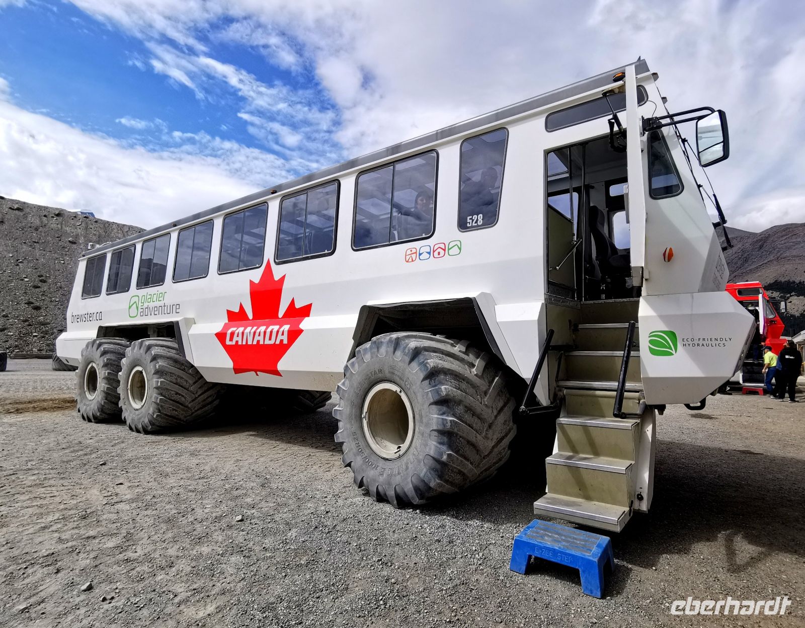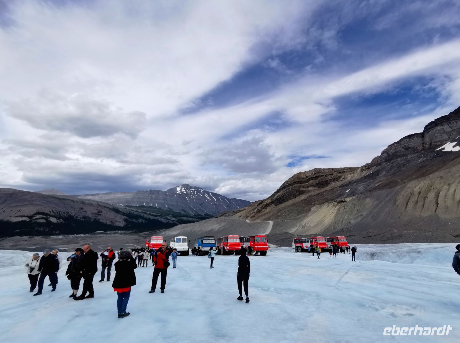 Beim Columbia Ice Field, unserem nächsten Ziel, stehen wir zuerst fasziniert auf der Aussichtsterrasse und blicken auf den Gletscher, der die größte Ansammlung von Eis südlich des Polarkreises ist. Das Eis dehnt sich über eine Fläche von 325 km² aus, ist zwischen 100 bis 365 Metern dick und jährlich fallen hier bis zu sieben Metern Schnee. Aus diesem Eisfeld sind acht große Gletscher entstanden, von denen wir vor allem den Athabasca- und den Columbiagletscher sehen. In dieser Umgebung stehen auch die höchsten Berge der kanadischen Rocky Mountains. Aus diesem Eisfeld entstehen mehrere Flüsse wie der Athabasca und der North Saskatchewan River.