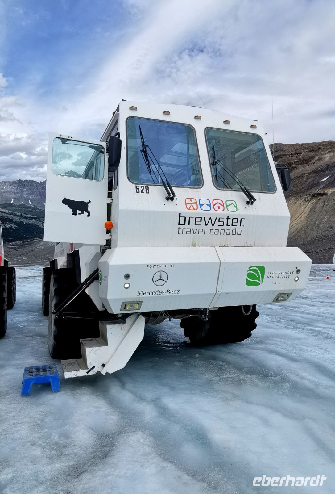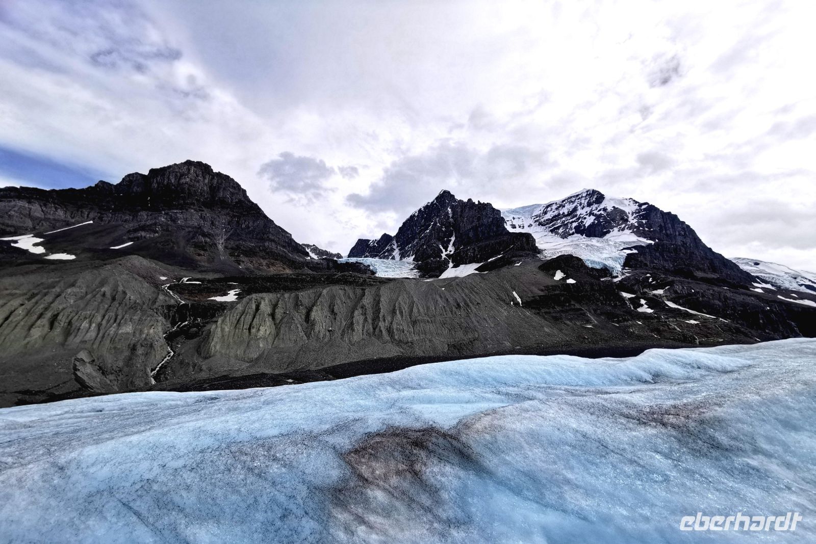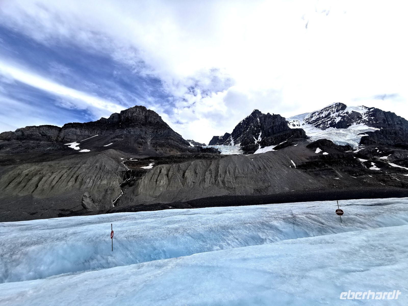 Beim Columbia Ice Field, unserem nächsten Ziel, stehen wir zuerst fasziniert auf der Aussichtsterrasse und blicken auf den Gletscher, der die größte Ansammlung von Eis südlich des Polarkreises ist. Das Eis dehnt sich über eine Fläche von 325 km² aus, ist zwischen 100 bis 365 Metern dick und jährlich fallen hier bis zu sieben Metern Schnee. Aus diesem Eisfeld sind acht große Gletscher entstanden, von denen wir vor allem den Athabasca- und den Columbiagletscher sehen. In dieser Umgebung stehen auch die höchsten Berge der kanadischen Rocky Mountains. Aus diesem Eisfeld entstehen mehrere Flüsse wie der Athabasca und der North Saskatchewan River.