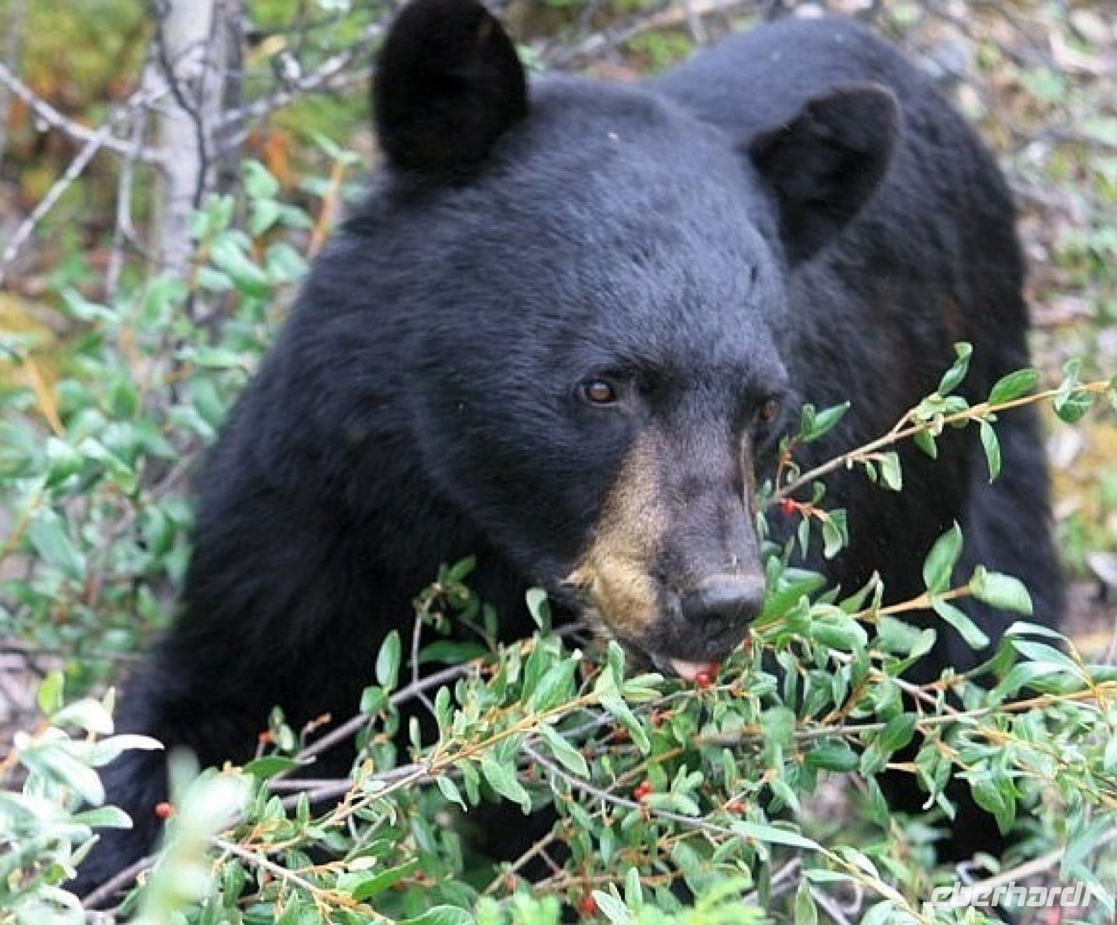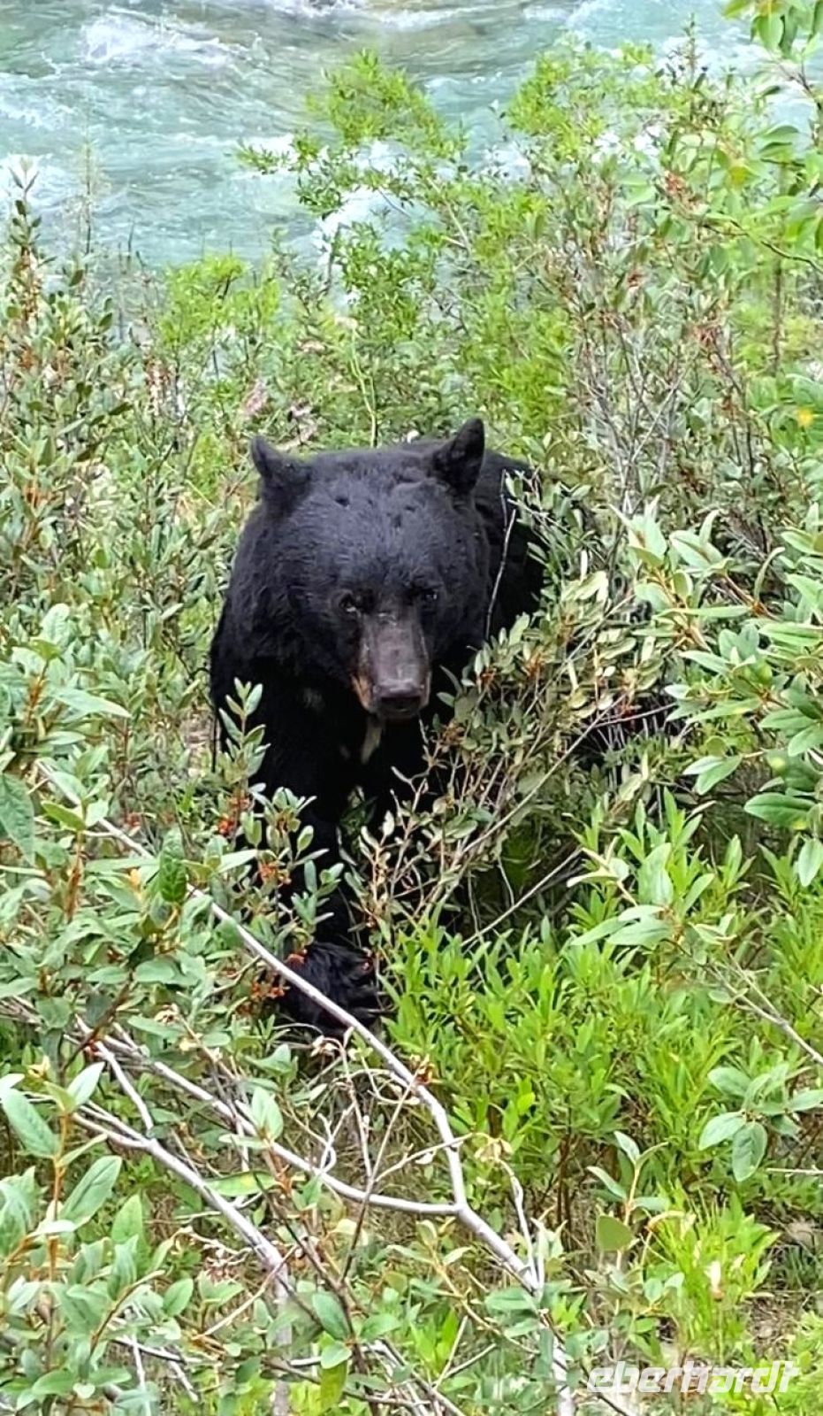 Noch nicht richtig am See angekommen läuft auf der anderen Straßenseite ein Schwarzbär neben uns her, auch er ist mit seiner Lieblingsbeschäftigung abgelenkt: dem Fressen. Wir denken an keinen See und keine Ausflüge mehr und beobachten die Bären, als ob wir auf Safari wären.