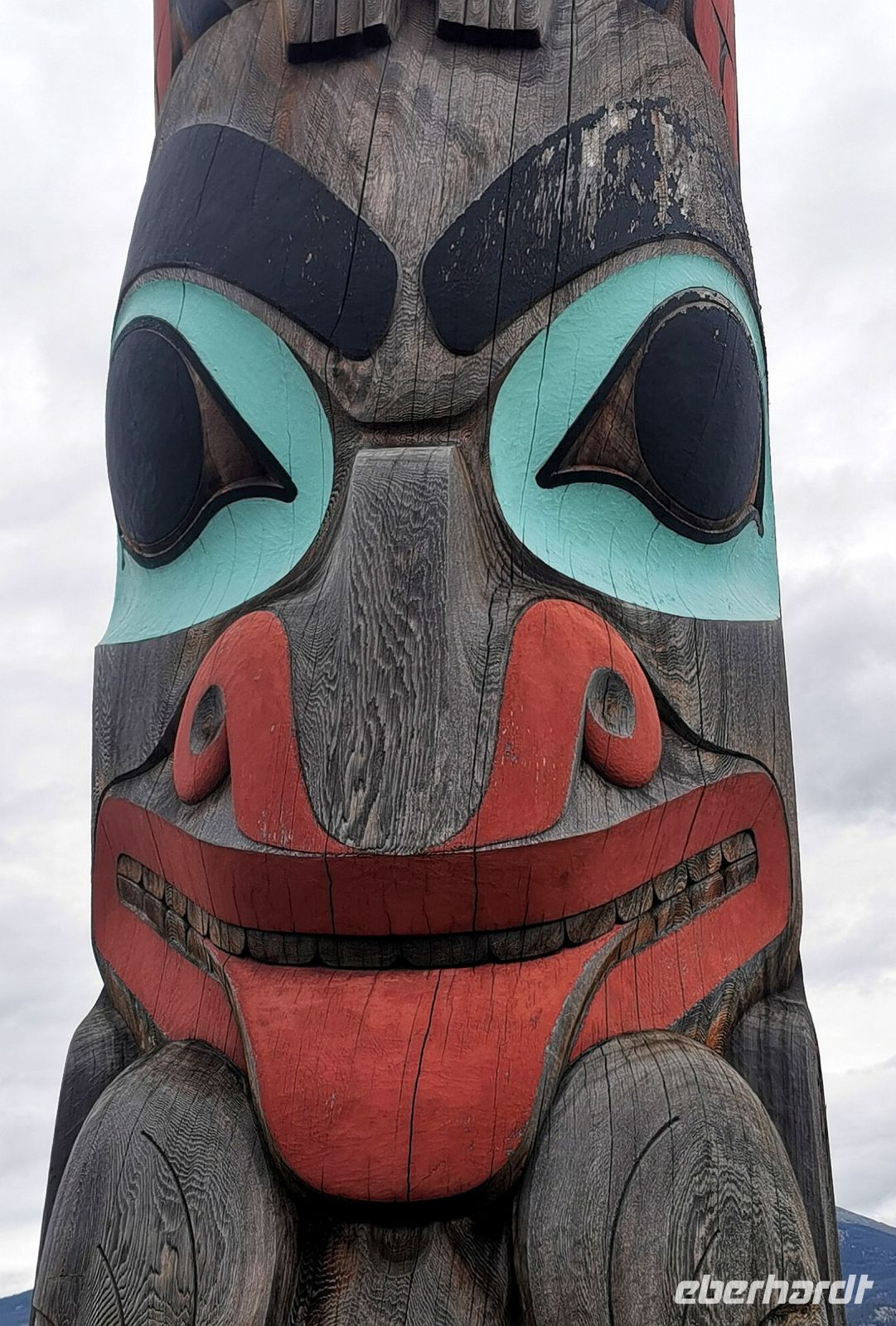 An einem Besucherzentrum stehen mehrere verschiedene Totempfähle. Diese monumentalen Skulpturen wurden von Indianern aus einem Baumstamm geschnitzt und anschließend bemalt. Sie haben keine religiöse Bedeutung und wurden immer im Zusammenhang mit einem Potlatch (Fest) verbunden, bei dem die Stellung der Familie in der sozialen Hierarchie des jeweiligen Stammes bestätigt wurde. Beim Verlassen des Parkes fahren wir an Zedern vorbei, die Stammdurchmesser von mehreren Metern haben und teilweise bis zu 1.000 Jahre alt sind.