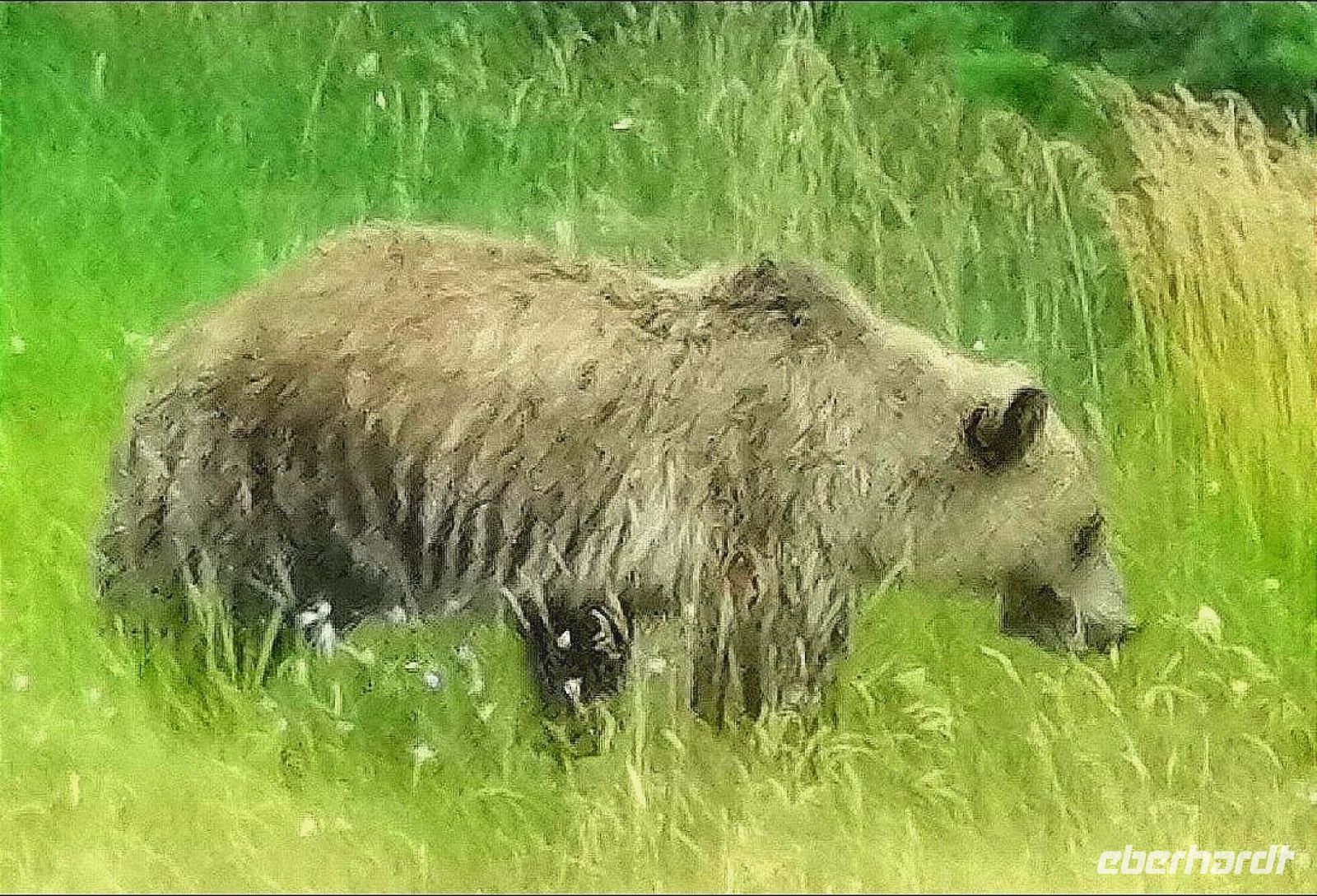 Unser Abendessen genießen wir wieder gemeinsam im Restaurant des Becker Chalets und was erblicken wir wieder? Richtig: einen Bären. Diesmal ist es ein Grizzly, der am Hang vor dem Restaurant entlang zieht.