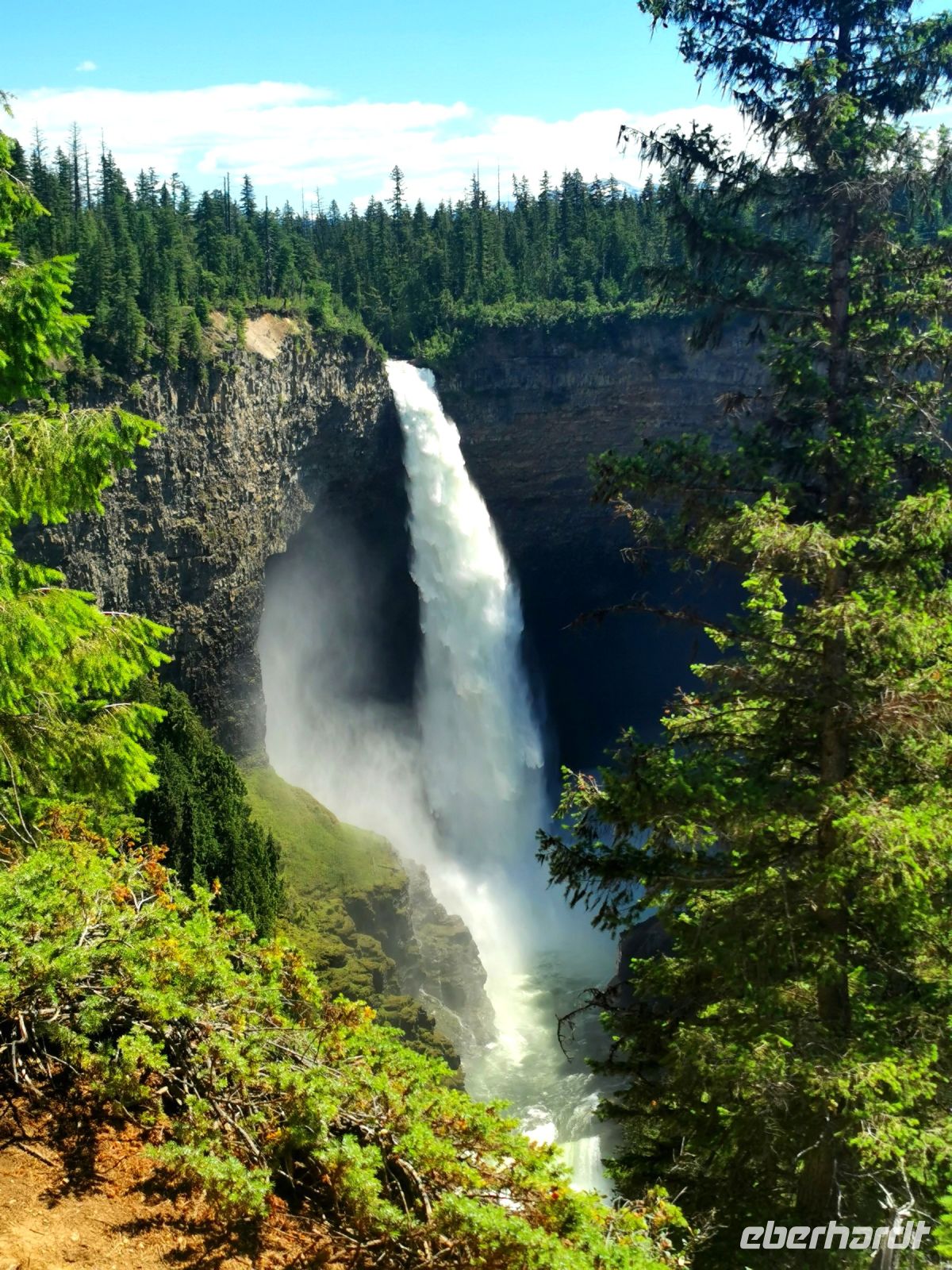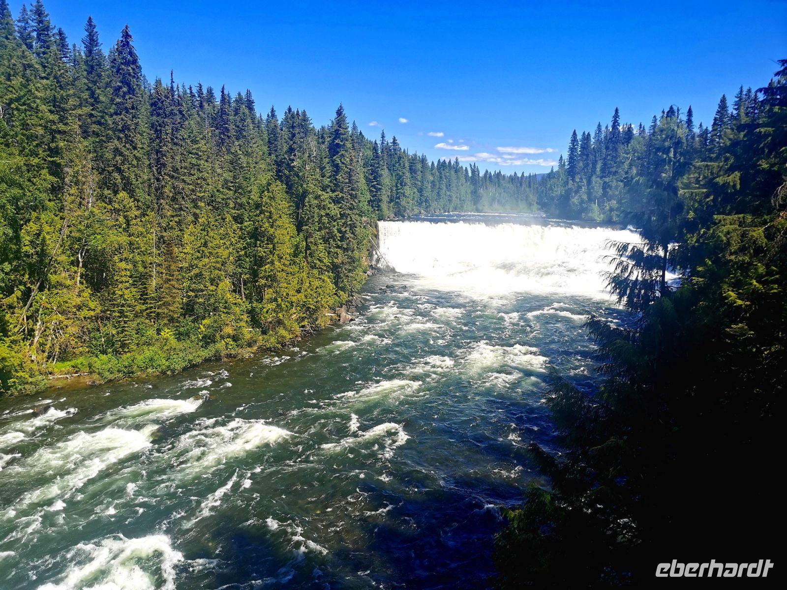 Jetzt beschließen wir, von der geplanten Route etwas abzuweichen und einen Umweg zum Helmcken Wasserfall zu machen. Kurz bevor der Murtle River in den Clearwater River mündet, fällt er vom Plateau 141 Meter in die Tiefe. Obwohl wir schon einige Wasserfälle auf unserer Reise gesehen haben, ist dieser hier wieder ganz besonders. Er fällt gerade und tosend in eine Schlucht hinab und ist nach dem deutschstämmigen Arzt Johann Sebastian Helmcken benannt, der das Land im Auftrag der Hudsons Bay Company erschließen sollte.