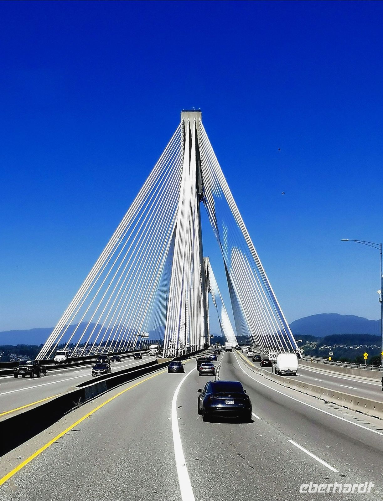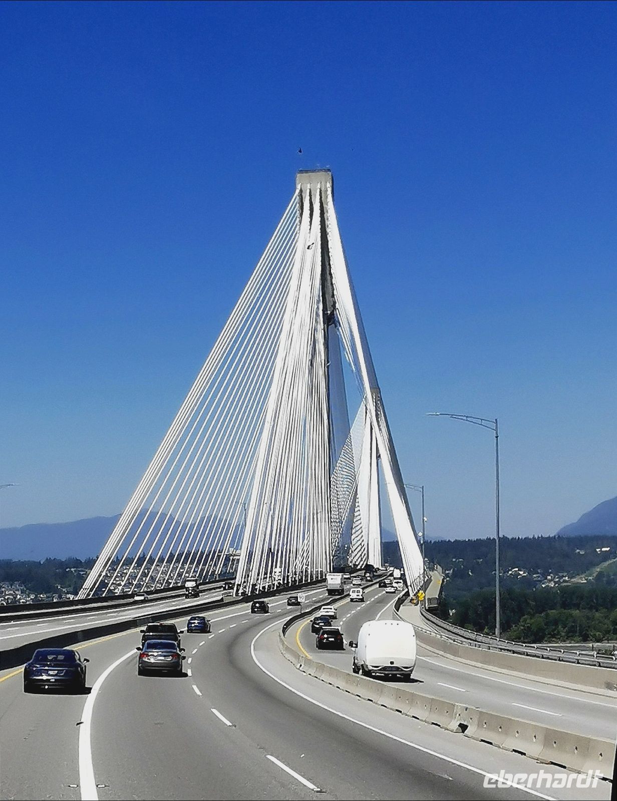 Nach der Stärkung fahren wir weiter und passieren am frühen Nachmittag die imposante Golden Ears Brücke nach Vancouver. Diese Metropole erstreckt sich in unvergleichlicher Lage zwischen den zerklüfteten Bergen der Coast Mountains und dem Pazifik. In die USA sind es nur wenige Kilometer zu fahren. 2,4 Millionen Einwohner leben mittlerweile in und um die Stadt, das sind rund die Hälfte der Einwohner von ganz British Columbia. Wolkenkratzer, weitläufige Parks mit uralten riesigen Zedernbäumen und Hafenanlagen wechseln sich ab.