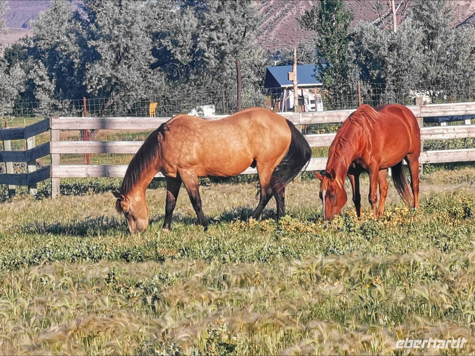 Unser Morgen am Thompson River in unserer Ranch beginnt mit dem Gezwitscher der Vögel und wir sehen die Pferde auf der Weide grasen. Leider sind die Alpakas von gestern nirgends zu sehen.
