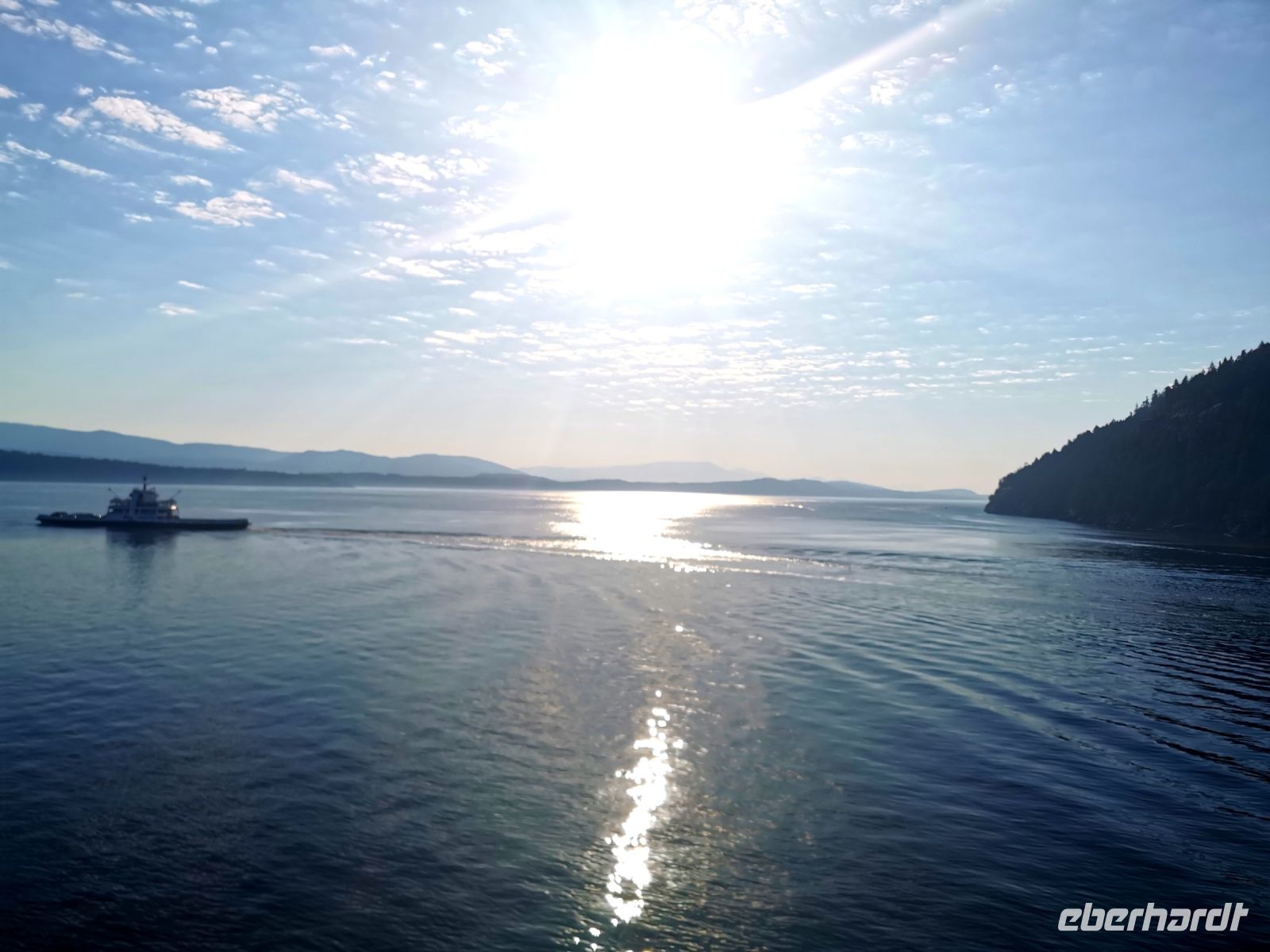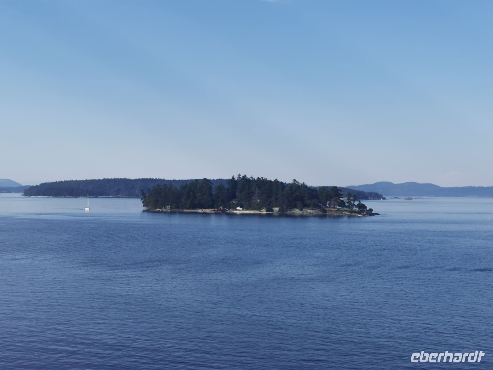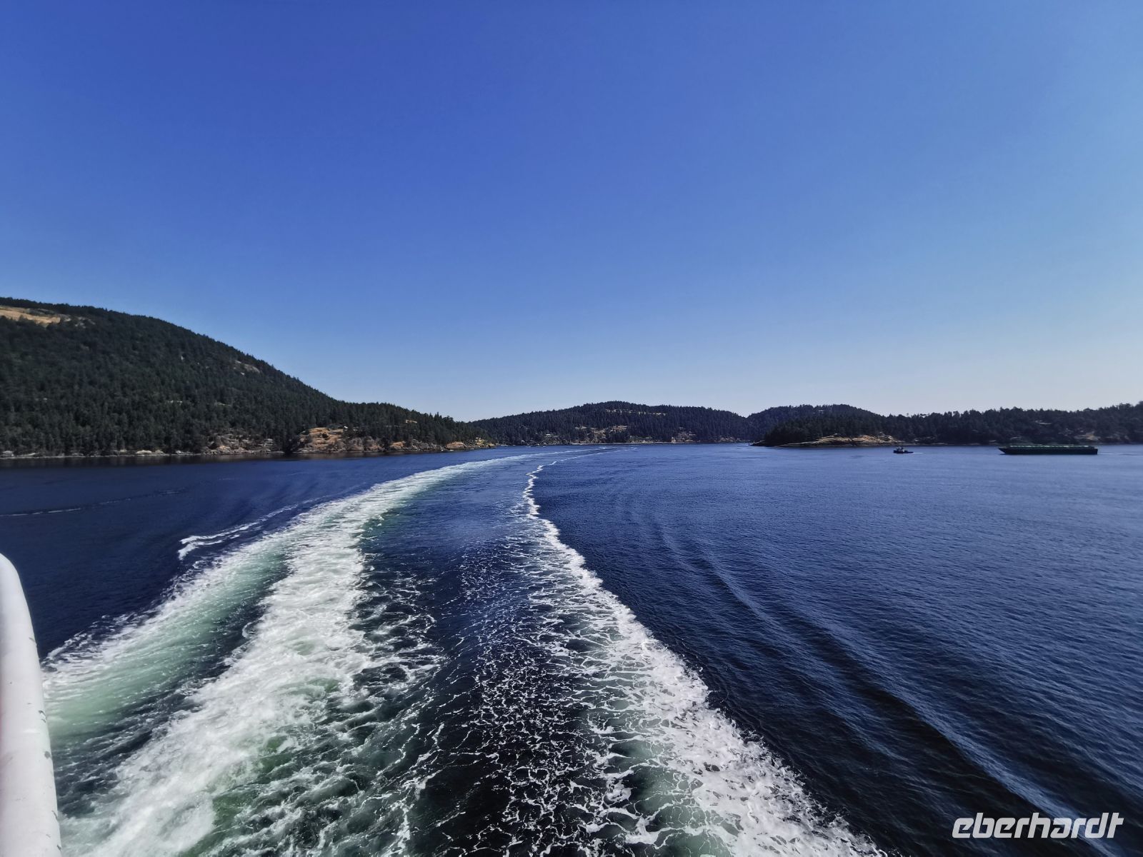 Die Überfahrt ist sehr entspannend. Wir können auf dem Außendeck die Sonne genießen und etliche kleine vorgelagerte Inseln ziehen an uns vorbei. Vancouver Island ist mit seinen 450 Kilometern Länge die größte Insel der amerikanischen Westküste und eines der wichtigsten Reiseziele ganz Kanadas. Im Inselinneren türmen sich schneebedeckte Gebirge auf, an deren Hängen Regenwälder wachsen. An der Küste wechseln sich Steilklippen und Sandstrände ab. 400 Vogelarten leben hier, Orkas sieht man häufig und Grauwale schwimmen von März bis Mai im pazifischen Ozean entlang.
