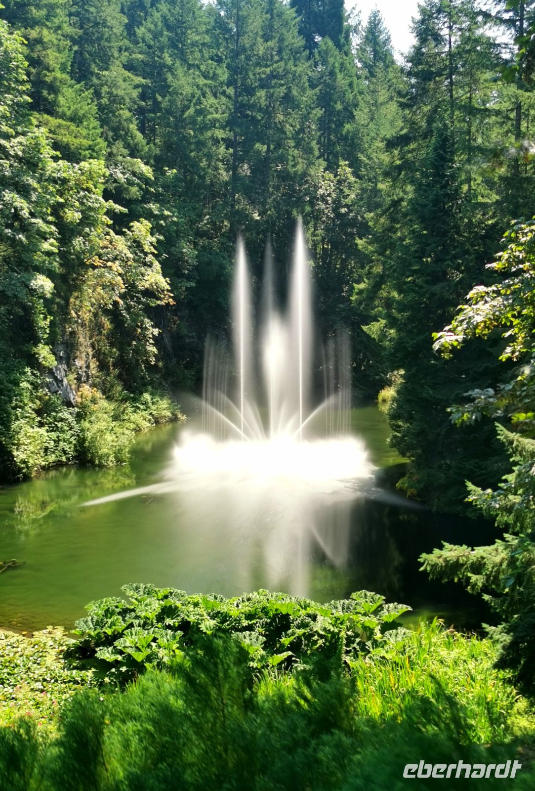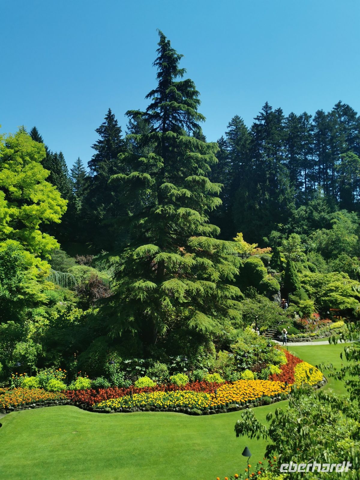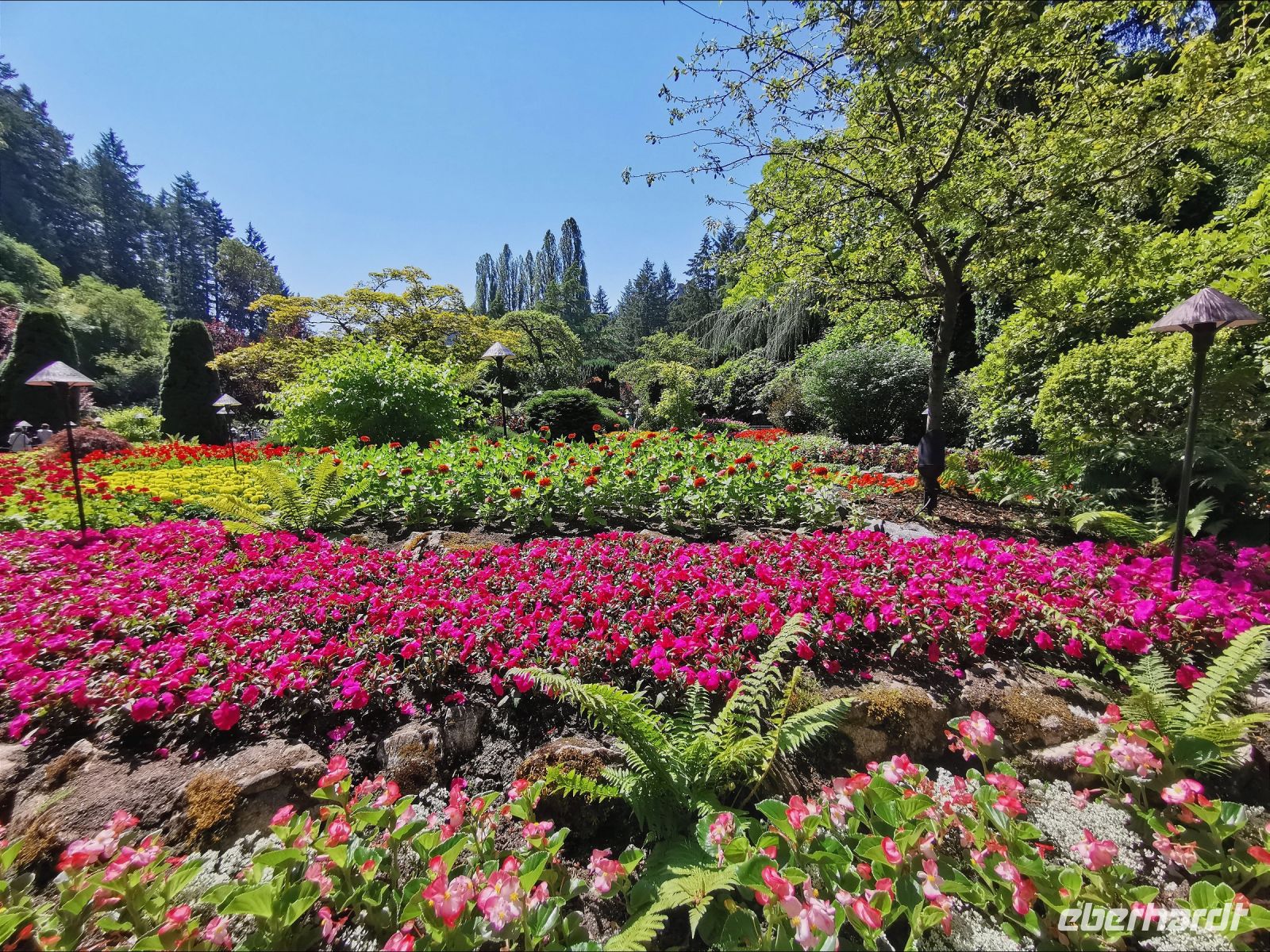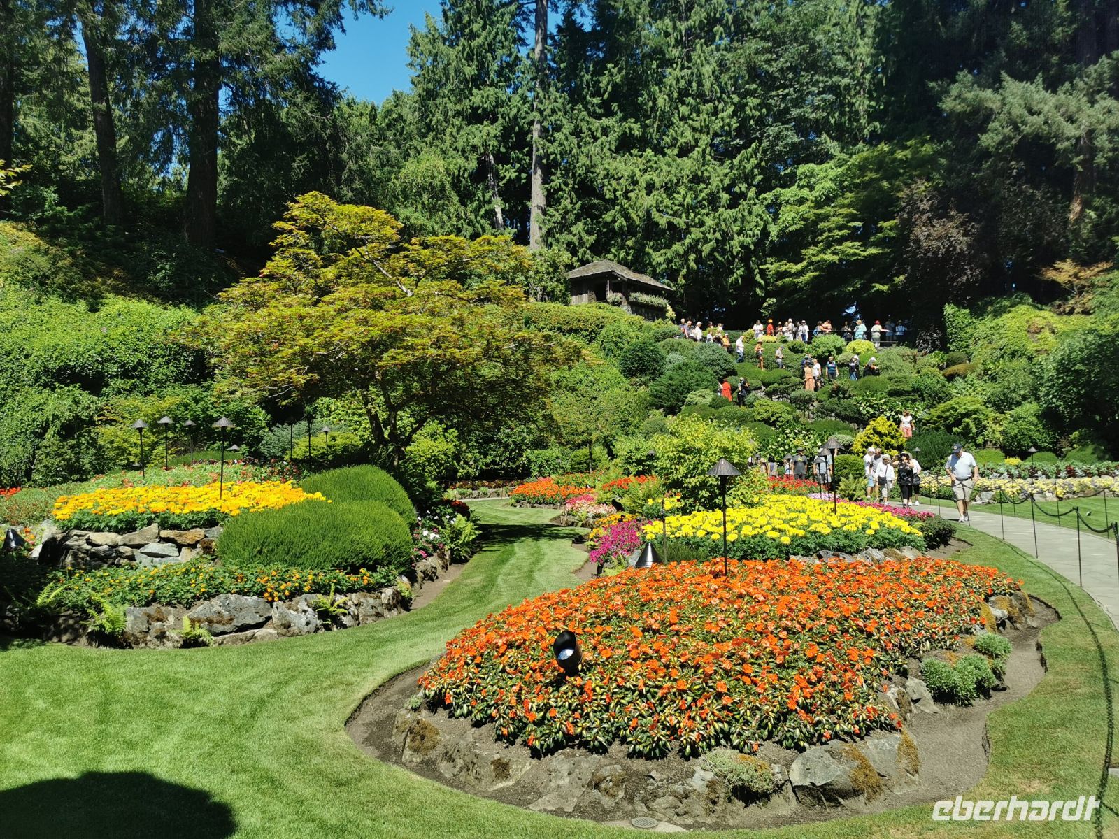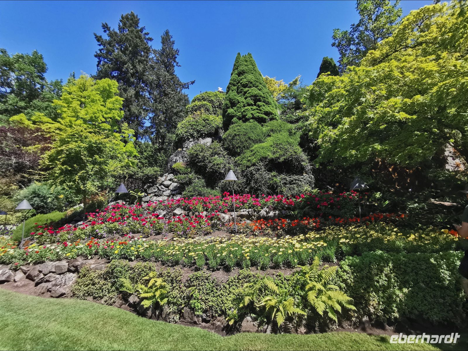 Wir besuchen zuerst den Butcharts Garden, einen 22 Hektar großen üppig mit Blumen bepflanzten Park im Süden des Eilandes. Er wurde bereits 1904 von Jennie Butchart angelegt, die damals den offen gelassenen Steinbruch verschönern wollte, den ihr Ehemann Robert betrieb. Er baute Kalkstein ab. Von 1907 bis 1912 unterstützte Jennie der japanische Landschaftsgestalter Isaburo Kishida und legte einen typisch japanischen Teil des Gartens an. Der Enkelsohn von Jennie Butchart übernahm 1939 die Verantwortung für die Anlage und deren Ausbau. Bis heute ist der Garten im Familienbesitz und wird von der Familie verwaltet.