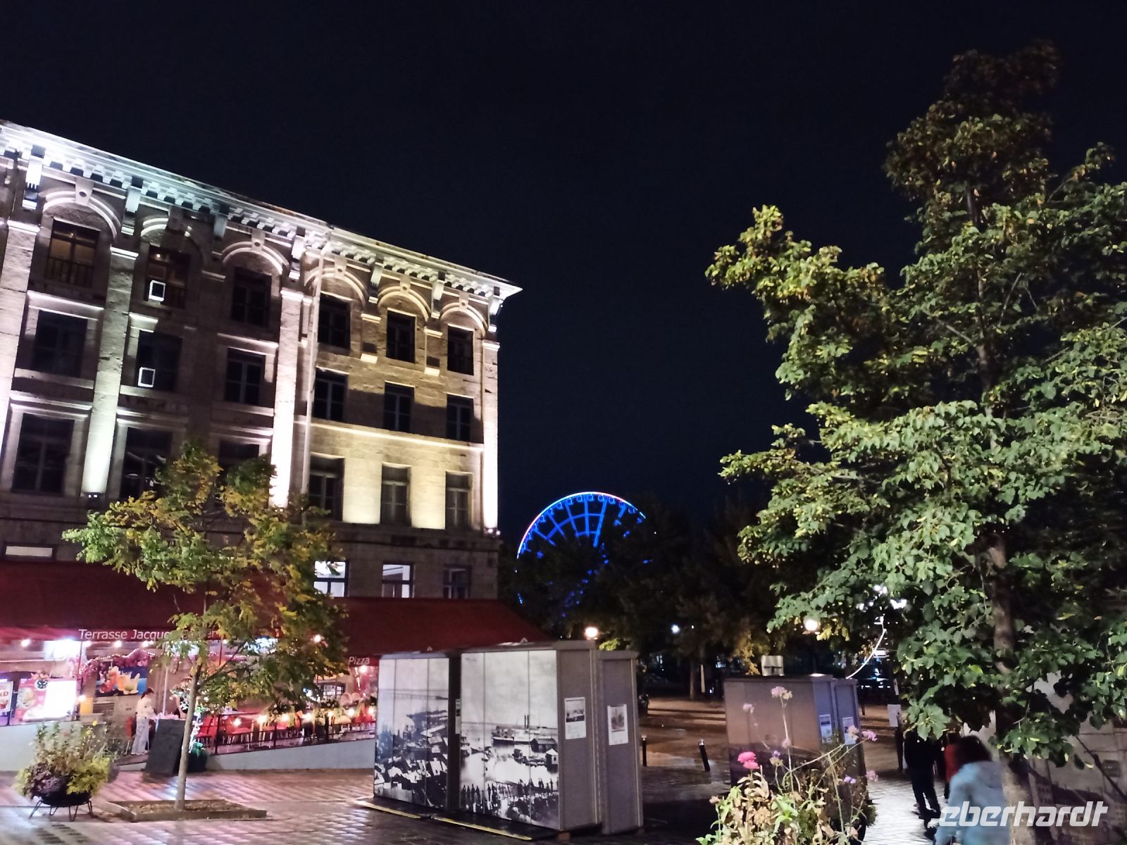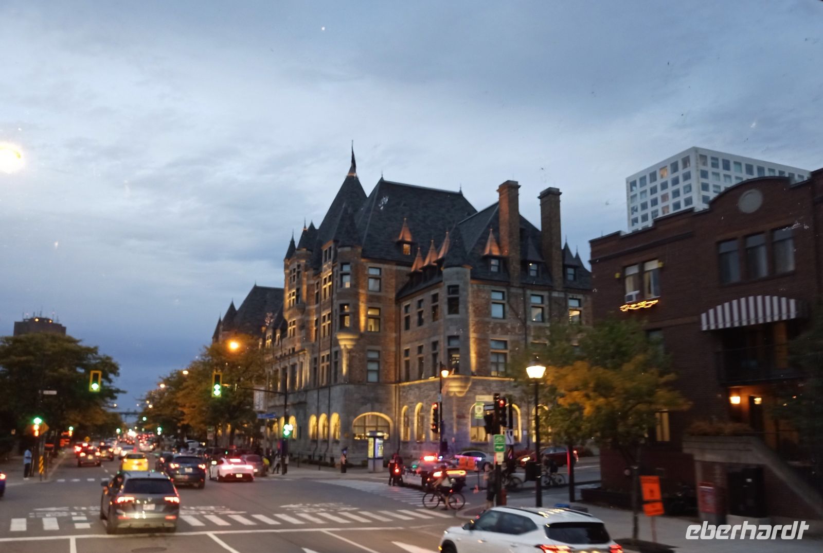 Der Bus steht schon bereit und Fahrer Fred bringt uns ins Le Nouvel Hotel. Nach einem kurzen CheckIn geht es mit dem Bus gleich weiter durch das abendliche Montreal zu unserem ersten Abendessen in einem urigen Restaurant „Vieux – Port Steakhouse“ mitten in der City. Mit einer leckeren Vorspeise, Steak oder Lachs zu Hauptgang und schokoladigen Dessert beenden wir den langen Tag. Auf dem Rückweg ins Hotel bewundern wir noch die abendliche Kulisse von Montreal durch Fensterscheiben, die durch Regentropfen das Bild verzerren.