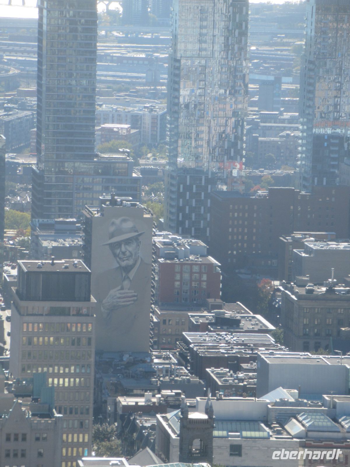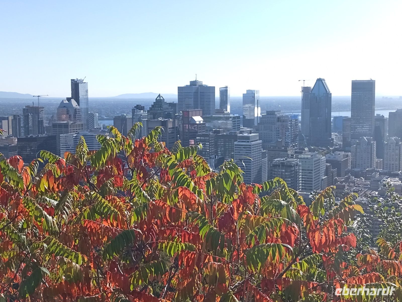 Wir genießen also grüne Lunge der Stadt den Park Mont Royal und machen einen erfrischenden Spaziergang zu dem Aussichtspunkt der Stadt. Die herbstlichen Farben unterstreichen mit roten Tönen den Ausblick auf die Silhouette der Stadt. Etwas entfernt erkennen wir auch den „schiefen Turm“ des Olympia Stadions, das Wandportrait des berühmten Sänger Leonard Cohen, aber auch den blauen Streifen des St. Lorenz Strom am Horizont.