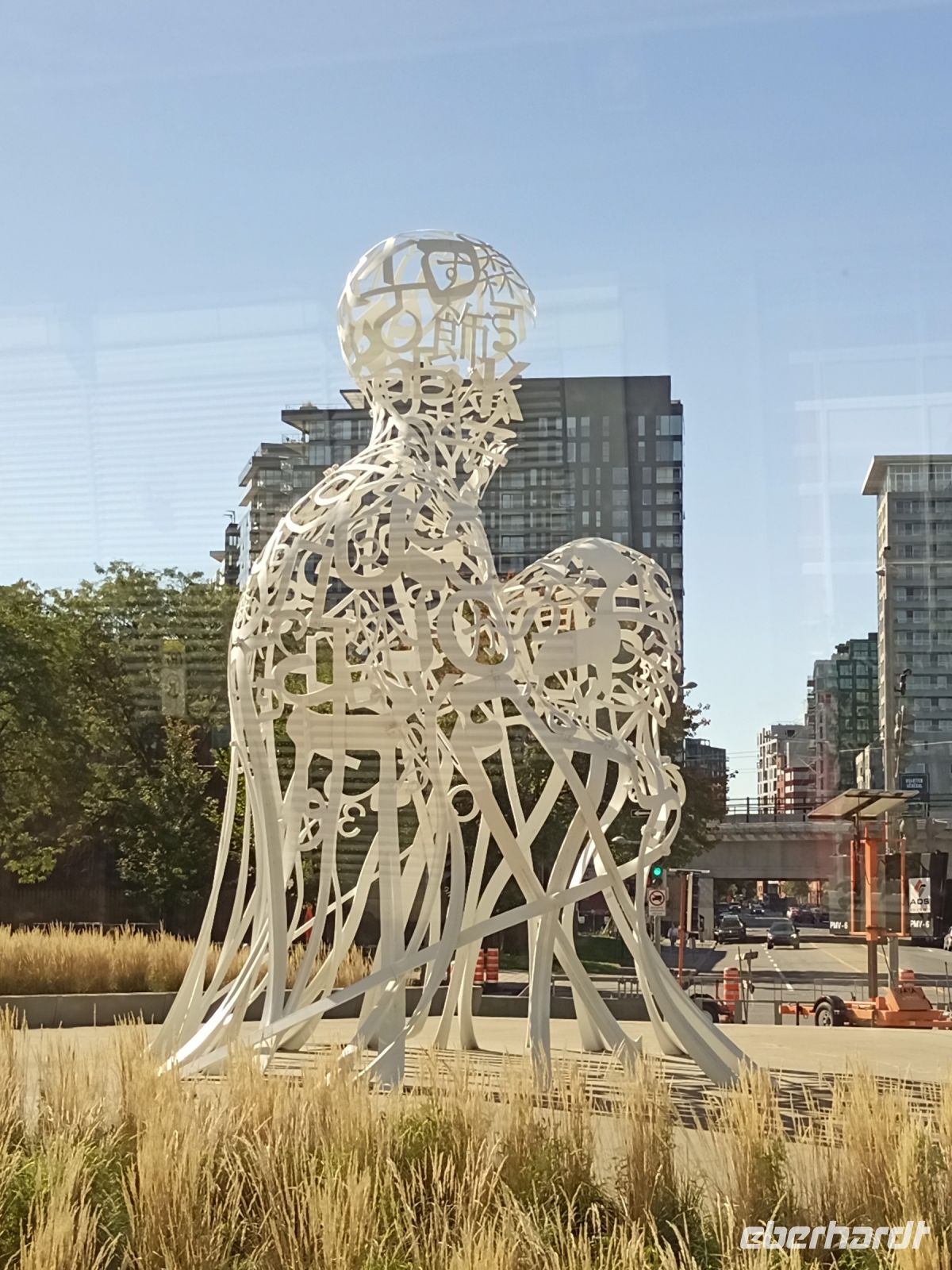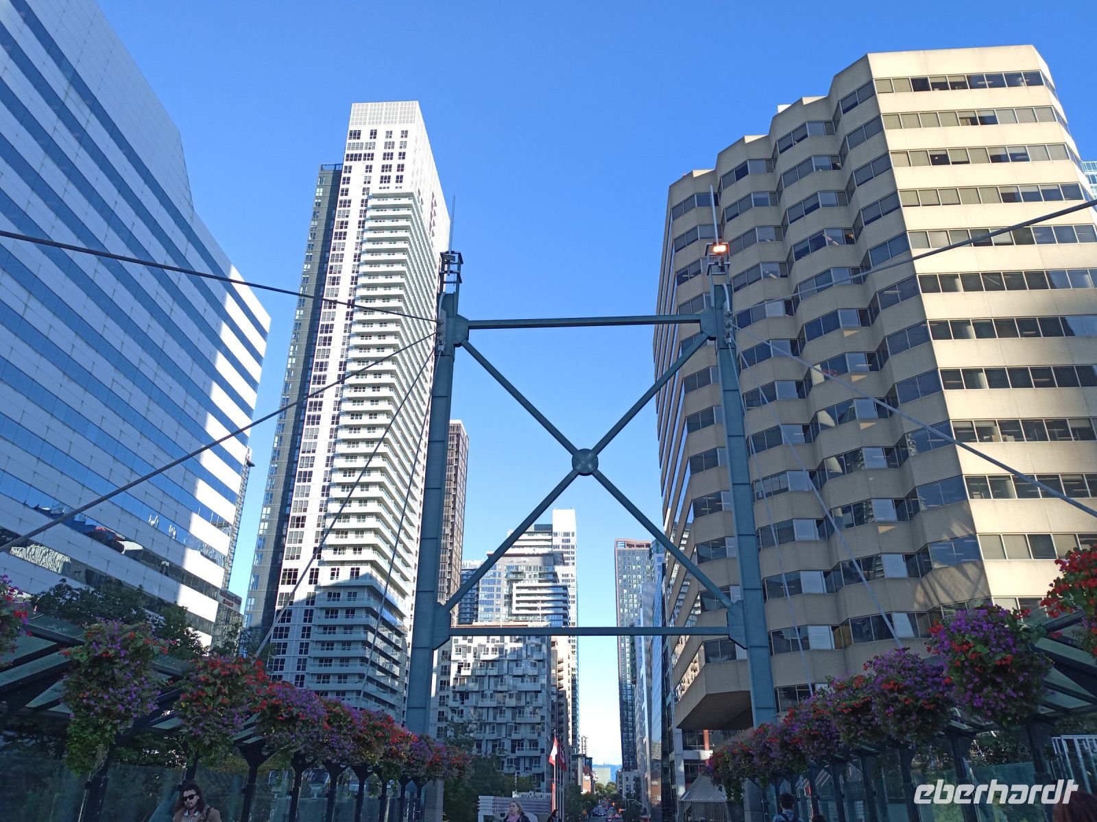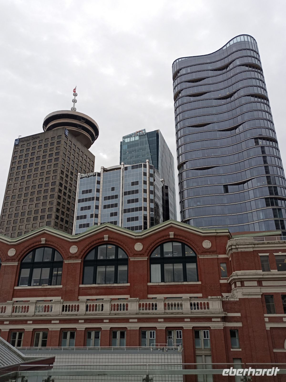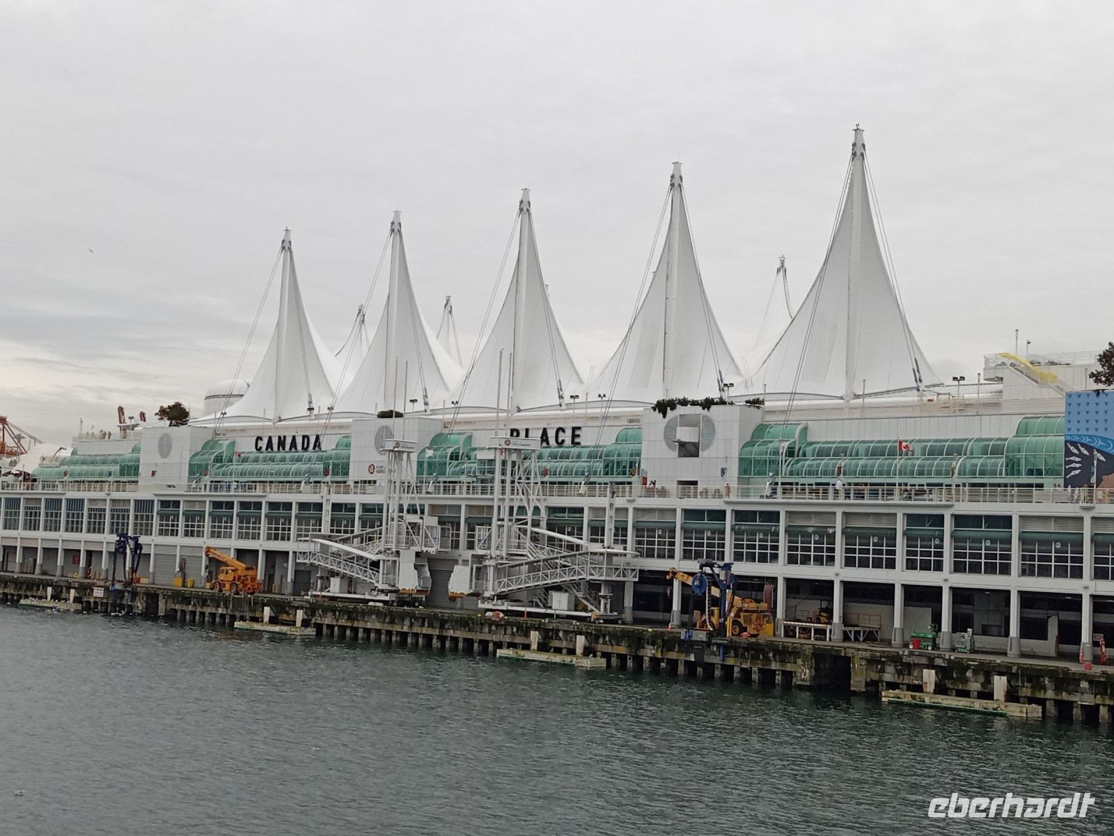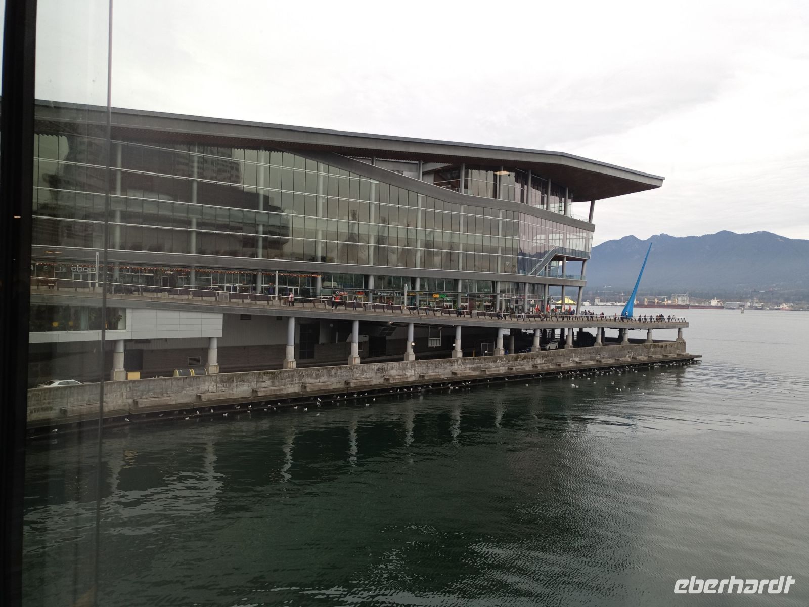 Wir kommen langsam zu Waterfront. Hier eröffnet sich das berühmte Vancouver Panorama von Canada Place mit dem maritimen Segeldach – daneben ist das große Vancouver Convention Centre. Wir gehen durch das Centre durch und bewundern die Architektur und moderne Kunst, die hier geschmackvoll installiert ist. Zwischen den zwei Gebäuden sind auf dem Plateau Plätze zum Verweilen, mit schönen Aussichten