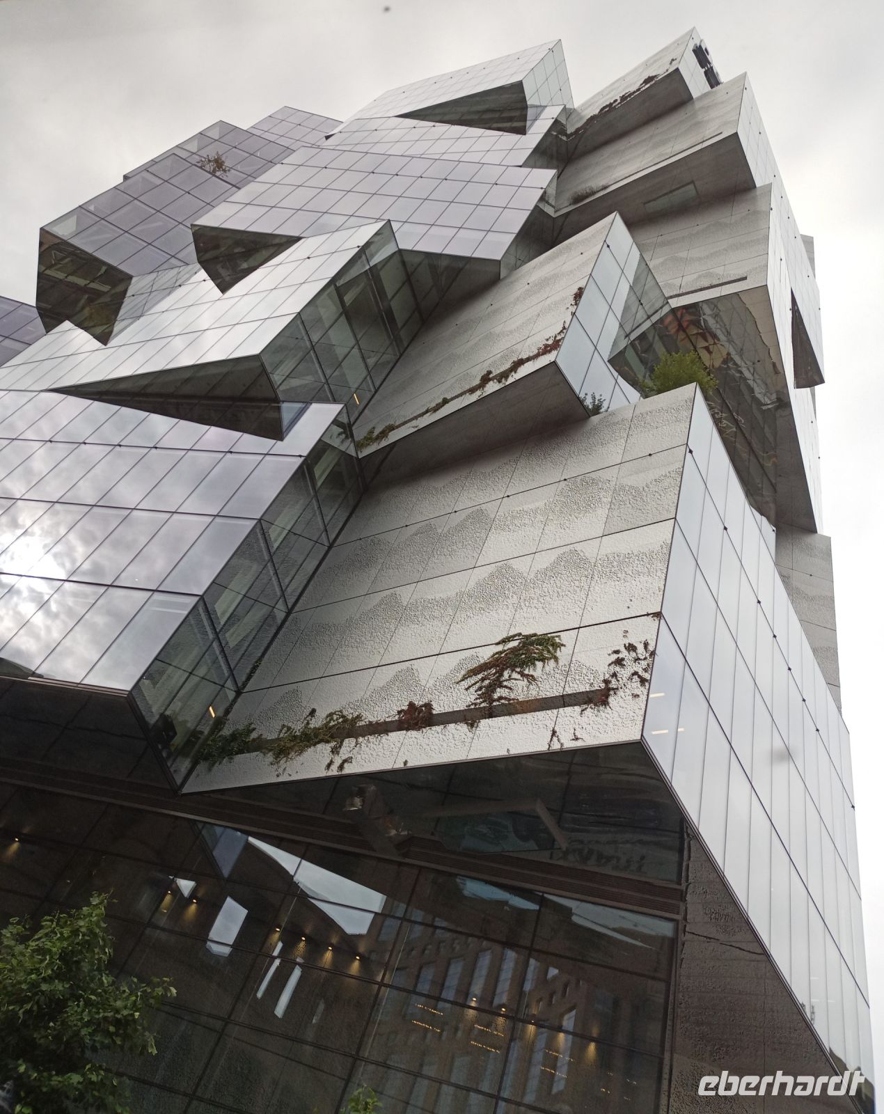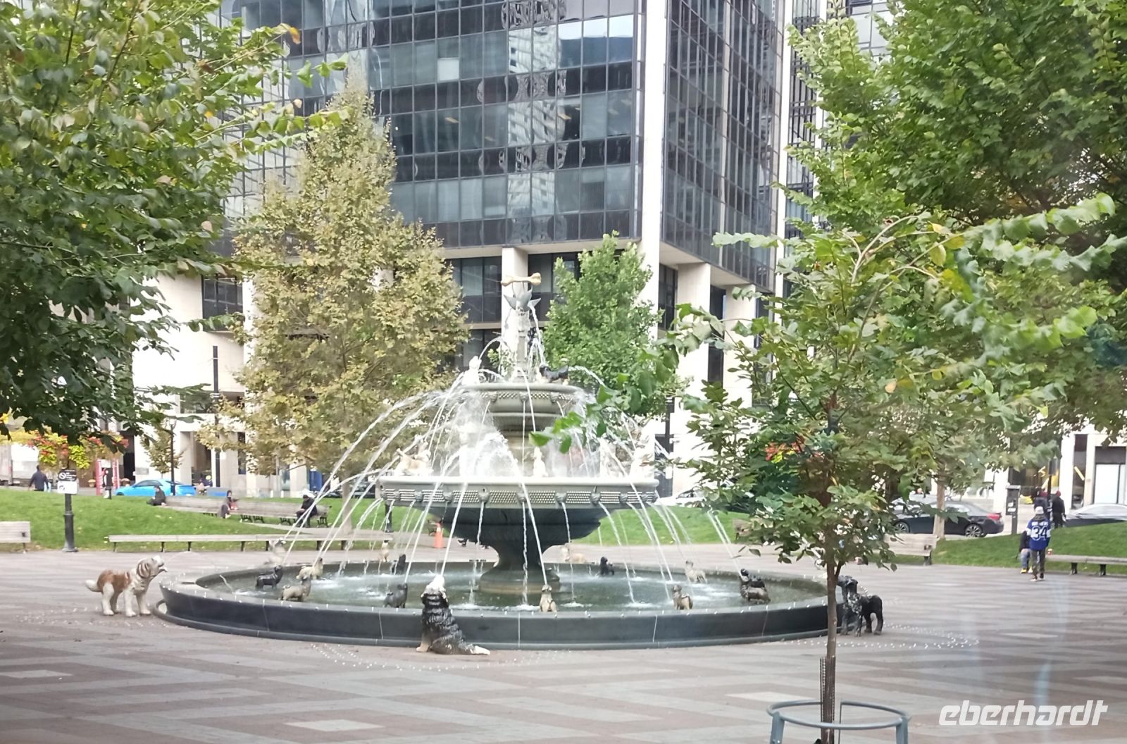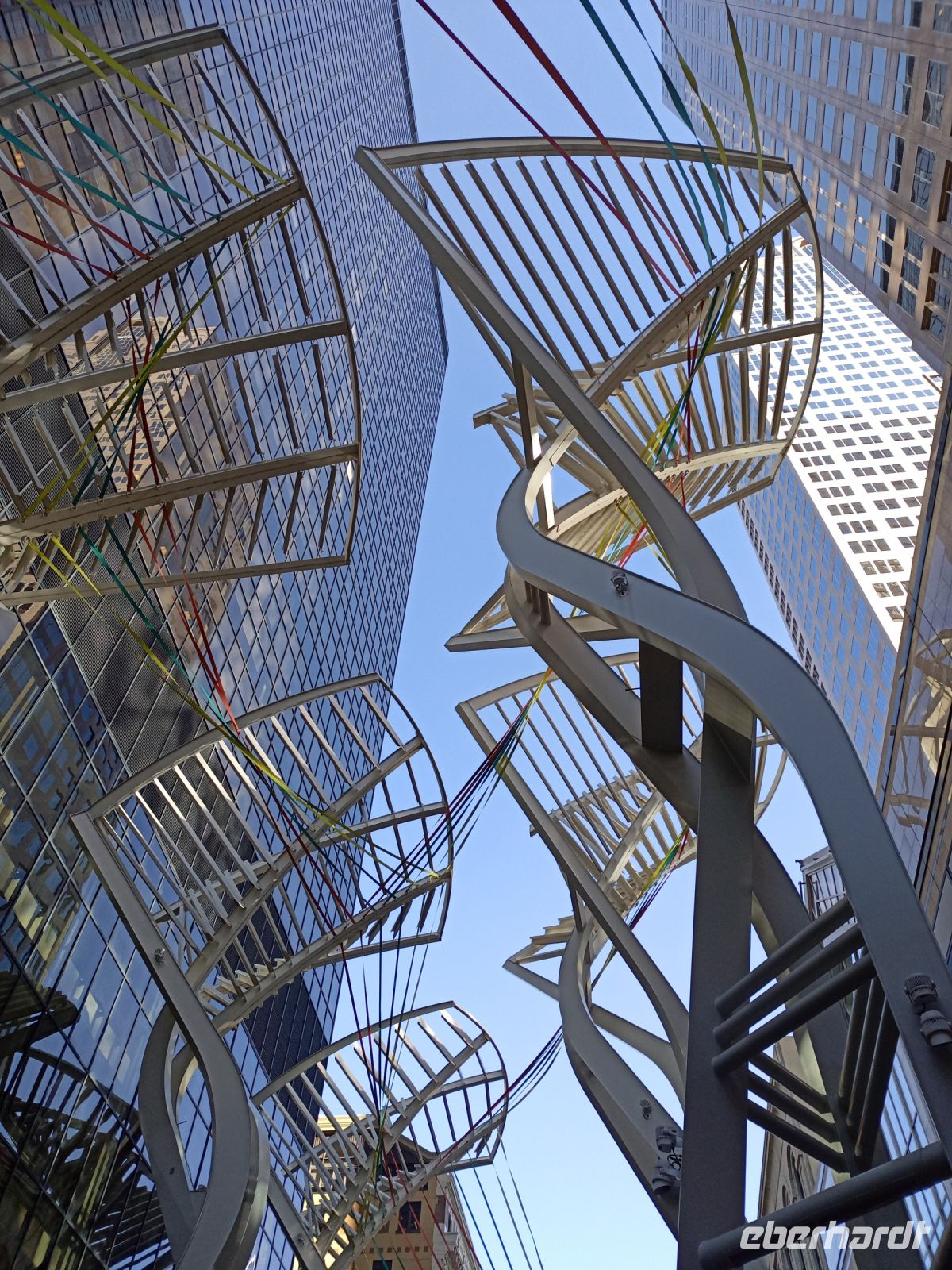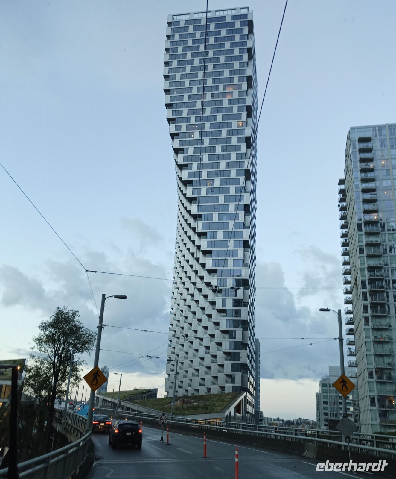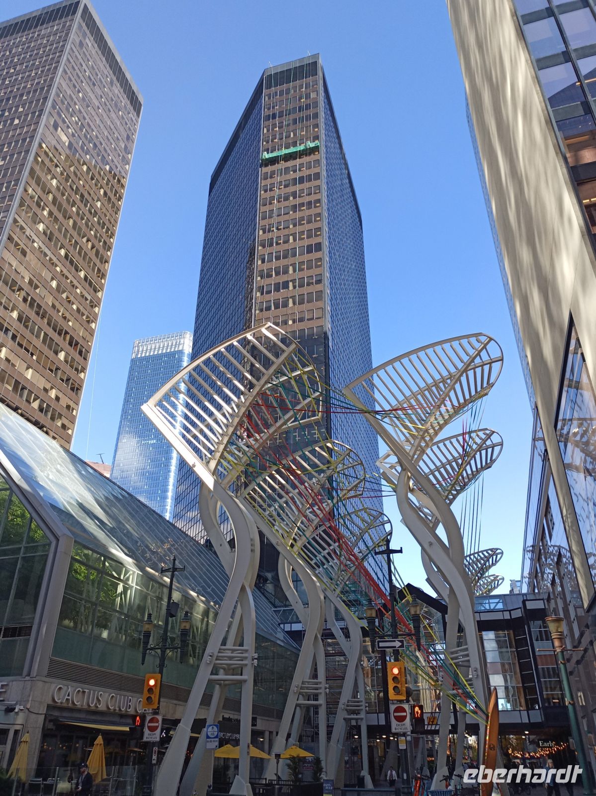 Wir kommen langsam zu Waterfront. Hier eröffnet sich das berühmte Vancouver Panorama von Canada Place mit dem maritimen Segeldach – daneben ist das große Vancouver Convention Centre. Wir gehen durch das Centre durch und bewundern die Architektur und moderne Kunst, die hier geschmackvoll installiert ist. Zwischen den zwei Gebäuden sind auf dem Plateau Plätze zum Verweilen, mit schönen Aussichten