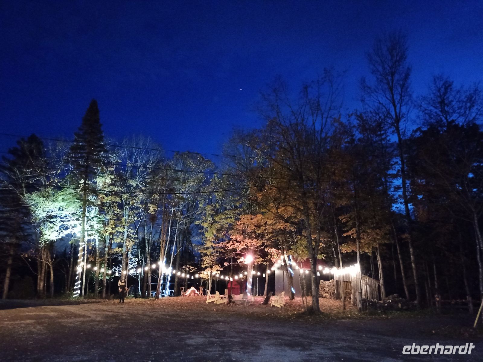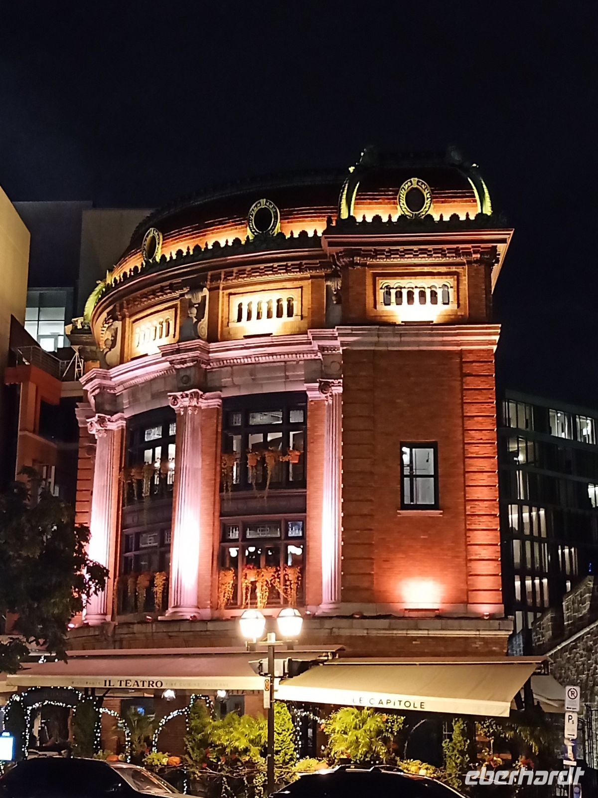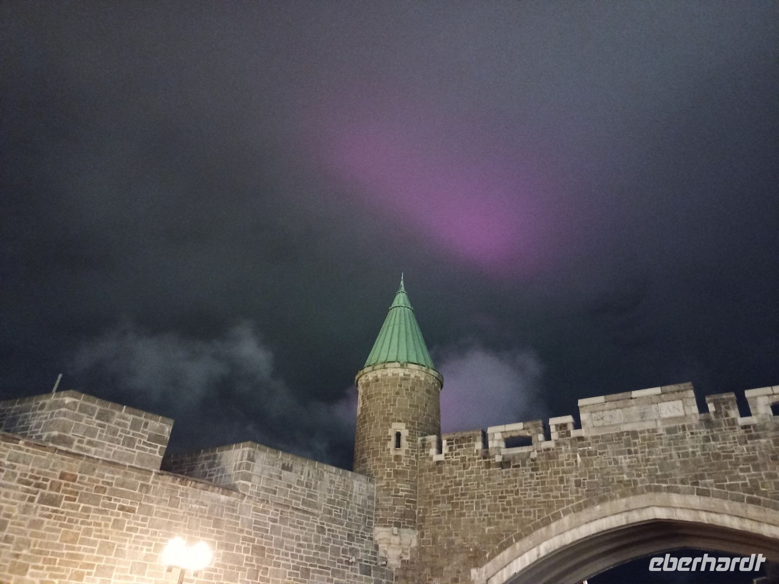 Bald sind wir in der City, es wird dunkel und wir genießen das typische Abendessen – Spareribs, Steak oder Lachs, zum Abschluss mit einem üppigen Dessert. Danach gehen wir noch durch die beleuchteten Straßen von Quebec über das Tor Saint-Jean und neben dem wunderschön beleuchteten Theatergebäude. Einer von den Gästen entdeckte plötzlich lila Leuchten in Himmel über dem Tor – wow, sind es wohl Polarlichter, oder? – einfach ein außergewöhnlich schöner Ausklang des heutigen Abends. Unser Bus mit dem Fahrer Fred wartet schon auf und uns bringt uns ins Hotel – wo wir in unseren neuen Betten versinken. Es war ein sehr schöner Auftakt unserer Kanada Reise.