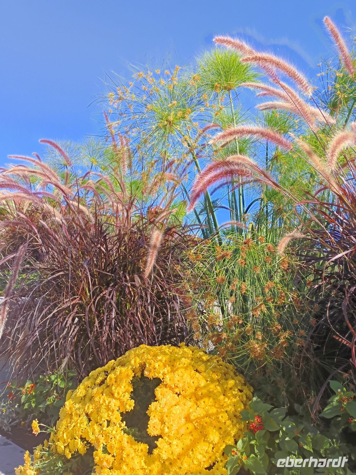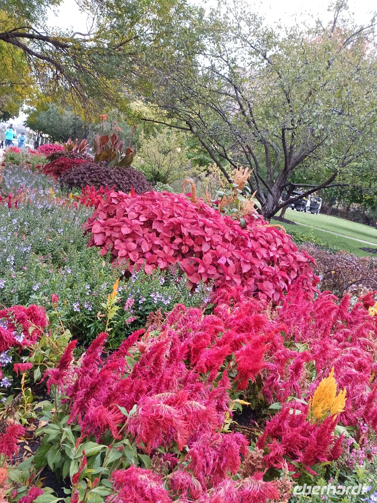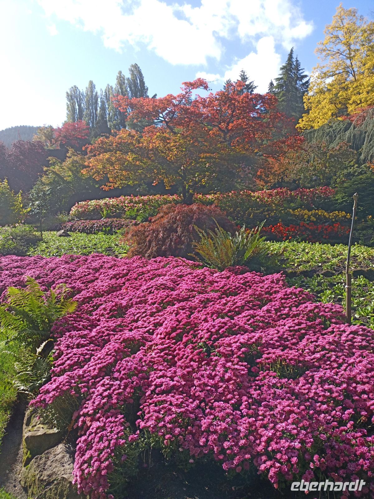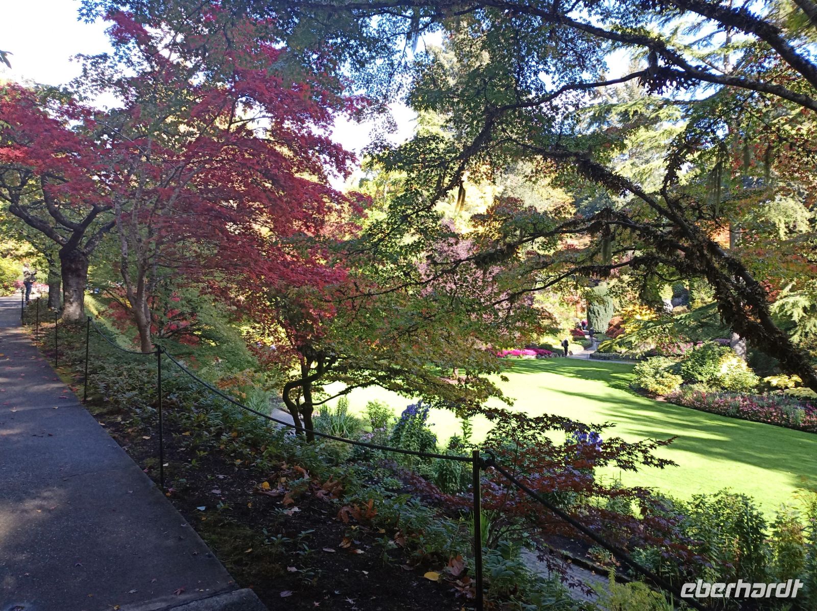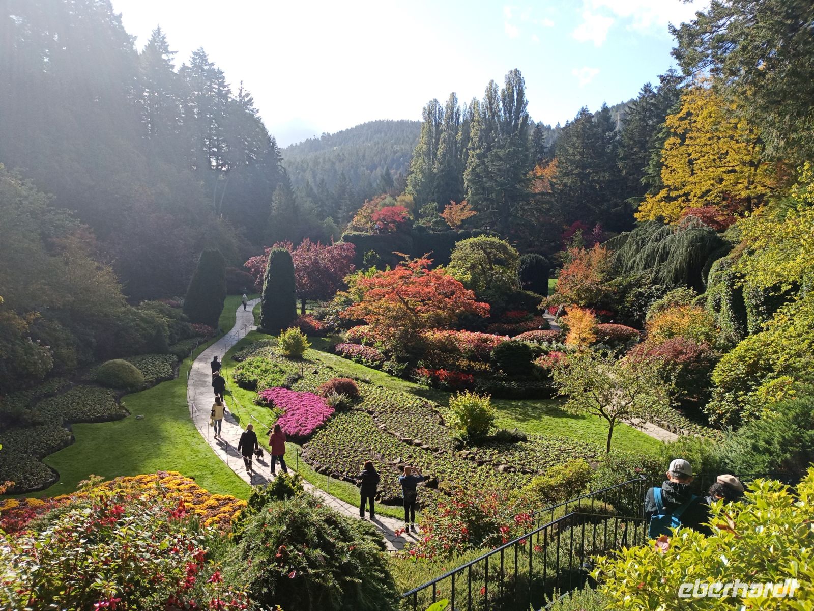 Jetzt ist es aber Zeit, die Butchart Gardens zu entdecken! Die weitläufigen Gartenanlagen sind ein wahres Paradies für Natur- und Blumenliebhaber, insbesondere im Herbst. Die farbenprächtigen Blumen, gepflegten Beete und malerischen Wege sind ein Fest für die Sinne. Besonders beeindruckend sind der historische „Sunken Garden“, der in einer ehemaligen Kalksteingrube angelegt wurde, oder der Rosengarten rund um die Fontäne. Der Japanische Garten beeindruckt uns durch seine harmonische Gestaltung und wirkt sofort mit Ruhe und Gelassenheit auf uns. Die roten, gelben, orangen und pinken Farben der Blätter und Herbstblumen strahlen in der Sonne und verleihen der Anlage eine besondere herbstliche Atmosphäre.