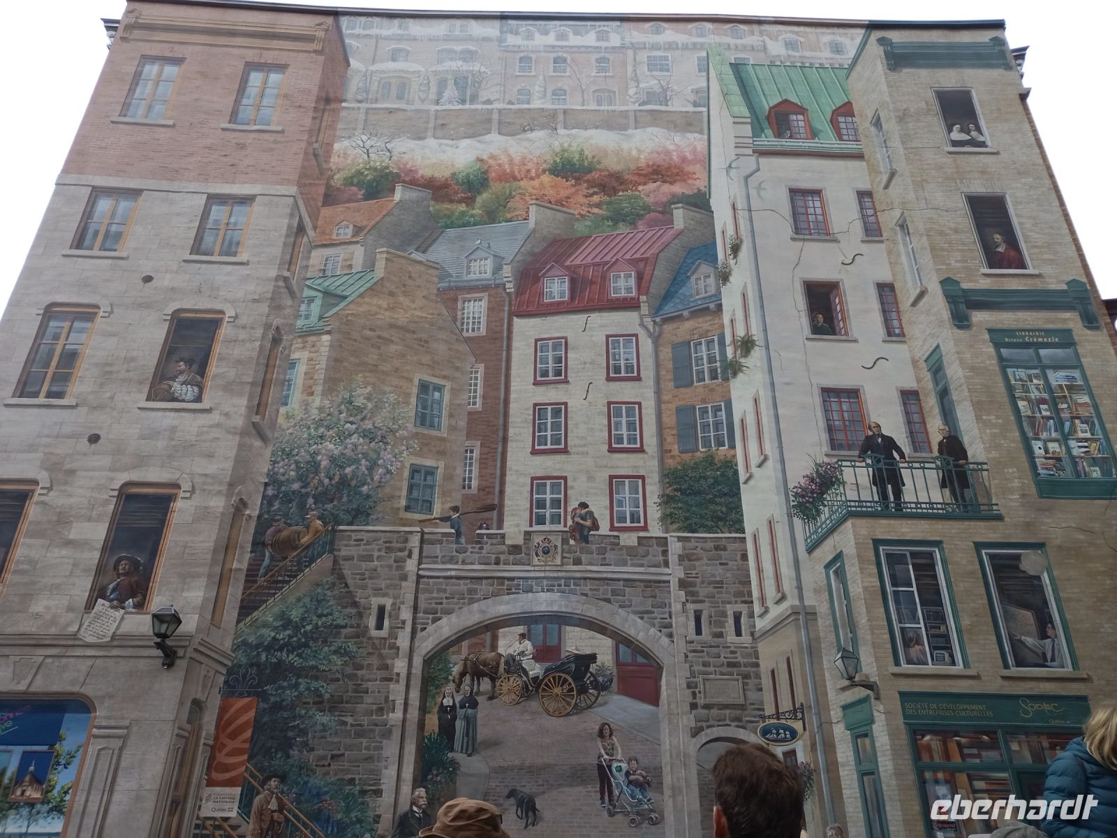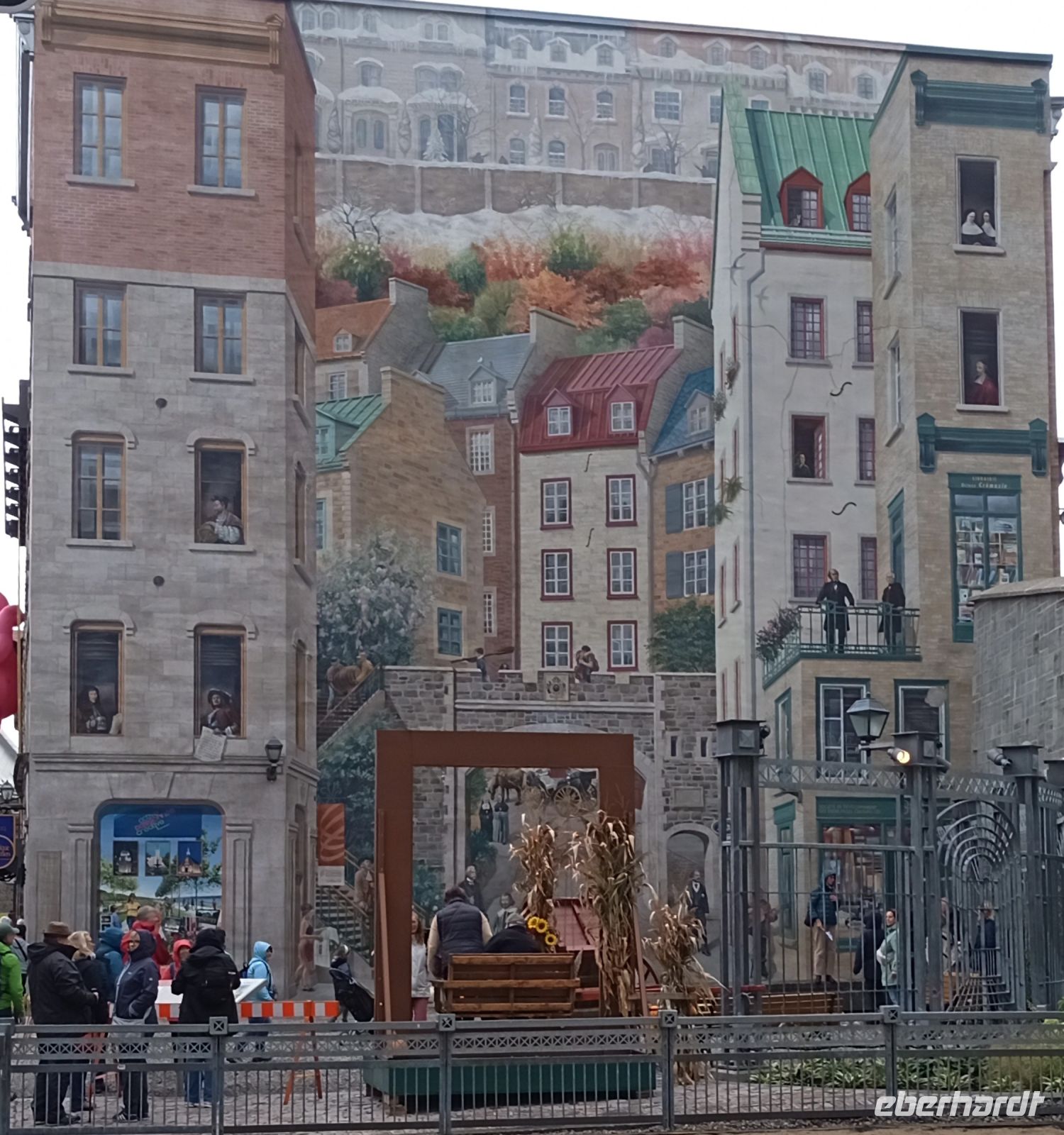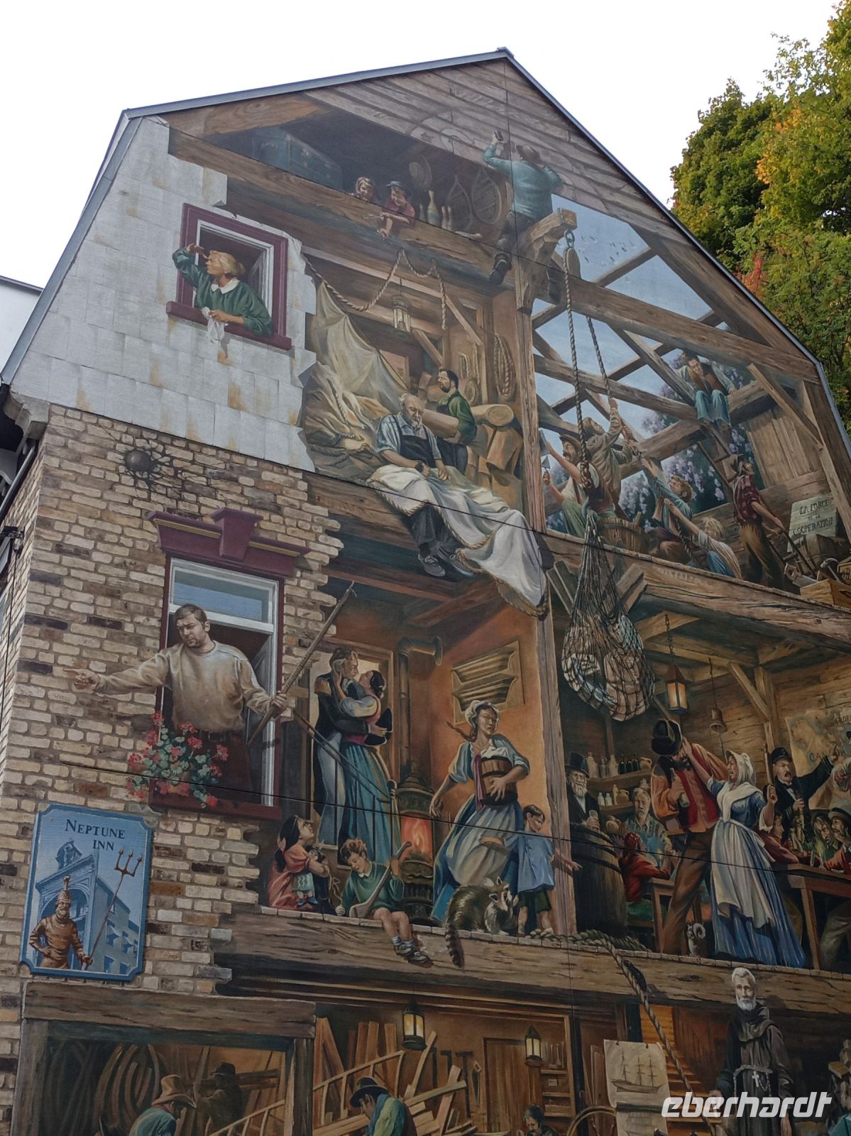 Heute fand in Quebec ein Marathonlauf statt. Dadurch waren einige Straßen gesperrt und unsere Reiseführerin musste bei unserem Stadtrundgang etwas improvisieren. Die Läufer in allen Altersklassen haben Ihren sportlichen Enthusiasmus trotz der Kälte, deutlich gezeigt und die Atmosphäre war in der ganzen Stadt spürbar. Die Menschen säumten die Straßen, um die Läufer anzufeuern. Unser Spaziergang führte über das Künstlergässchen weiter hinunter in die malerische Unterstadt, die voller historischer Sehenswürdigkeiten und charmanter Gebäude ist. Ein besonderer Stopp war an einer der künstlerisch bemalten Häuserfassaden in der Stadt – „Fresque des Québécois“. Es ist eine Wandmalerei von 1999, in der 16 Persönlichkeiten (u.a. Samuel de Champlain, Félix Leclerc oder Lord Dufferin), auf der Wandfläche verteilt, abgebildet sind. Auch so kann man Historie anschaulich machen.