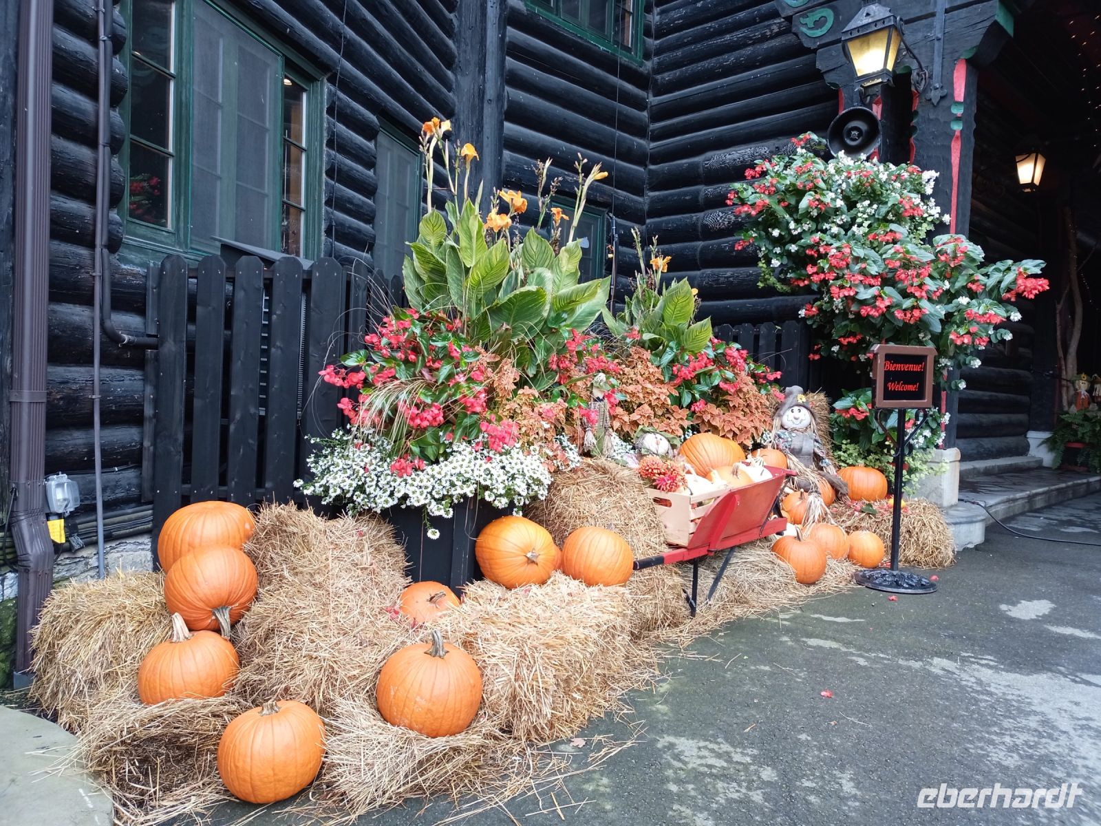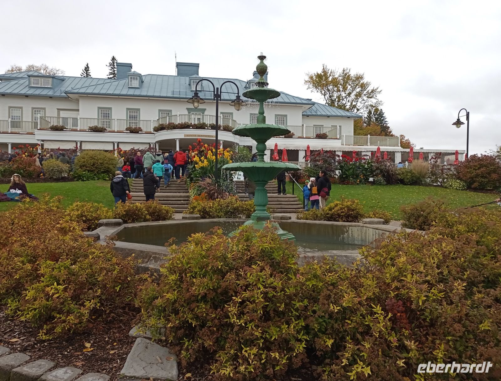 Unser Mittagessen ist heute in dem Fairmont Hotel Montebello. Wir fahren in einem großen grünen Park hinein. Der Hoteleingang ist mit Kürbissen und Herbstblumen dekoriert und wir betreten die imposante Hotelhalle mit einem Turm in der Mitte. Das Fairmont Hotel Montebello ist ein historisches, luxuriöses Hotel und eines der größten aus Holz gebauten Hotels der Welt. Erbaut 1930 und umgeben von 300 Hektar Natur. Das Hotel ist bekannt für seine gehobene Küche und regionale Spezialitäten. Das werden wir gleich verkosten. Die Hauptspeise ist eine Kombination von feinem Rind und pikanter Wurst mit Gemüse und Kartoffeln. Als wir am Tisch saßen und das Essen serviert wurde, merkten wir, dass ein Gast fehlt. Wir suchten Ihn in der Lobby und Garten - vergeblich und haben das Personal informiert. Plötzlich tauchte unser Gast wieder auf – das Hotel ist so weitläufig, dass er uns auf einmal verloren hat, oder wir ihn… ab jetzt passen wir besser aufeinander auf …