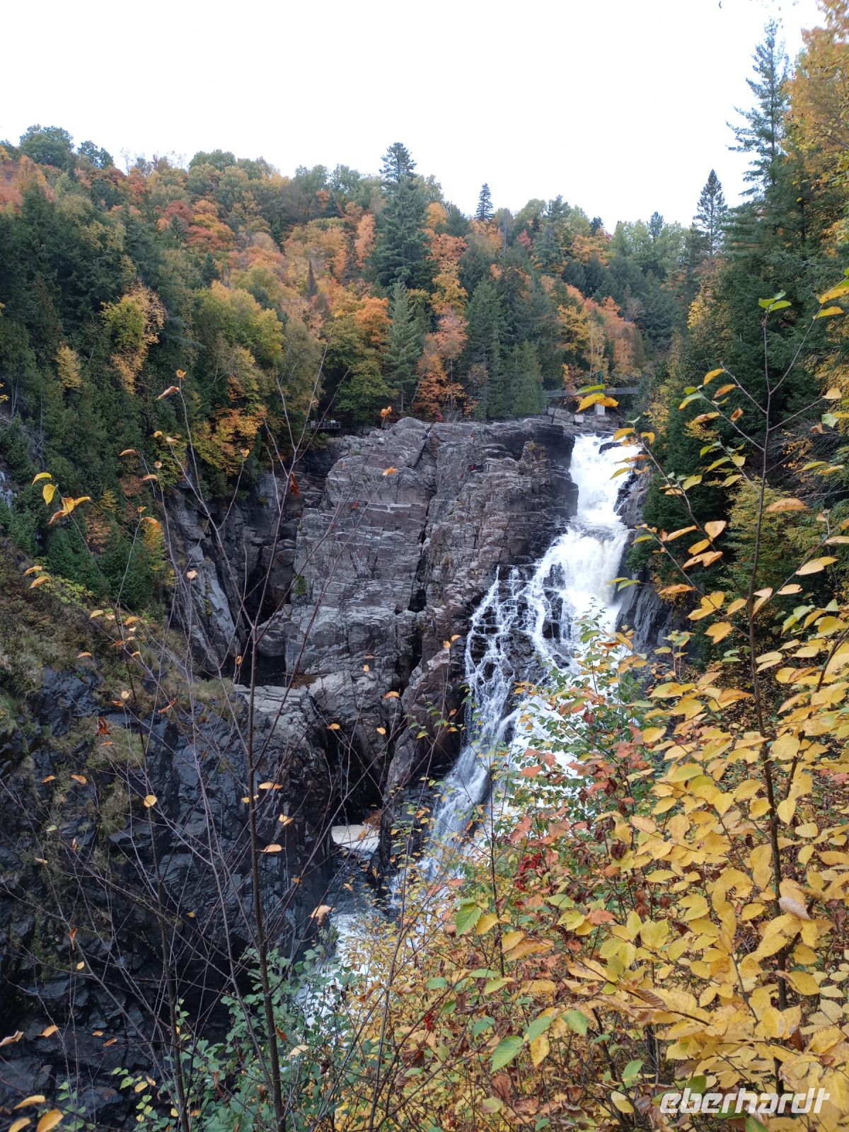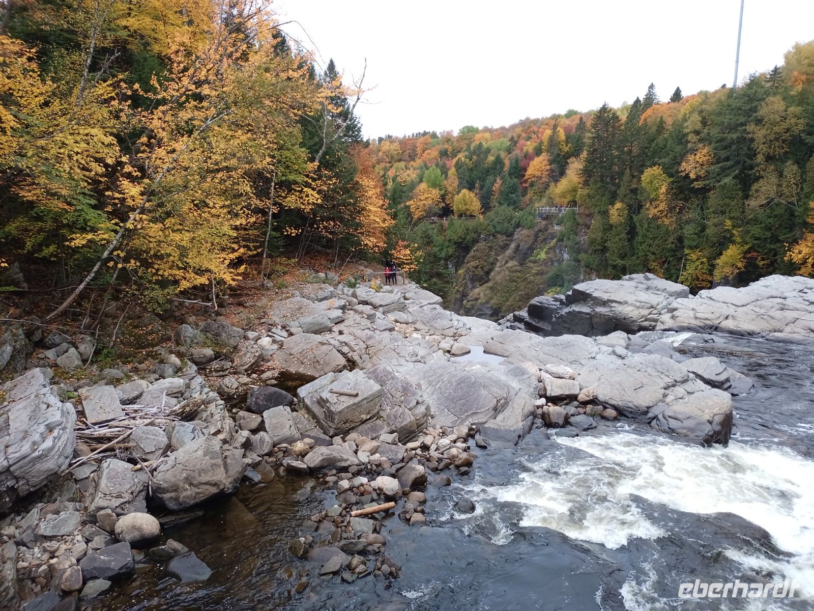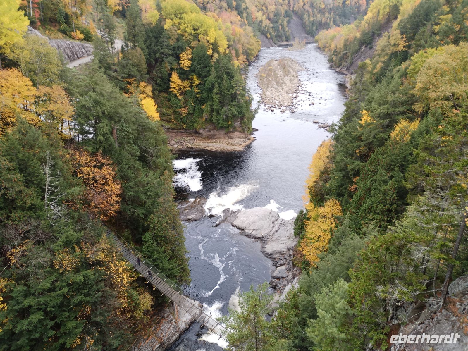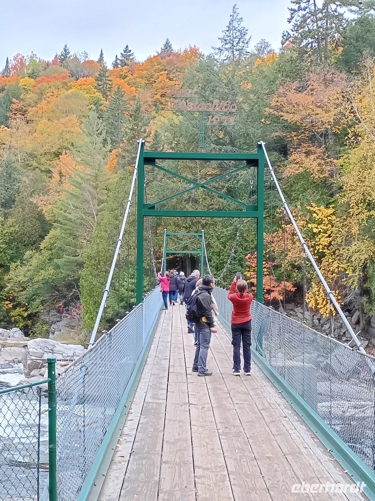 Aber das war noch nicht alles an Naturschönheiten des heutigen Tages in der Provinz Quebec – nur ein paar Kilometer weiter durch die buntgefärbten Wälder und kleine Ortschaften empfängt uns ein anderes Natur- und Wasserspektakel. Canyon Canyon Sainte-Anne – wir konnten über die Hängebrücken Brücken spazieren, die sich über die Schlucht spannt und beeindruckende Aussichten auf die Felsen und den Fluss bietet. Bei strahlendem Herbstwetter war dies eine herrliche Gelegenheit, die Farben des Waldes und die Ruhe der Umgebung zu genießen.