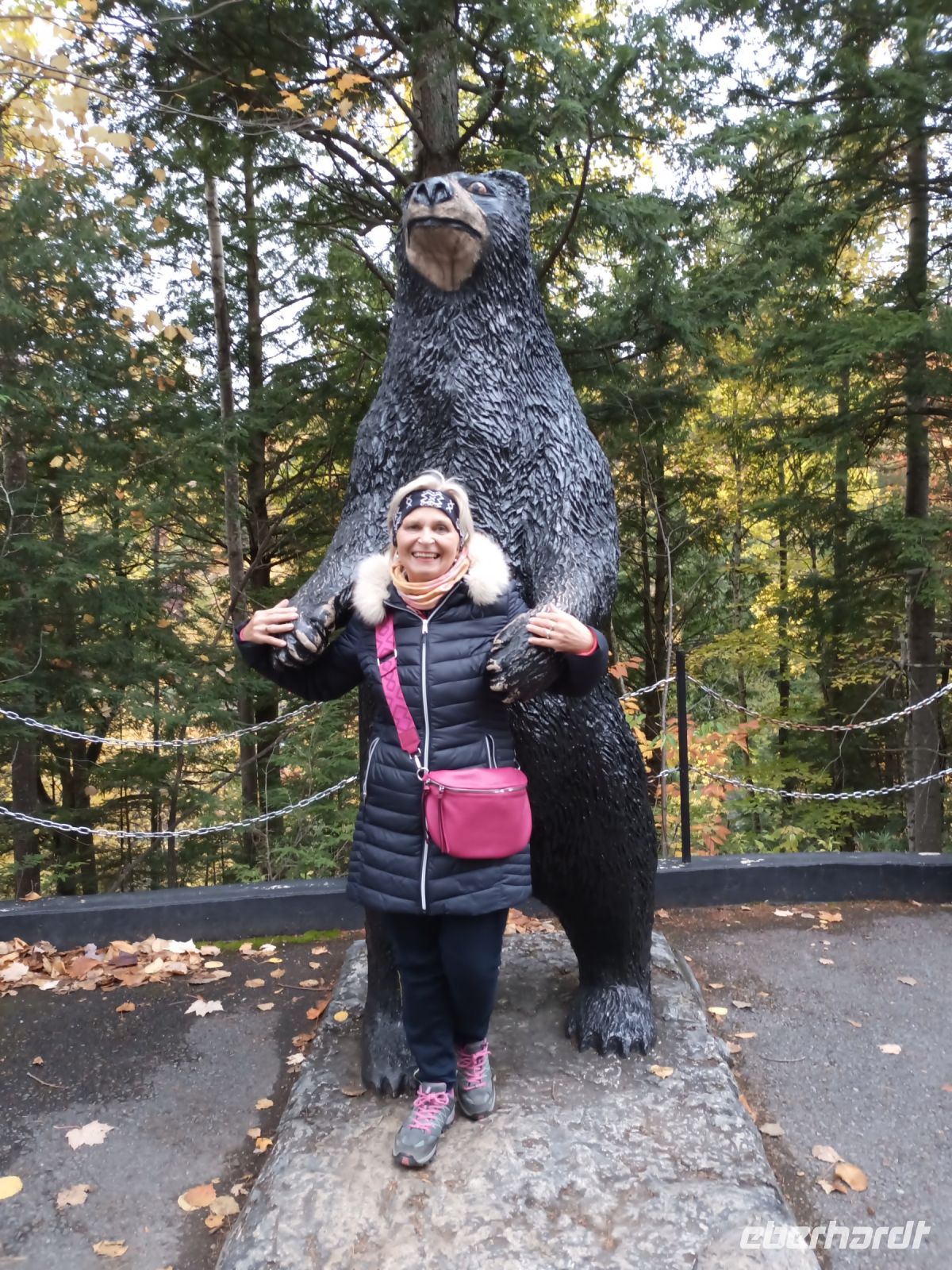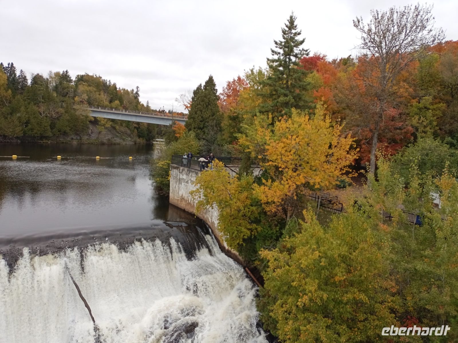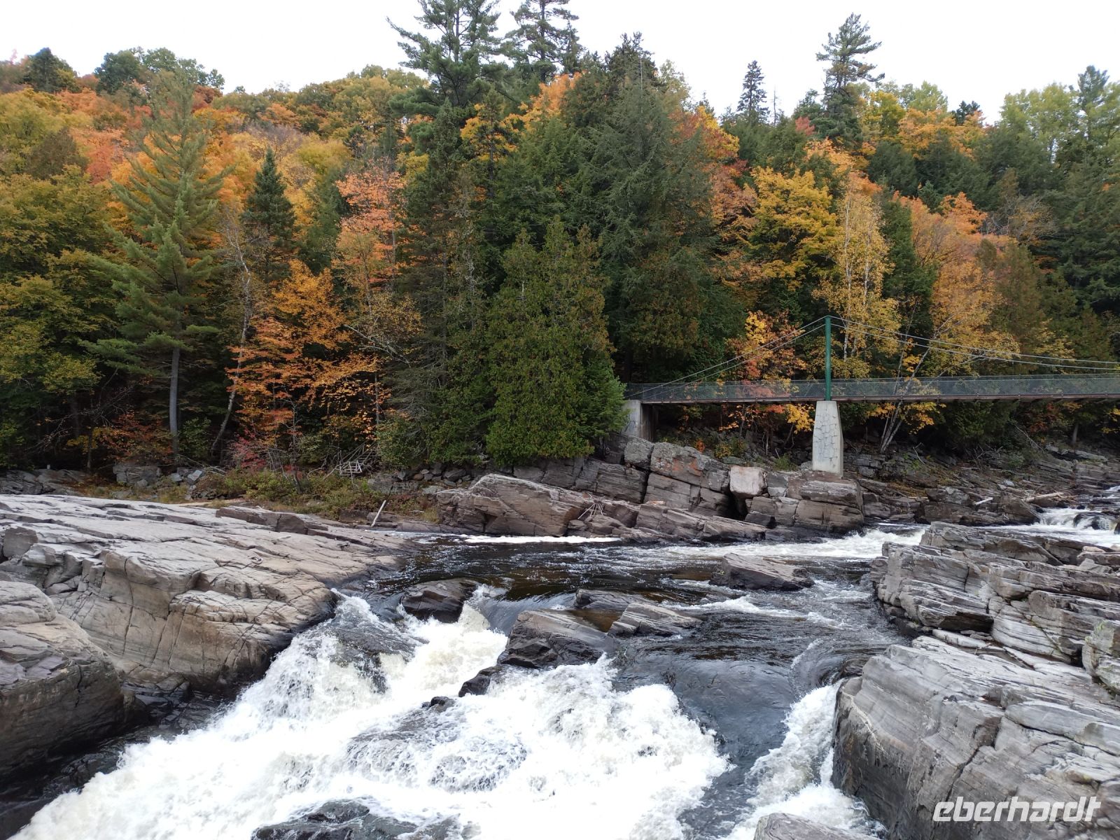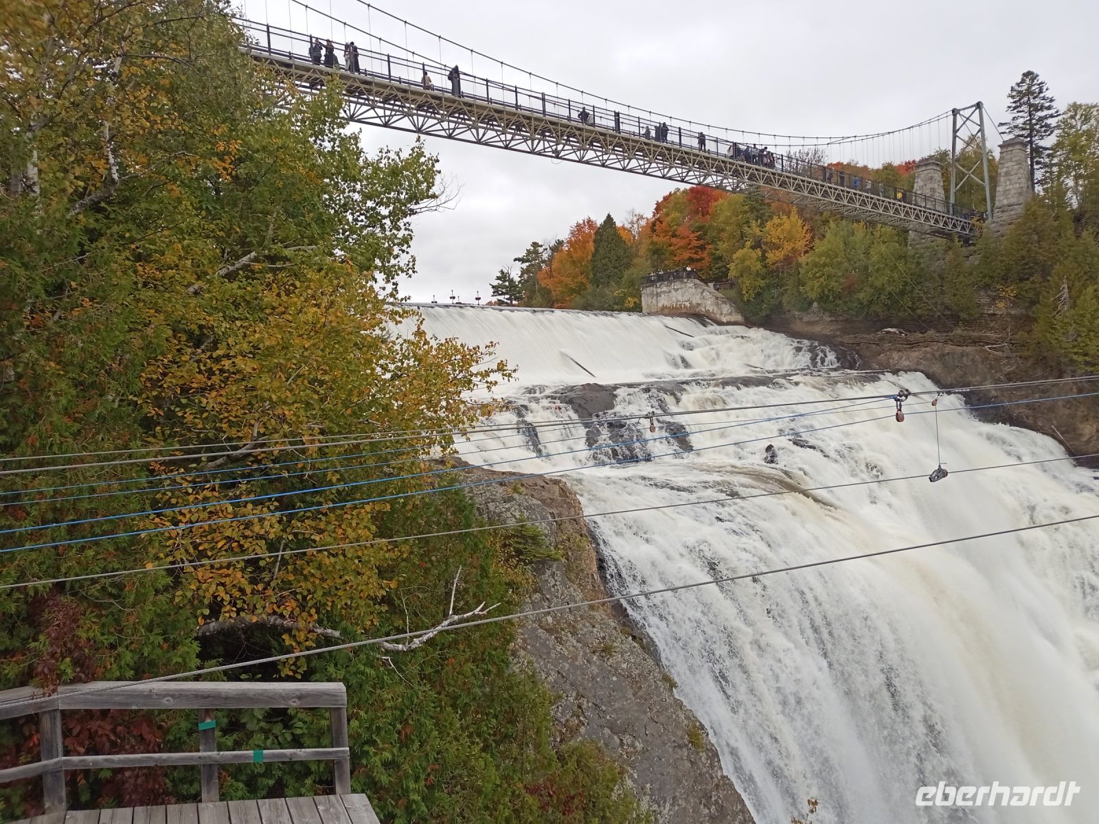 Aber das war noch nicht alles an Naturschönheiten des heutigen Tages in der Provinz Quebec – nur ein paar Kilometer weiter durch die buntgefärbten Wälder und kleine Ortschaften empfängt uns ein anderes Natur- und Wasserspektakel. Canyon Canyon Sainte-Anne – wir konnten über die Hängebrücken Brücken spazieren, die sich über die Schlucht spannt und beeindruckende Aussichten auf die Felsen und den Fluss bietet. Bei strahlendem Herbstwetter war dies eine herrliche Gelegenheit, die Farben des Waldes und die Ruhe der Umgebung zu genießen.
