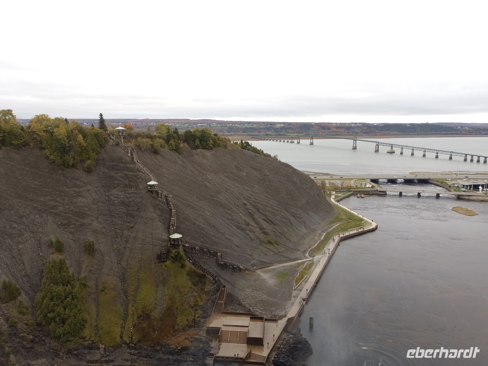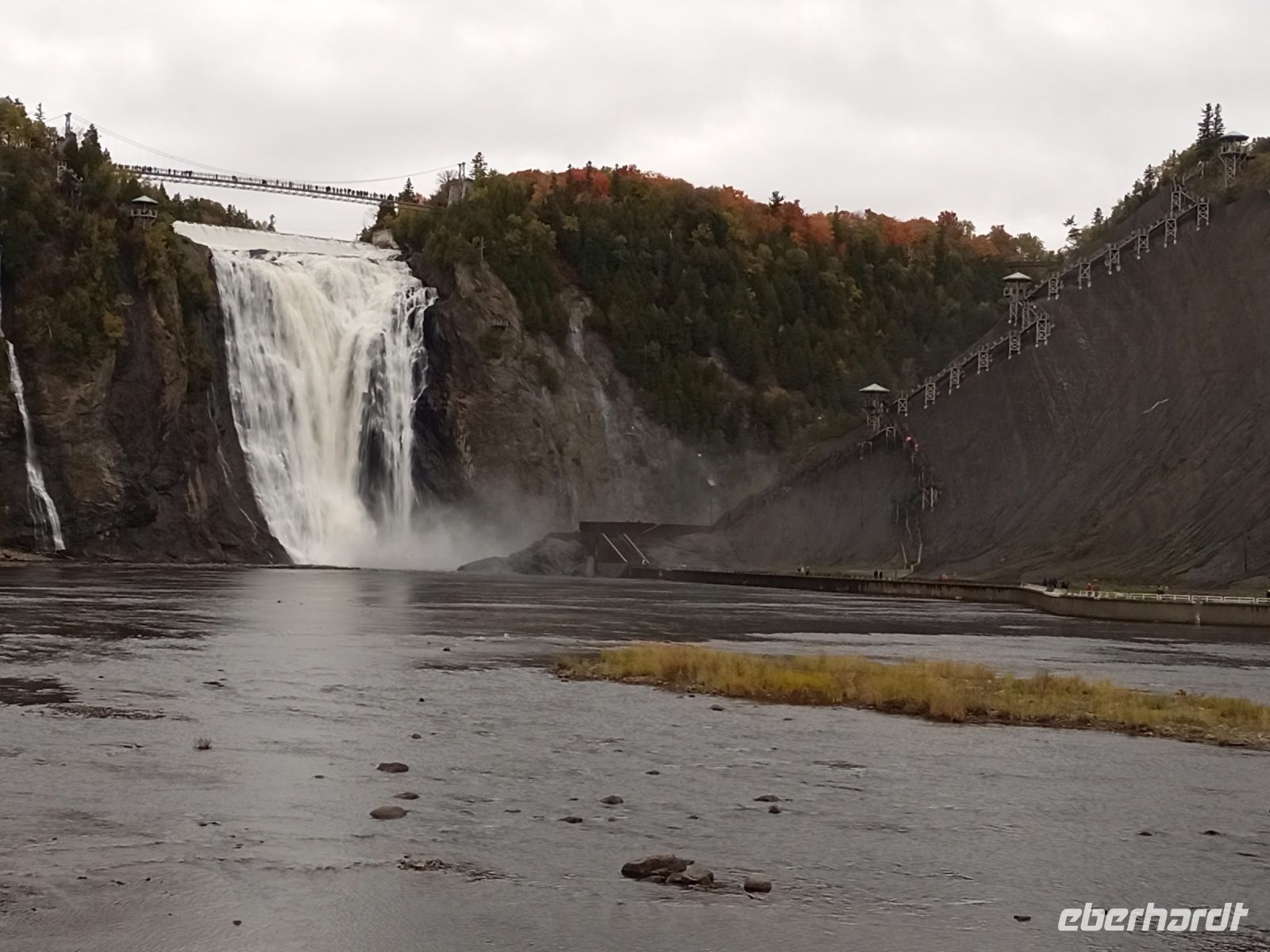 Wir verlassen die Stadt und fahren entlang des St. Lorenz Strom Richtung Montmorency-Wasserfall. Schon an dem Ausgangspunkt vor dem „Manoir Montmorency“ historischen Gebäude, können wir die farbenprächtige Blumenbette bewundern: Jetzt geht es zu dem Wasserfall. Gemeinsam gehen wir auf die gigantische Hängebrücke über den Wasserfall. Mit einer Höhe von 83 Metern ist der Wasserfall sogar 30 Meter höher als die Niagarafälle und bietet atemberaubende Aussichten. Die Wassermassen stürzen in die Tiefe und besprühen uns ein wenig. Ein großer Teil der Gruppe geht mit Marion über die Holztreppen hinunter und kann noch ein paar andere Ausblicke in die Fotoapparate einfangen. Ich begleite den Rest der Gruppe zu der Talstation, wo wir uns alle wieder treffen.