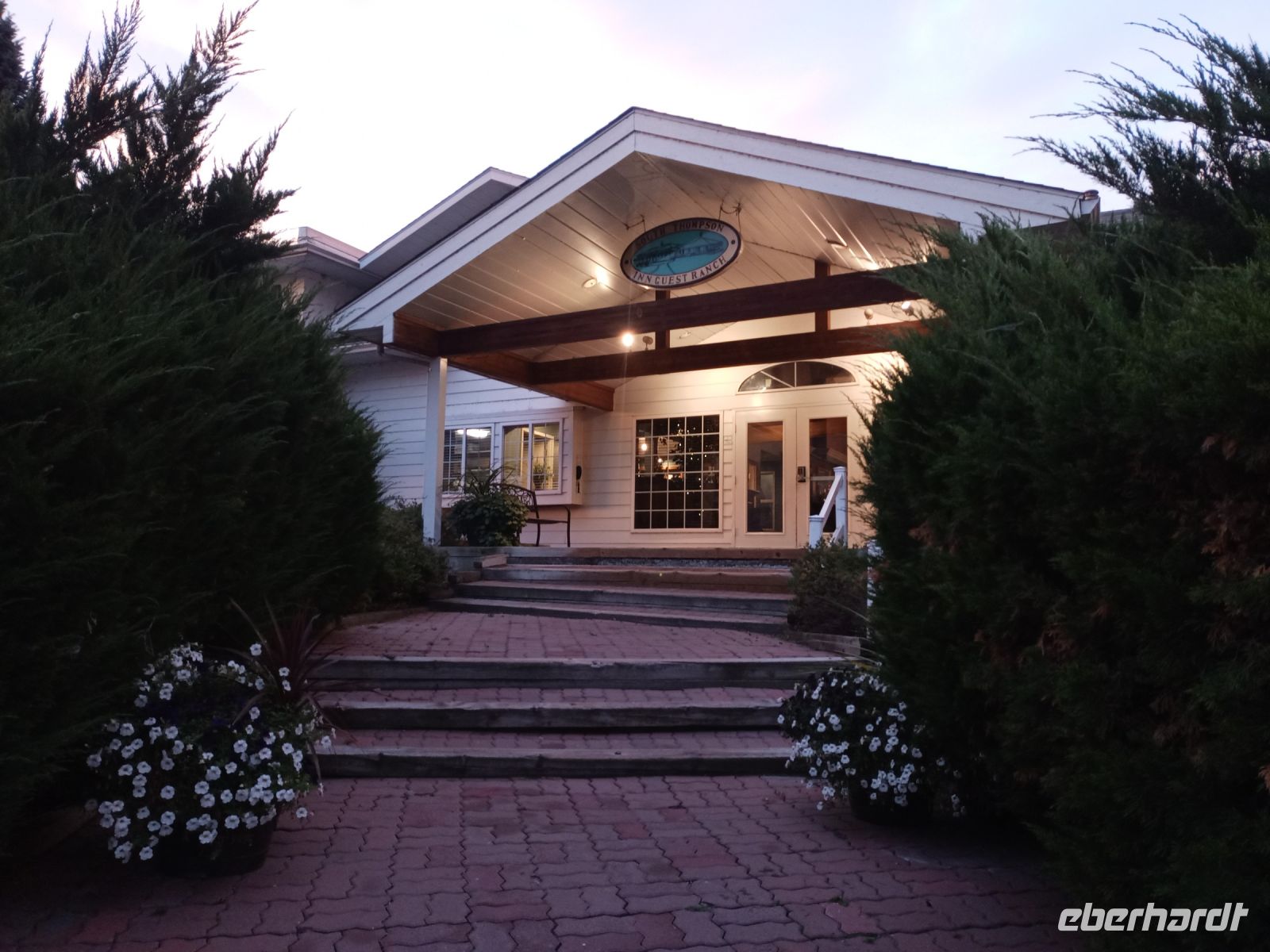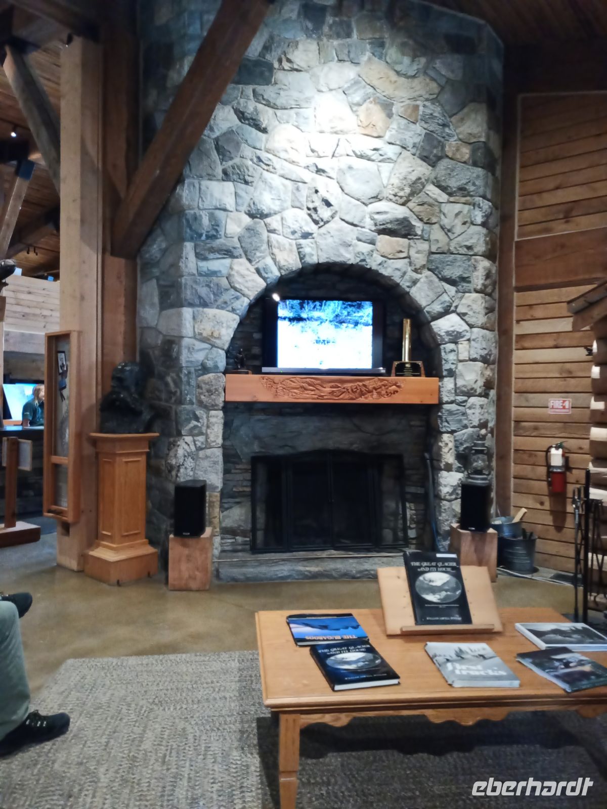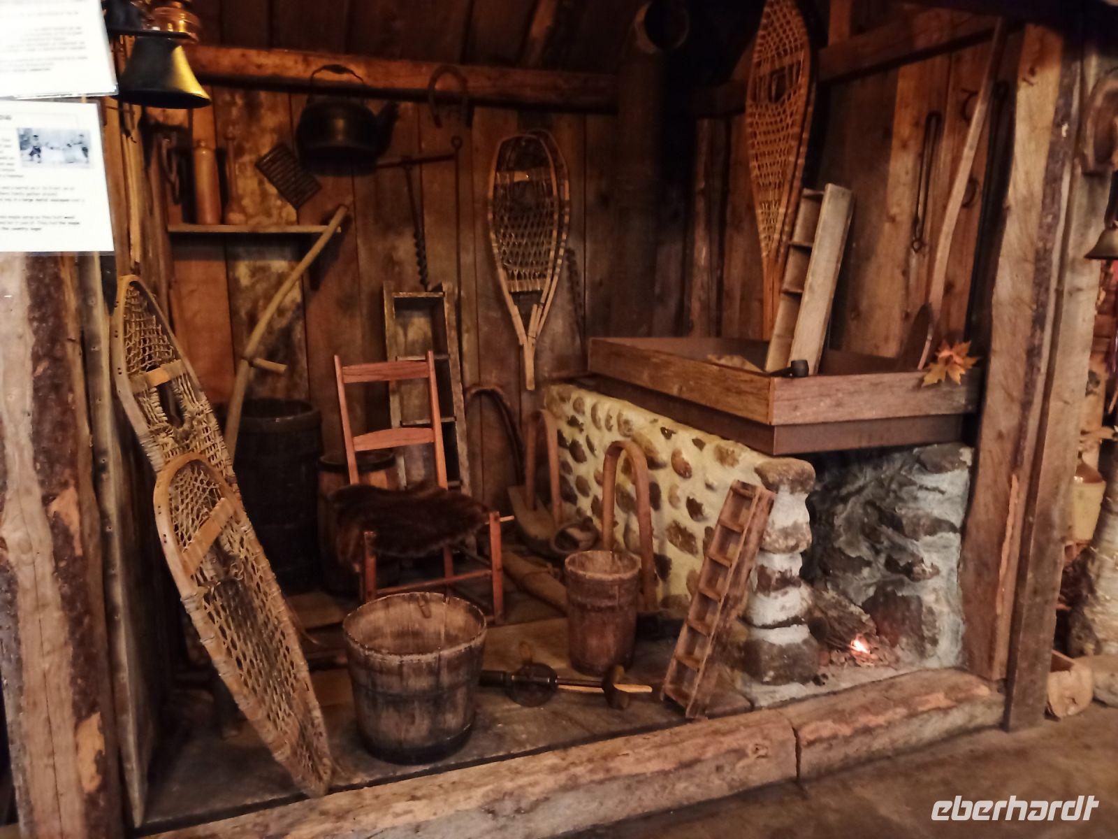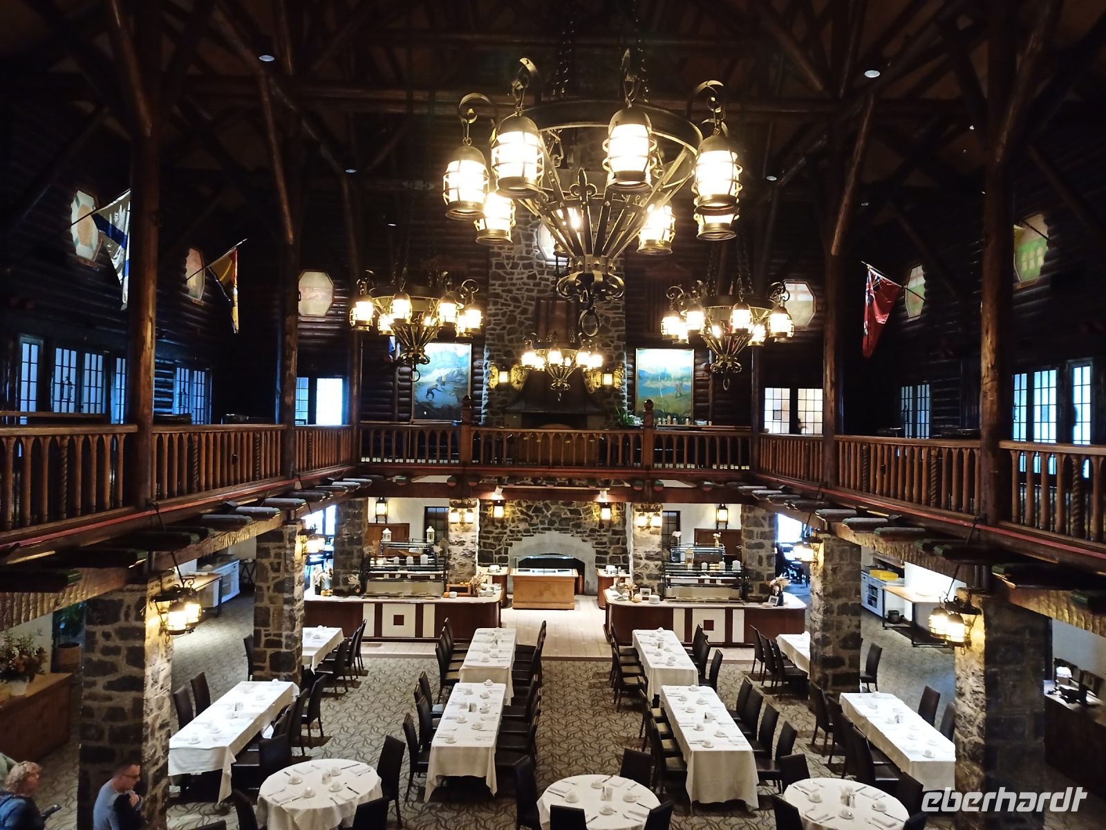 Wir treffen uns vor dem Restaurant des Hotels und frühstücken zusammen in einem uns zugeteilten Bereich des Restaurants. In einem steinbelegten offenen Kamin lodert das Feuer. Schöne Stimmung gleich am frühen Morgen. Das Frühstücksbüffet ist sehr vielfältig, hier findet jeder etwas für sich. Von einer großen Auswahl an frischen Früchten bis zu einer Spezialität der Region - „Benedict“ - kleine flache geröstete Brötchen mit Ei und Speck und einer Art Mayonnaise eingebacken, echt lecker. Der Kaffee oder Tee wir uns am Tisch serviert. Das werden wir noch die nächsten zwei Tage genießen. Das Hotel – Typisch kanadische Lodge aus Holz – urig, gemütlich, an manchen Stellen sind die Spuren der Jahre zu erkennen.