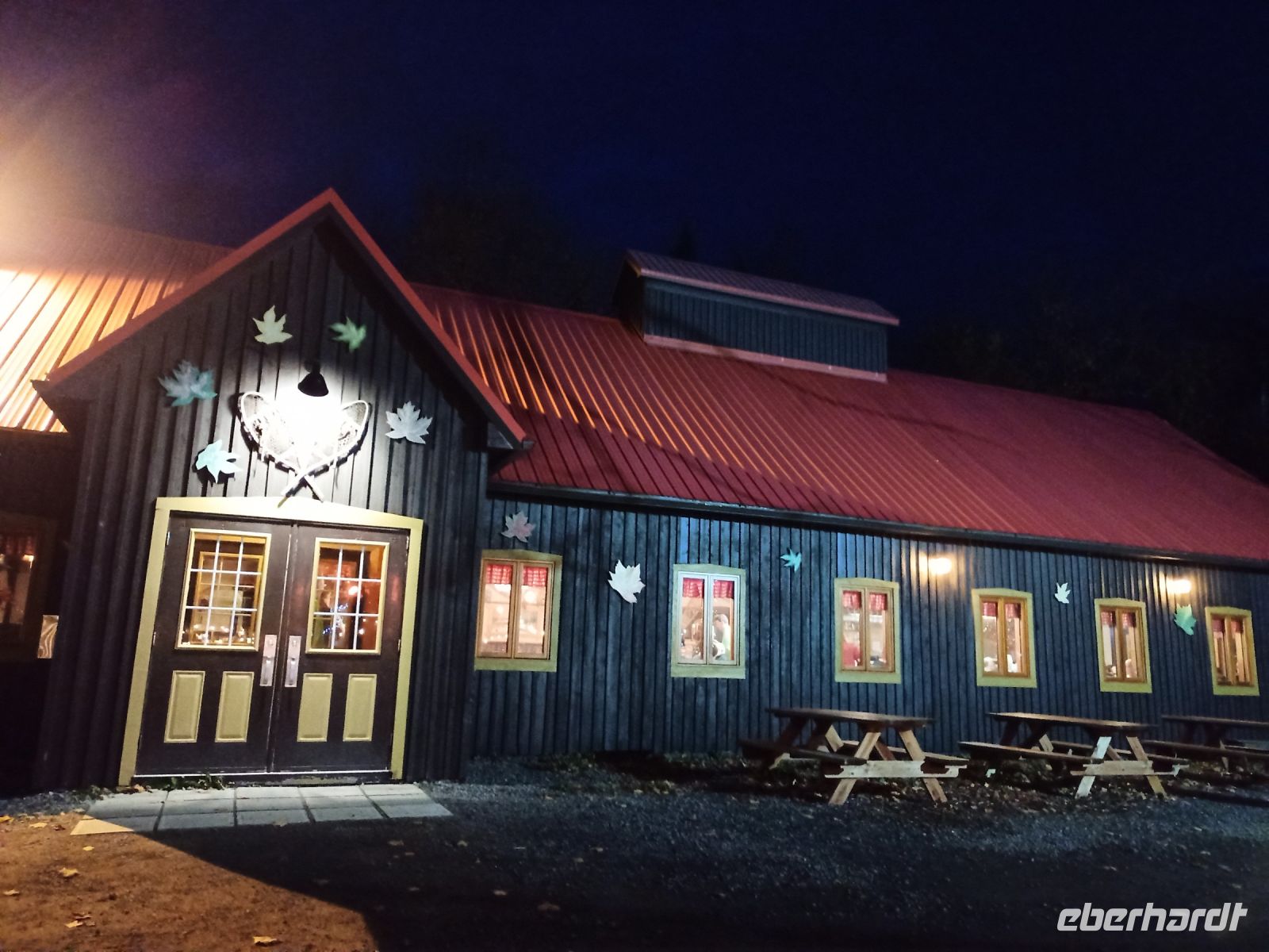 Den Abend verbrachten wir in der traditionellen Ahornfarm Érablière Du Lac-Beauport, wo wir zunächst eine interessante Einführung in die Herstellung von Ahornsirup erhielten. Unsere Gastgeber erklärten uns - von Marion übersetzt - den gesamten Prozess von der Ernte des Ahornsafts bis zur Produktion des Sirups und anderer Ahornprodukte. Es gab auch die Möglichkeit, Ahornsirup, Butter und andere Spezialitäten zu kaufen, die beliebte Mitbringsel aus der Region sind. Anschließend erwartete uns ein traditionelles Abendessen in gemütlicher Atmosphäre, begleitet von einem Musiker, der mit Gitarre für Unterhaltung sorgte. Auf dem Speiseplan standen typisch kanadische Gerichte, darunter köstliche Erbsensuppe, zarter Schinken, Schweinefleisch und eine herzhafte „Hackfleisch-Quiche“. Zum Abschluss gab es noch draußen in schöner Abendstimmeng einen Eislutscher aus Ahornsirup.