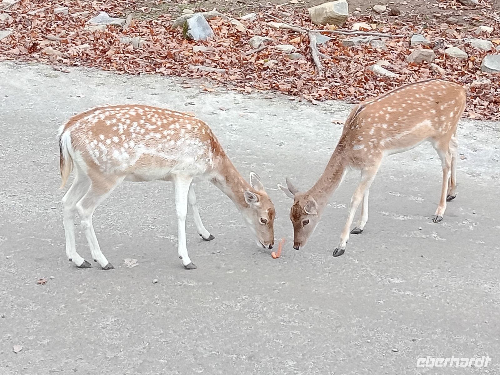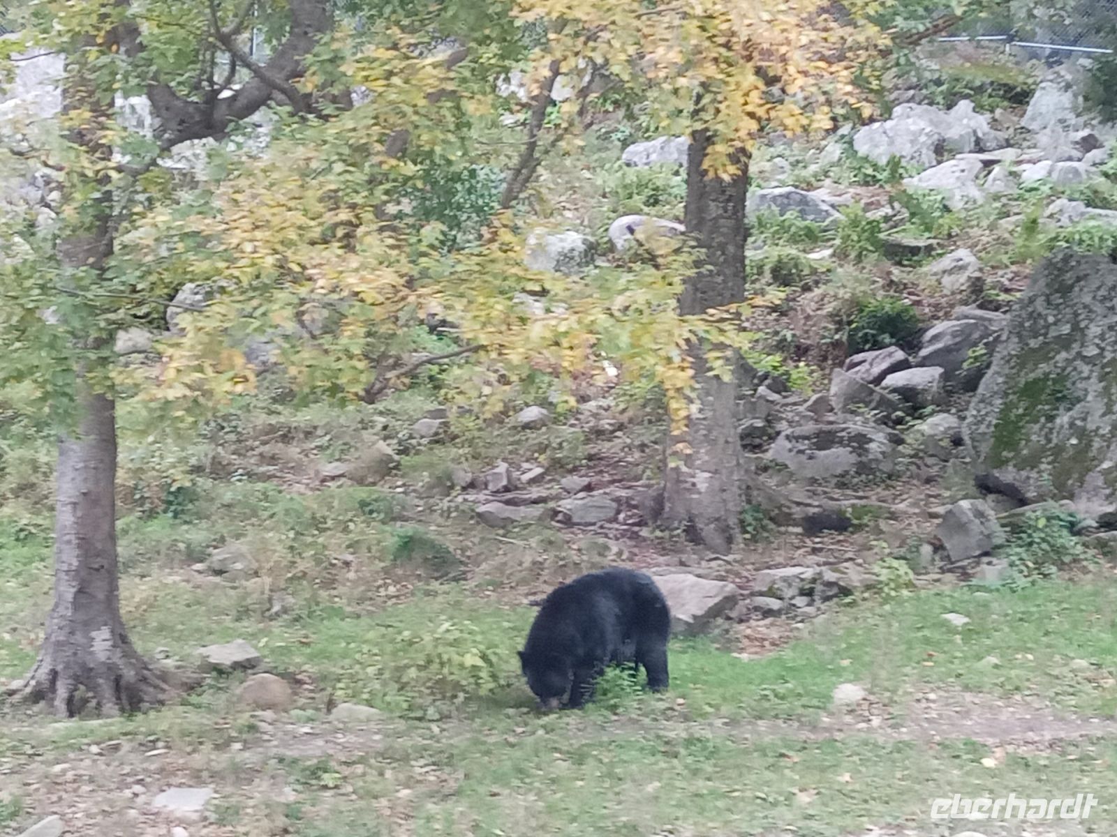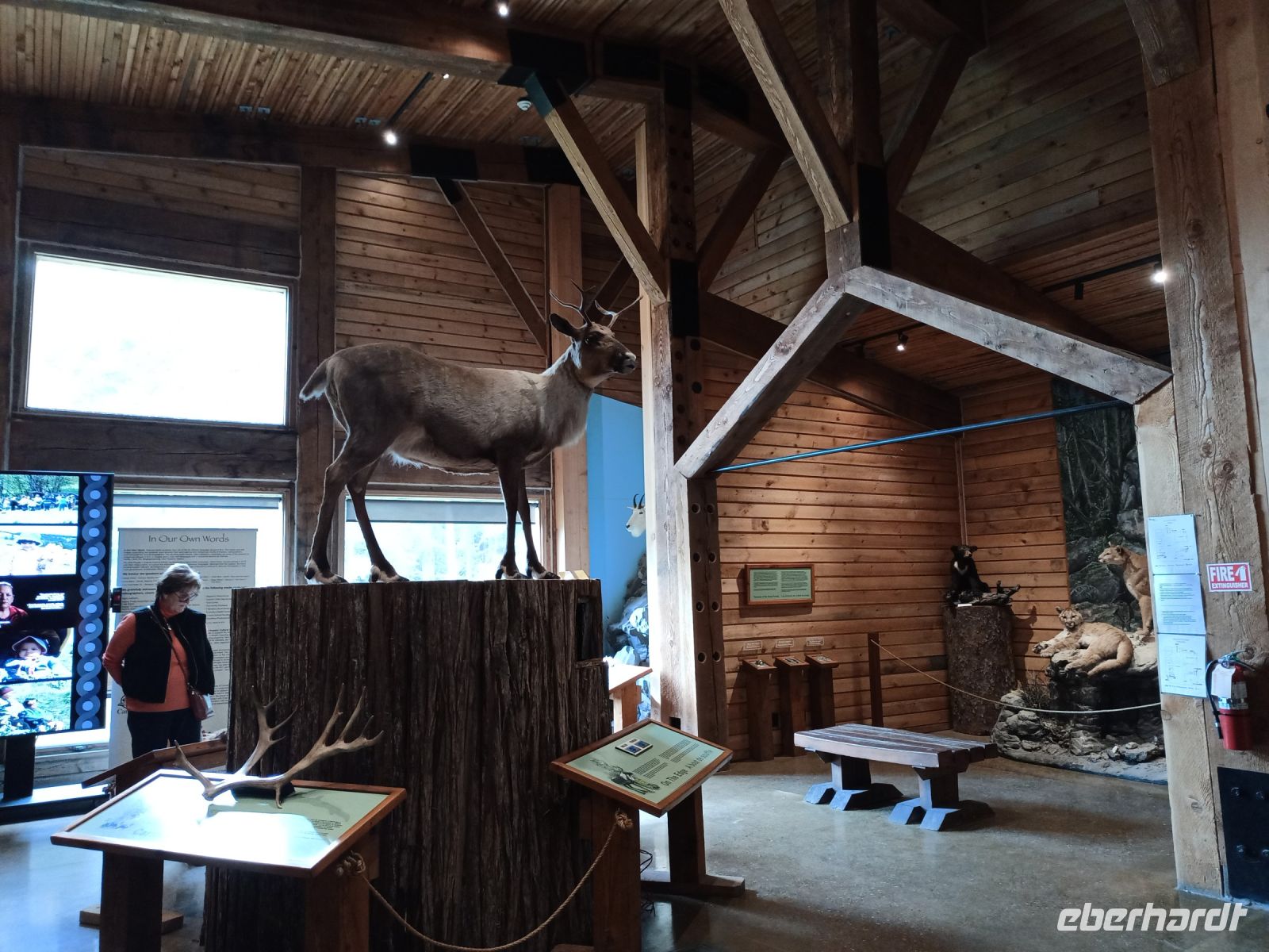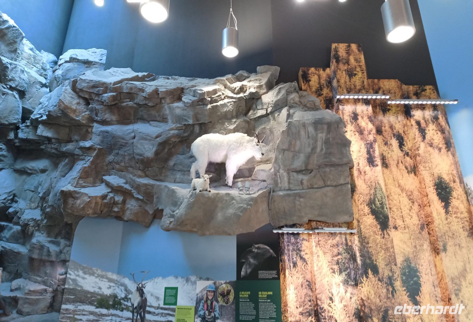 Parc Omega ist ein Naturpark, wo man in fast freien Landschaften die Tiere, die in den kanadischen Wäldern leben, sehr gut beobachten kann. Bevor wir in einen türkisenen Schulbus steigen, besorgen wir ein paar Beutel Karotten, um die Tiere anzulocken um sie so nah wie möglich sehen. Die wissen es schon, dass die Gäste die „Leckerlies“ für sie haben und die ersten Wapitis strecken schon den Kopf in die Fenster des Busses, um sich die Karotte zu schnappen. Der Park erstreckt sich über eine Fläche von rund 2.200 Hektar. So werden wir mit unserem Bus auf einer ca. 12 km langen Safariroute die Tierwelt Kanadas ganz nah erleben. Auf der Strecke sehen wir weiter Damwild, Hirsche, arktische Wölfe, Wildschweine, Polarfüchse, aber auch Bergziegen und Elche. An den Seen schnattern die Gänse und Enten und Wasservögel posieren im Wasser. Auf einmal steht neben den Bus ein kleiner Silberfusch mit einem weißen Schwanz – sieht aus wie ein Kuscheltier. Aber auch die Bären präsentieren sich in voller Größe – wie gut, dass wir im Bus sitzen… Die Gäste fotografieren, geschützt vom den Busfenstern die Tiere, die wir sonst so in der freien Natur nicht so einfach sehen könnten, und Einigen auch nicht begegnen wollten.