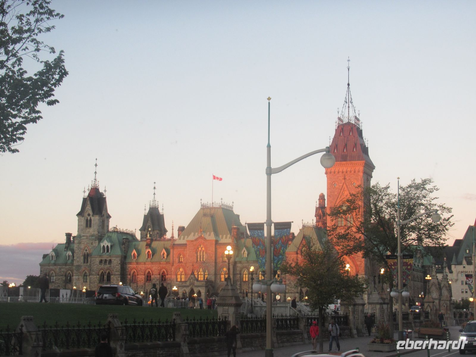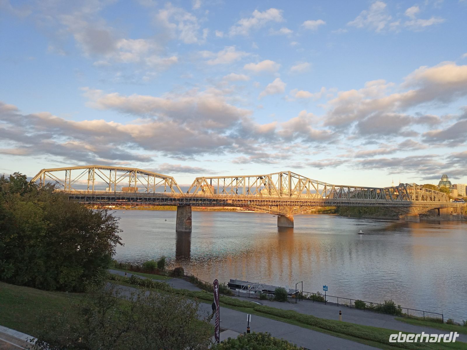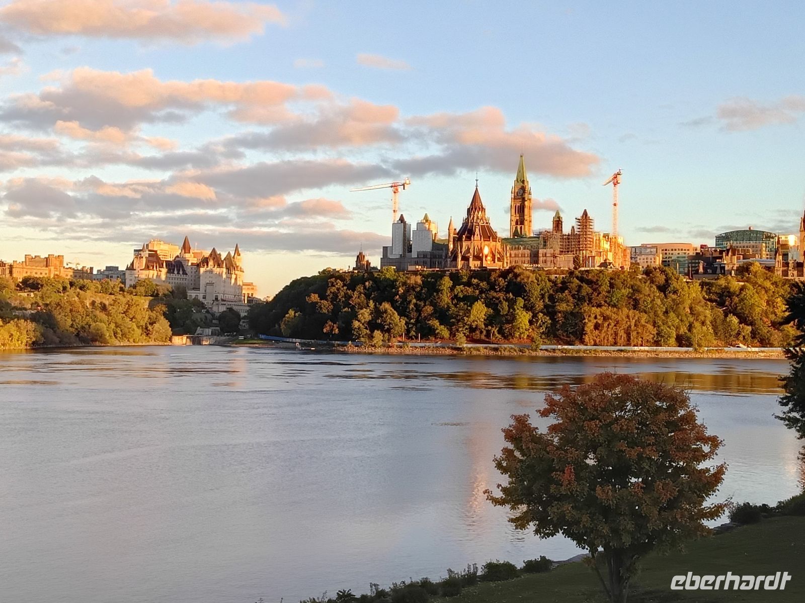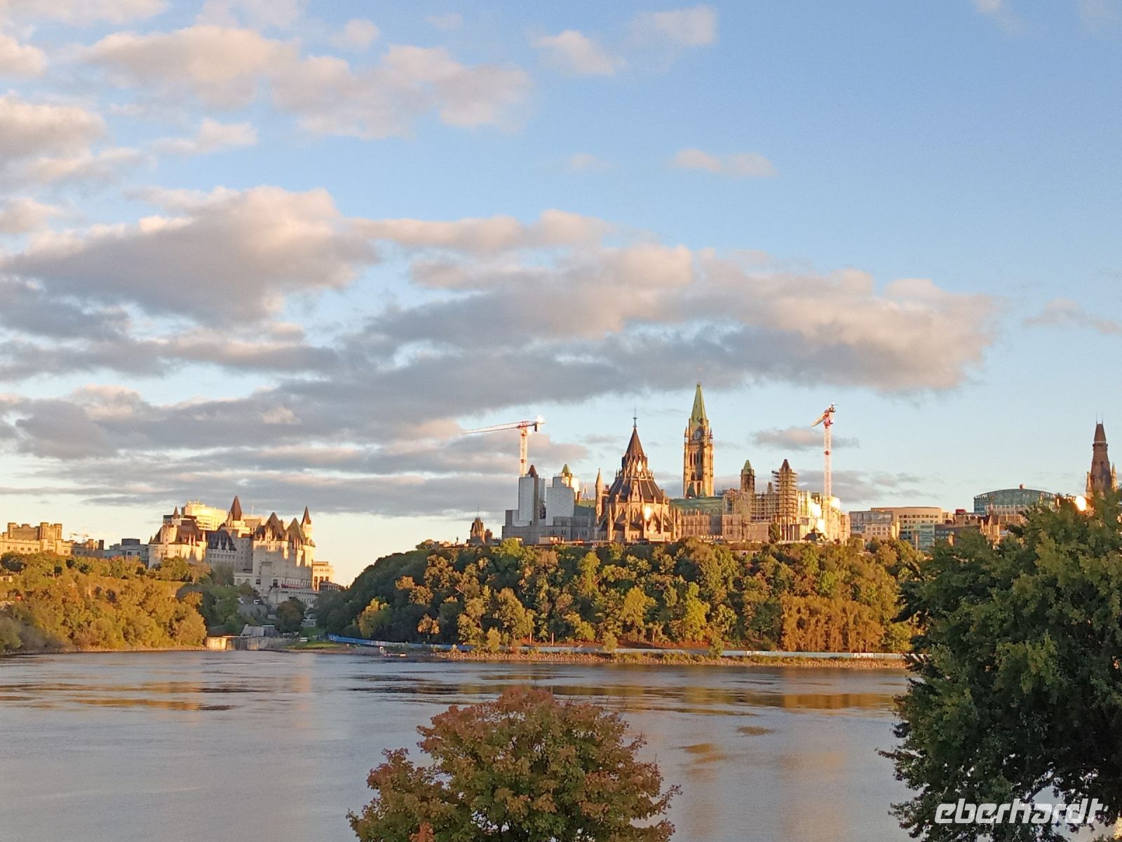 Unsere Fahrt führt uns in die Hauptstadt von Kanada - Ottawa, die schon in der Provinz Ontario an dem Ottawa Fluss liegt. Nach ca. 2 Stunden von Montebello erreichen wir Ottawa. Gleich bei der Anfahrt nach Ottawa machen wir einen Stopp an Kanadas Nationalmuseum für Geschichte und Gesellschaft. Es war leider heute geschlossen, aber von der Terrasse hinter dem Museum haben wir eine wunderbare Aussicht auf den Ottawa Fluss, die Brücke und Parliament Hill von Ottawa. Die ganze Kulisse ist von untergehender Sonne vergoldet – ein fantastischer Empfang von Ottawa.