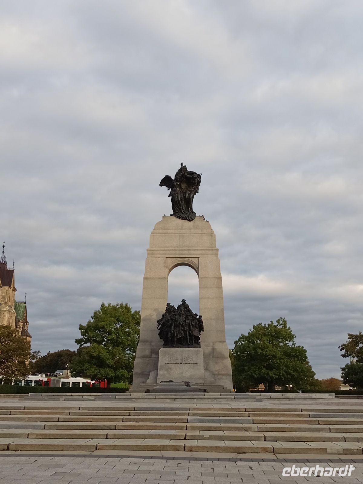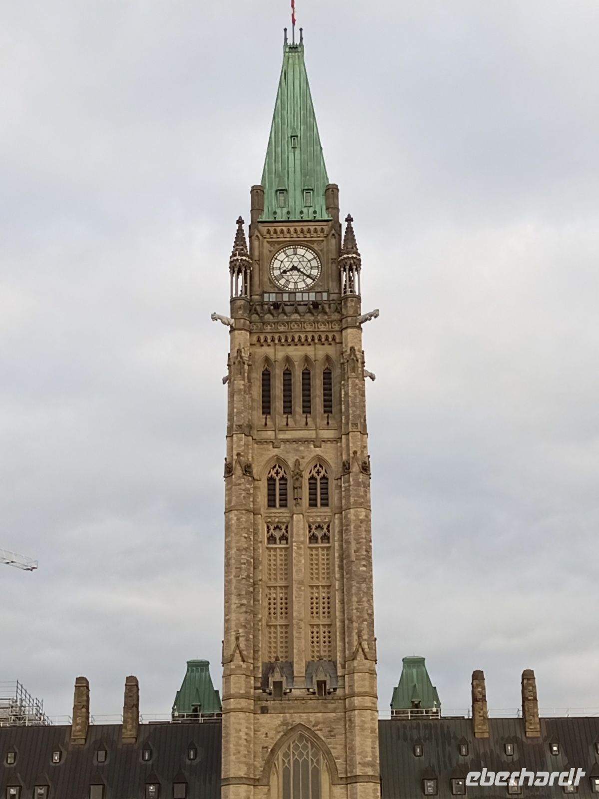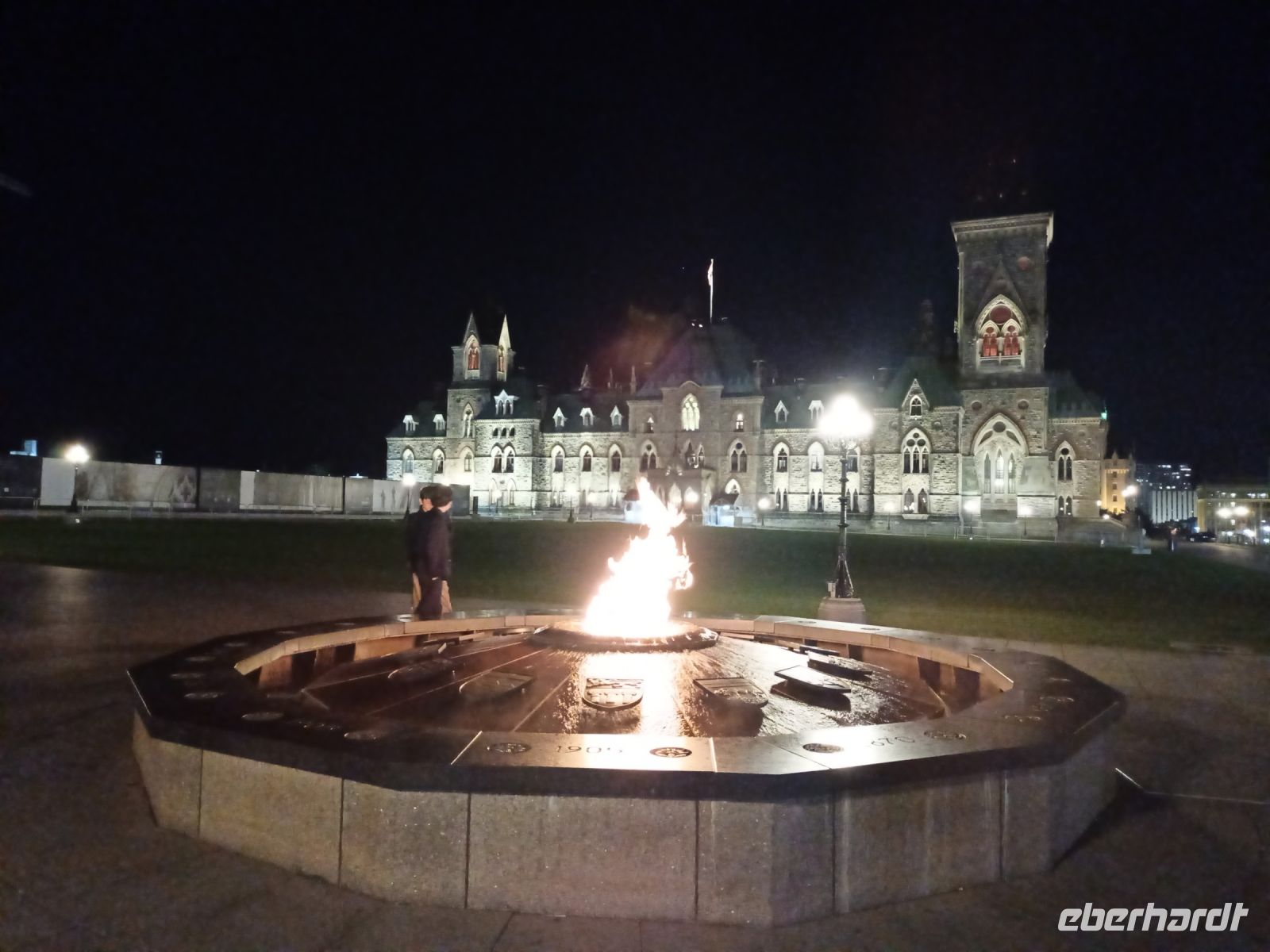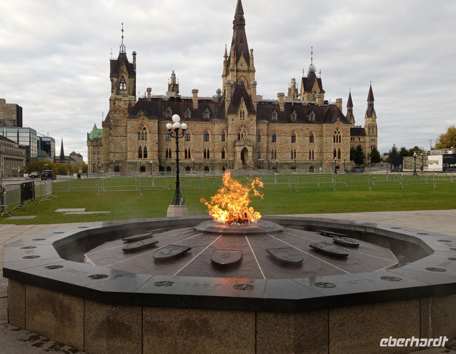 Wir nähern uns dem Parlament Hügel: Parliament Hill ist ein bedeutendes Symbol für die kanadische Regierung und Geschichte. Die Geschichte der Parlamentsgebäude geht auf die Jahre 1850-1860 zurück, wo man mit der Planung und Bau begonnen hat. Nachdem Königin Victoria Ottawa zur Hauptstadt Kanadas bestimmt hatte, begann man dieses Viertel zum Regierungsviertel umzubauen. Ein verheerender Brand im Jahre 1916 zerstörte allerdings große Teile des Centre Blocks. Von 1917 bis 1920 wurden die zerstörten Gebäude wieder mit mehr Abstand aufgebaut und mit Kupferdächern versehen. Wir bleiben an der – „Ewigen Flamme“ stehen, Marion erzählt uns die Geschichte: Die Ewige Flamme – auch als „Centennial Flame“ bekannt, wurde am Silvesterabend 1966 entzündet. Der Anlass war die Eröffnung der Feierlichkeiten zum 100-jährigen Bestehen der Kanadischen Konföderation. Auf dem Brunnen sind die Wappen und Namen der zehn Provinzen und drei Territorien Kanadas angebracht, wobei jede bronzene Plakette das Jahr des jeweiligen Beitritts zur Konföderation darstellt.