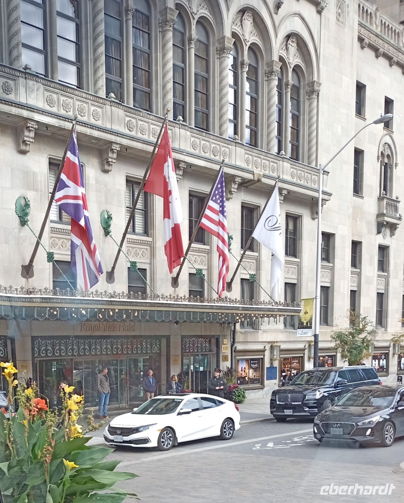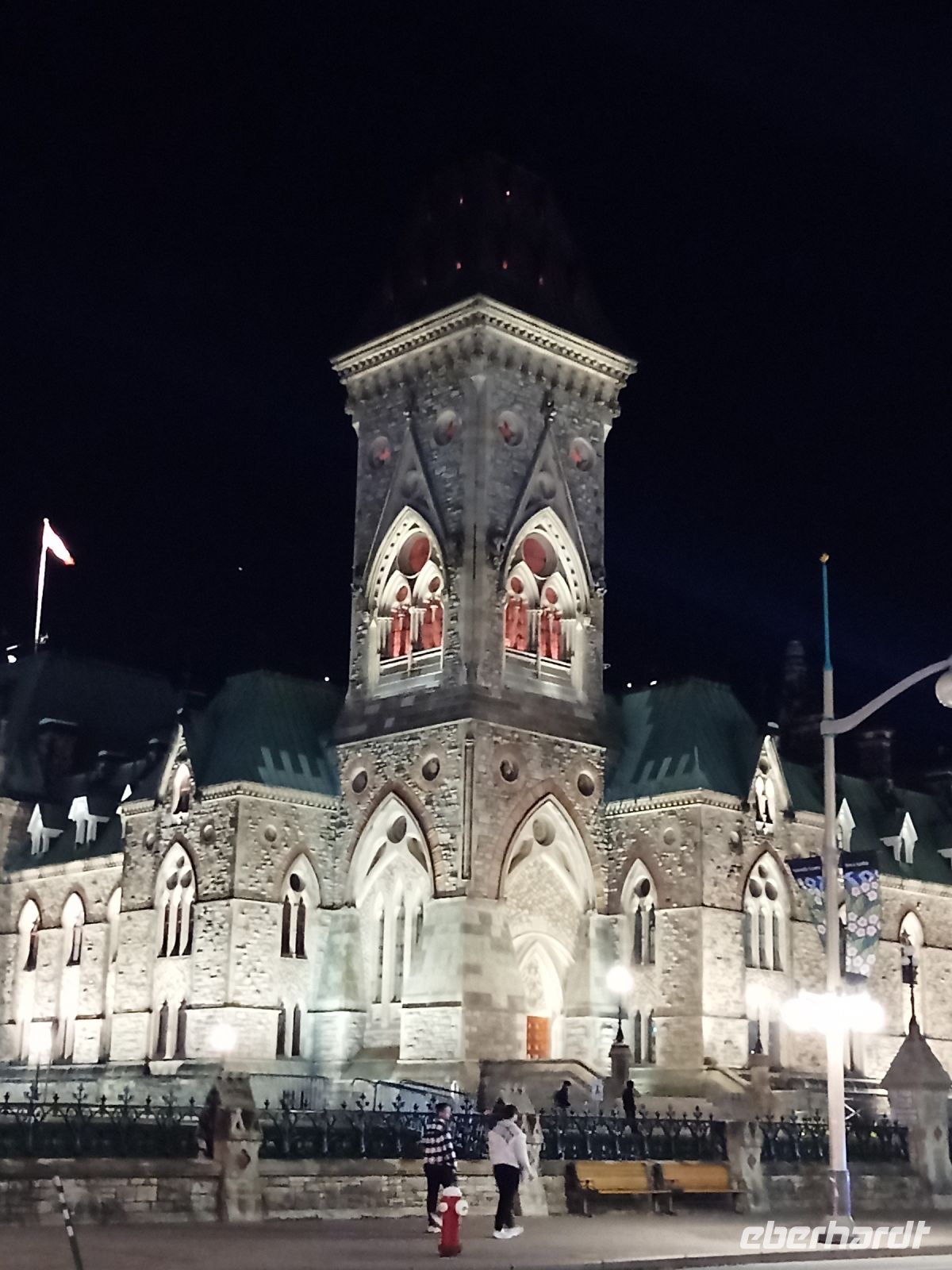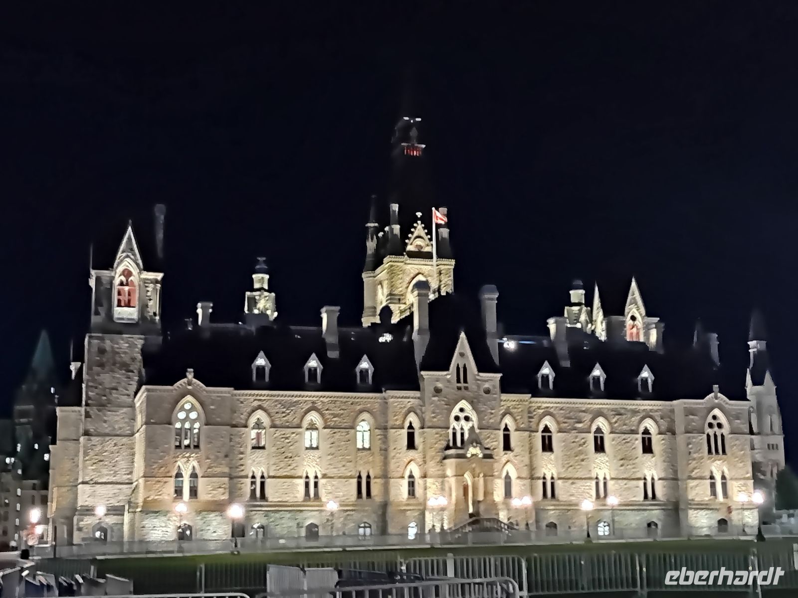 Jetzt aber los ins Lord Elgin Hotel, was unmittelbar in der Stadtmitte liegt und somit die wichtigsten Sehenswürdigkeiten fußläufig erreichbar sind. Da heute kein gemeinsames Abendessen geplant ist, gibt Marion den Gästen Tipps für Restaurants oder Einkaufsmöglichkeiten in unmittelbarer Nähe. Ich gehe noch mit meinem Fotoapparat auf eine nächtliche Fotoshooting-Tour zu Parliament Hills und Ewiger Flamme. Hier findet gerade eine Protestaktion gegen den Krieg im Nahost statt. Daher sind einige Teile von der Polizei abgesperrt. Auf dem Rückweg treffe ich noch unsere Gäste und wir teilen noch die Erlebnisse des Tages. Morgen erkunden wir die Hauptstadt Ottawa bei Tageslicht.