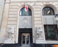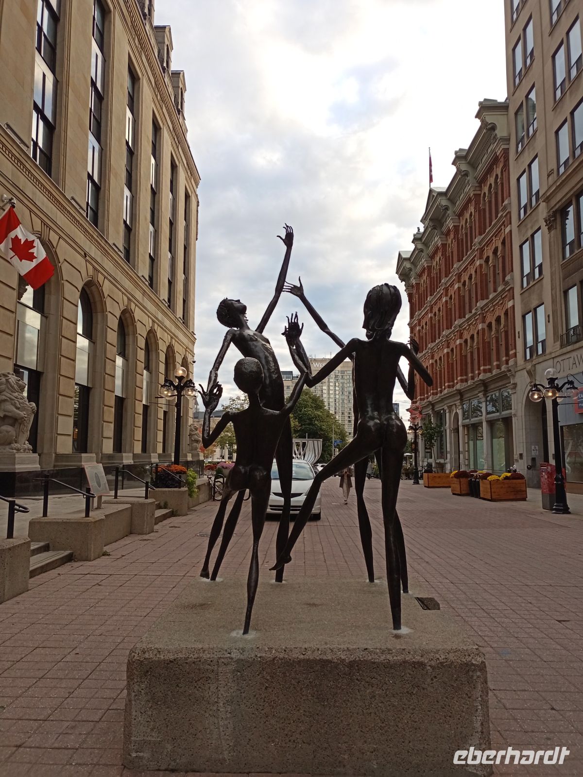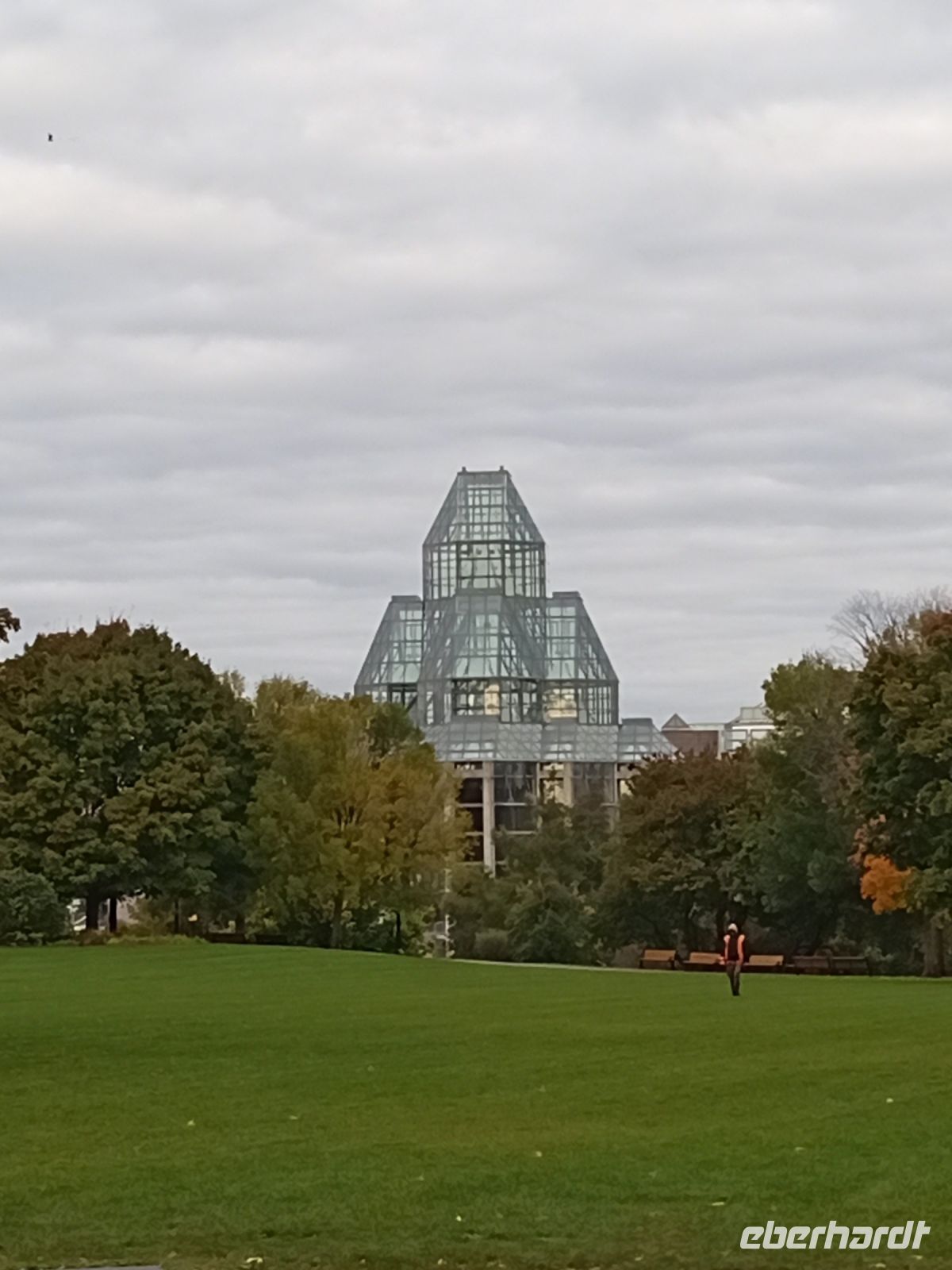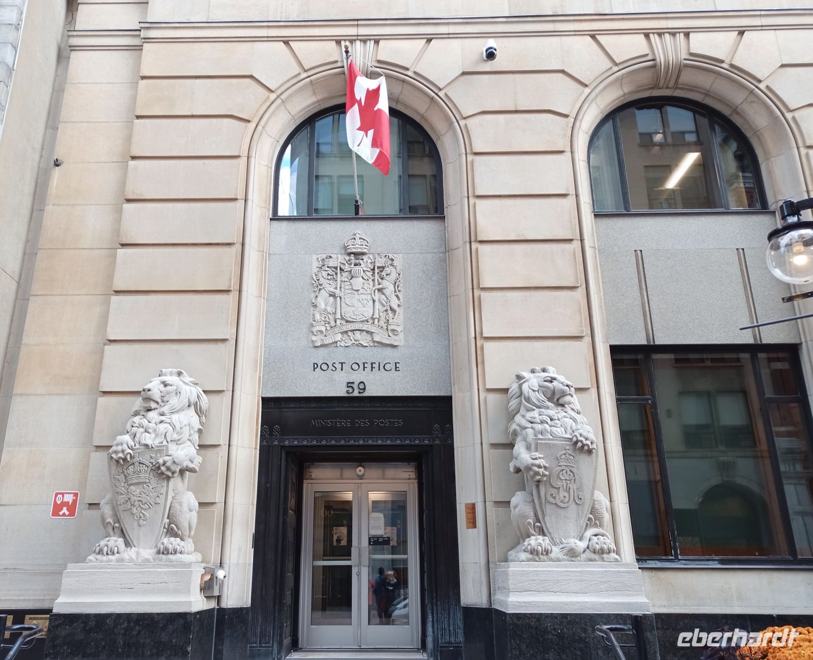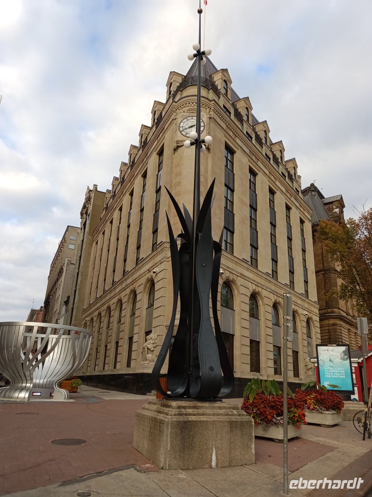 Nach einem wunderbaren Frühstück starten wir in den Tag, verabschieden uns von dem eleganten Lord Elgin Hotel, packen unsere Koffer in den Bus und erkunden Ottawa zunächst zu Fuß. Es ist noch etwas kühl und bedeckt, die Stadt wirkt noch etwas verschlafen. Marion führt uns durch die Straßen von Ottawa, zunächst durch die Sparkstreet. Hier steht am Anfang eine riesige Metallschale – was mag es wohl bedeuten? Das Lord Stanley's Gift Monument in Ottawa ist ein Denkmal zu Ehren des berühmten Stanley Cups, der begehrten Trophäe des Eishockeysports in Nordamerika. Das Monument zeigt eine überdimensionale Nachbildung des Cups, die symbolisch alle Eishockeyteams und Fans in Kanada repräsentiert, die den Stanley Cup seit über einem Jahrhundert feiern und sich um ihn bemühen. Wir gehen weiter durch die Sparkstreet, wo wir einige Stauen der modernen Kunst sehen, aber auch das historische Postgebäude aus dem Jahre 1939, das in einem sehr schönem Art-Deco-Stil gestaltet wurde.
