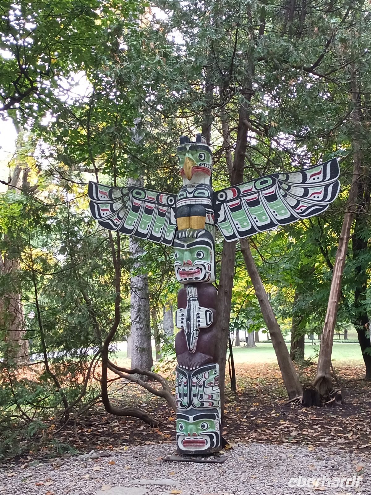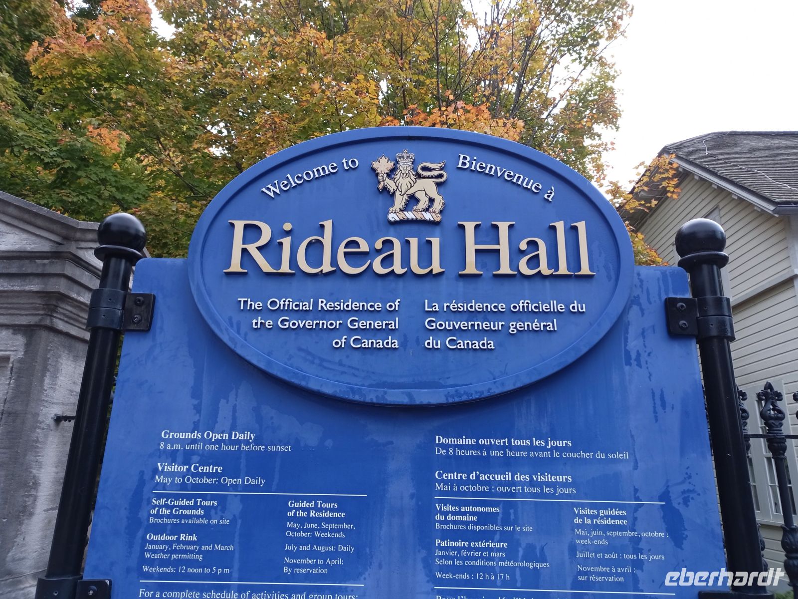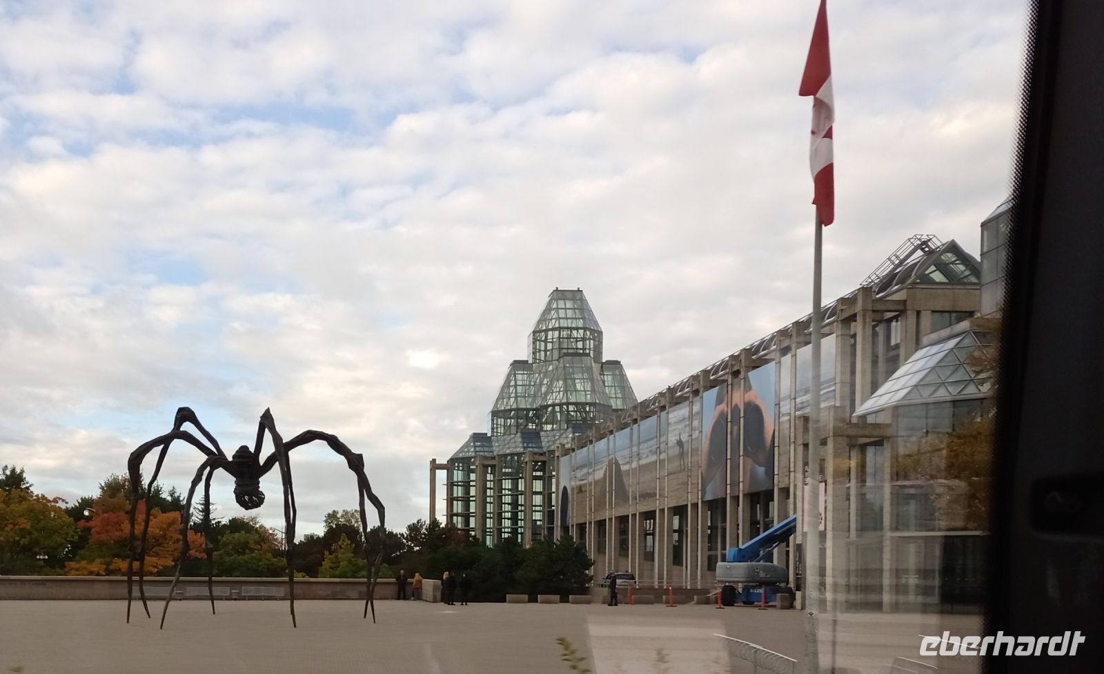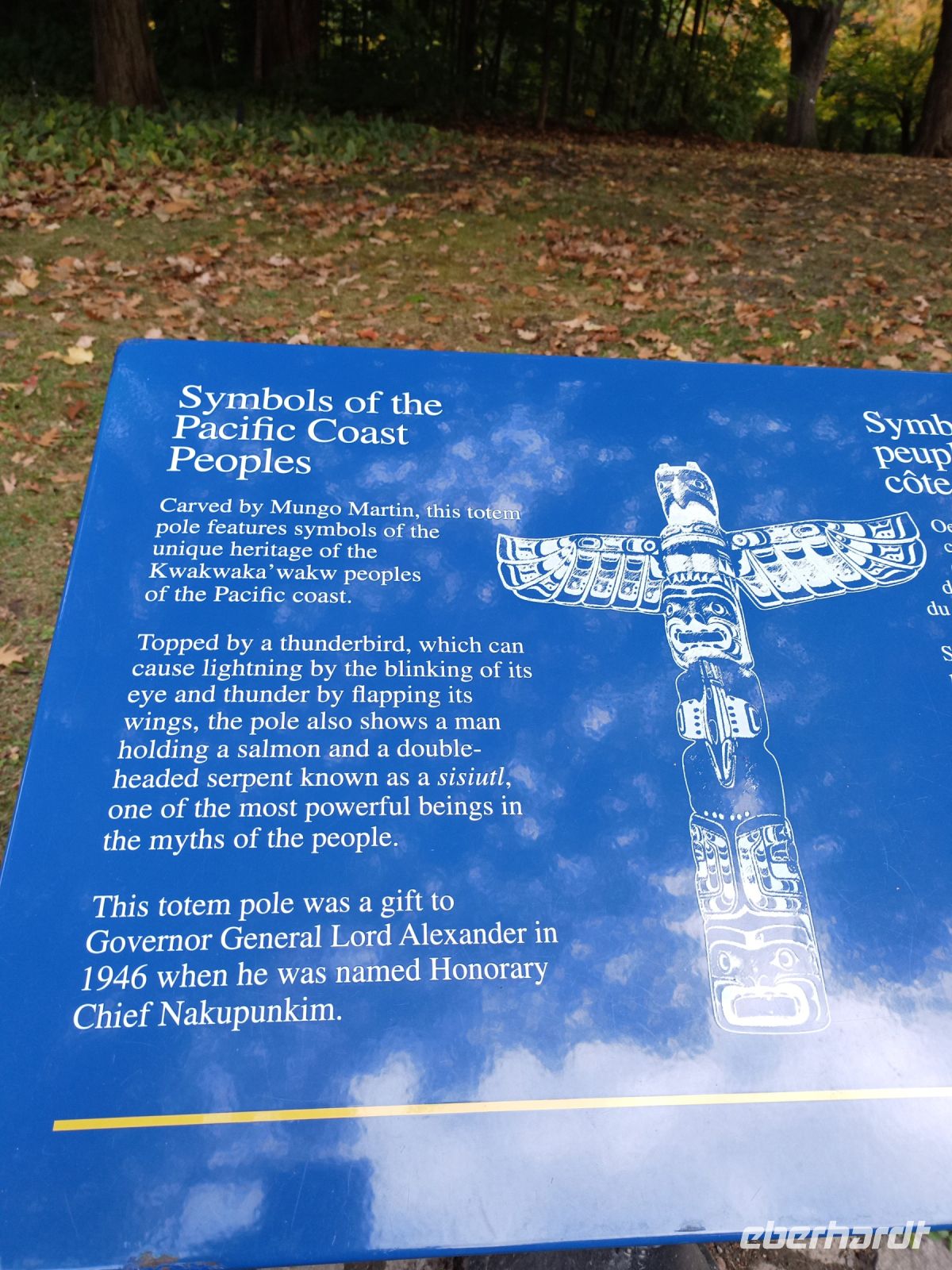Wir laufen weiter über den ByWard Market Place und machen ein paar Erinnerungsfotos am OTTAWA sign, bevor wir wieder in Bus steigen. Vom Bus sehen wir noch die Kathedrale Notre Dame, die Nationalgalerie und die berühmte Statue der Spinne – Maman – vor der Galerie. Wir fahren an den Botschaften und Konsulaten vorbei und machen noch ein Halt im Park vor dem Rideau Hall, das die offizielle Residenz des Generalgouverneurs von Kanada, ist und in einem Park von 32 Hektar liegt. Wir machen einen kleinen Spaziergang in einem Teil des Parks, der als - Canadian Heritage Garden bezeichnet wird. Hier befinden sie auch Bäume, die von einigen Persönlichkeiten - Staatsoberhäuptern und anderen wichtigen Gästen gepflanzt wurden. Wir finden hier Bäume, die von Bundespräsident Richard von Weizsäcker, Johannes Rau und Angela Merkel gepflanzt wurden. Bewundern noch die Totempfähle der Ersten Nationen, die ebenfalls in Park platziert sind.