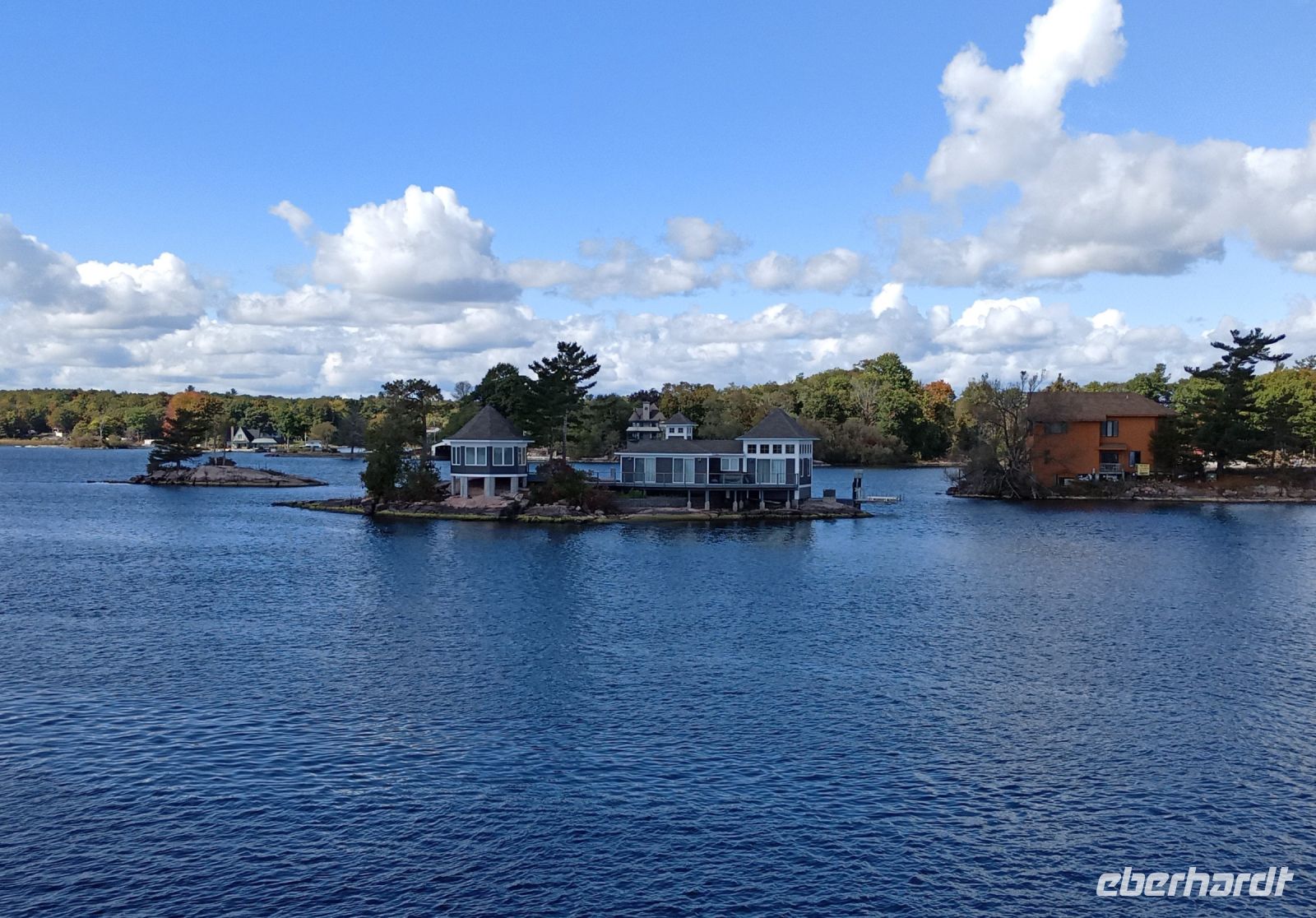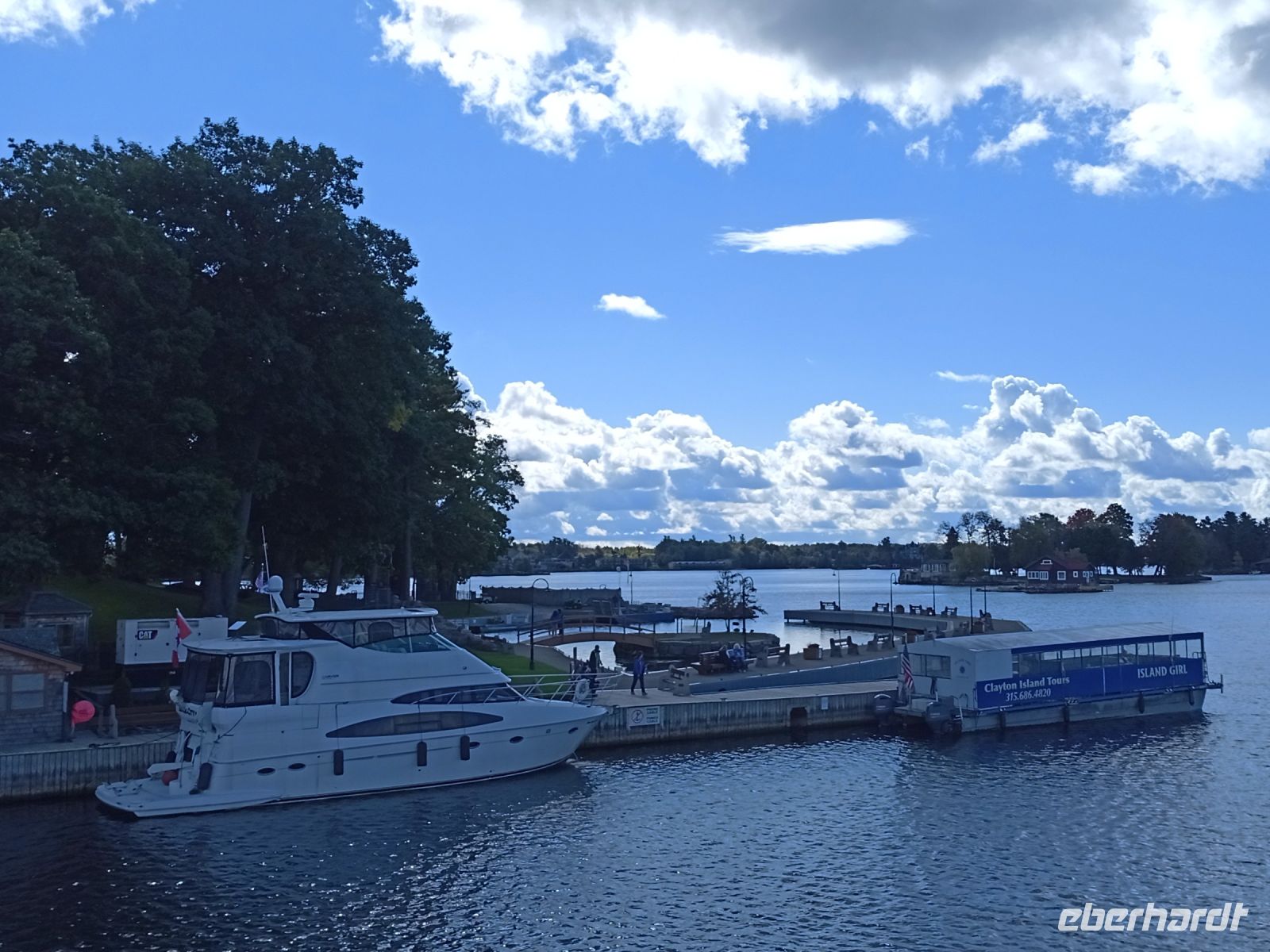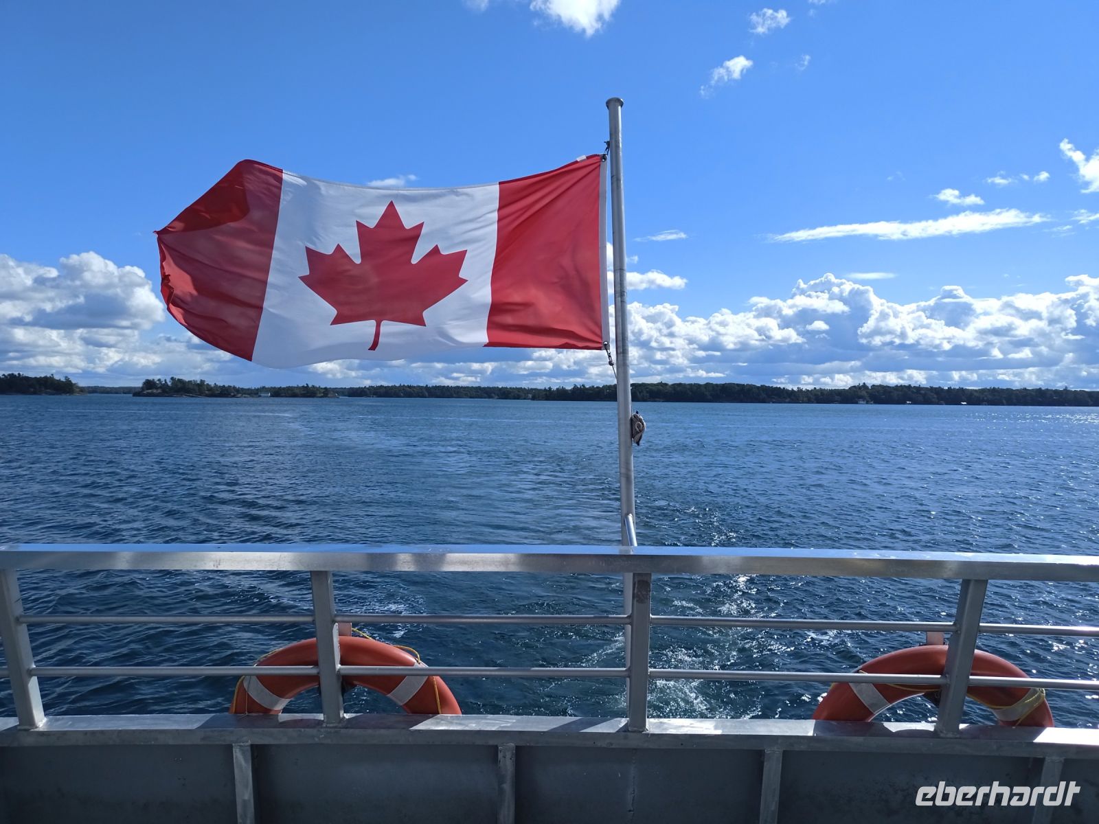 Jetzt geht es weiter Richtung 1000 Island. Nach etwa zwei Stunden erreichen wir die Anlegestelle für unsere Bootsfahrt in Rockport. Es ist etwas wärmer und die Sonne strahlt, wie bestellt für unser Bootsfahrt, auf eine wunderschöne Seenlandschaft. 1000 Insel hört sich fast etwas übertrieben an, aber in der Tat zählt die Inselgruppe etwa 1.800 Inseln, entlang des St.-Lorenz-Stroms und bilden die natürliche Grenze zwischen Ontario, Kanada, und USA. Es ist eine atemberaubende Landschaft, mit ganz kleinen oder größeren Inseln. Auf diesen stehen sehr schöne Ferienhäuser oder sogar ein kleines Schloss – Bold Castel. Der blaue Himmel und Wölkchen bescheren uns eine fantastische Kulisse, die sich alle paar Minuten ändert. Die Kanadische Flagge weht auf dem Heck des Ausflugsbootes und wir genießen die Stille und Ruhe am Wasser und bewundern die Inselchen und Häuschen rundum. Am Ende der Fahrt haben wir uns ein Mittagessen verdient, bevor es weiter Richtung Toronto geht.