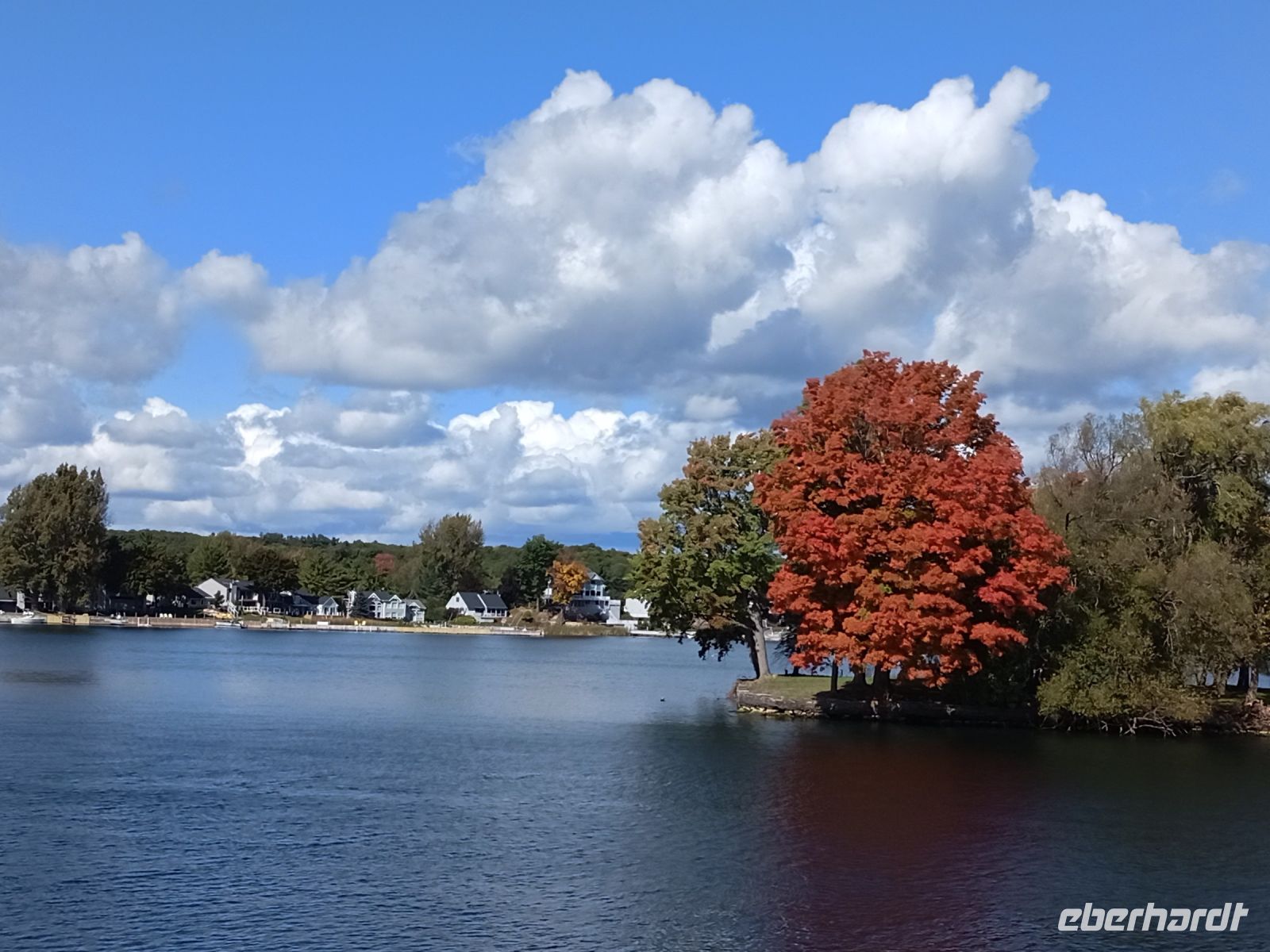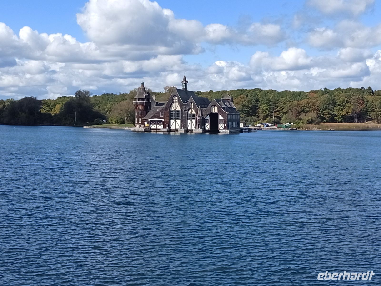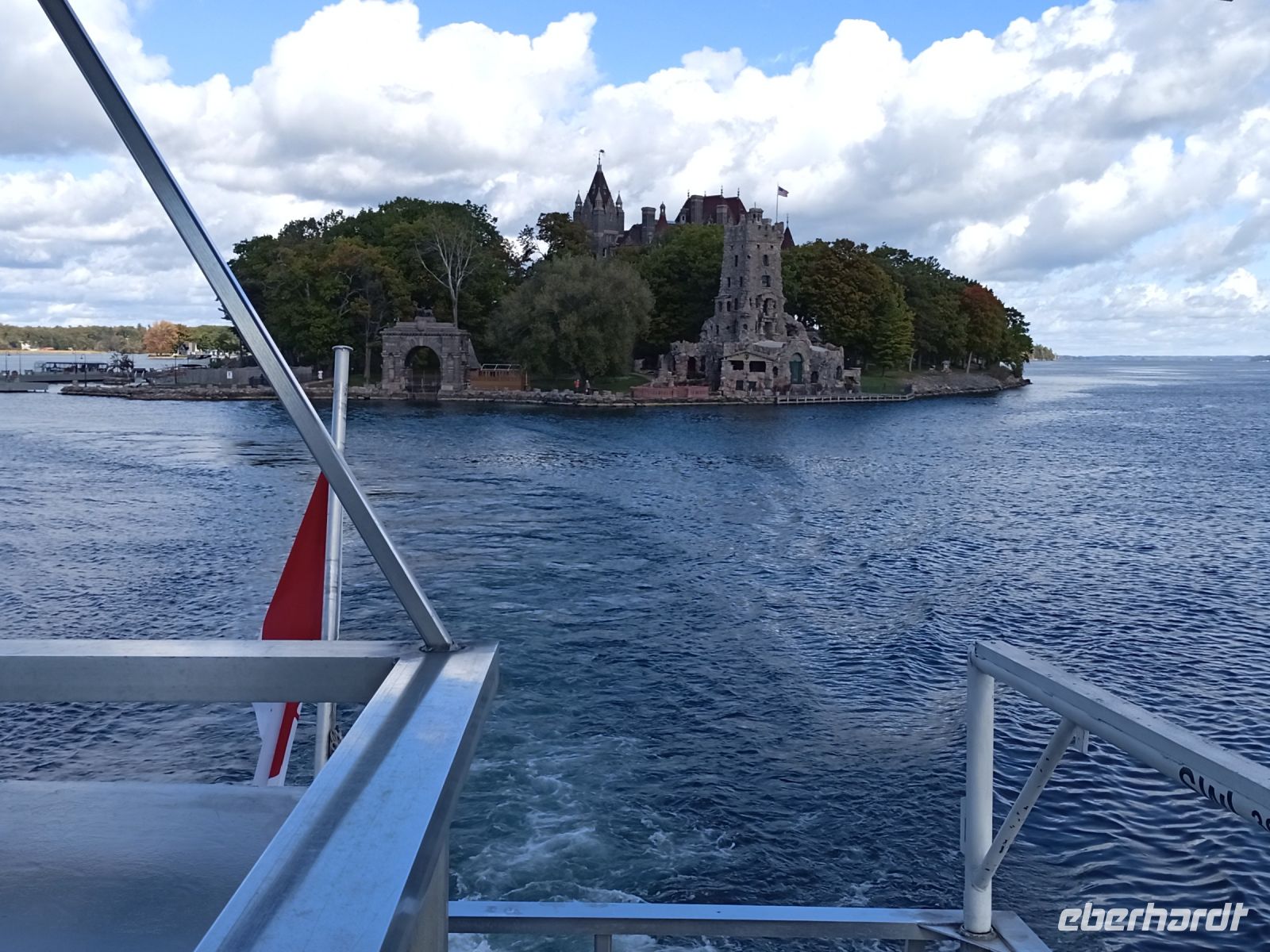Jetzt geht es weiter Richtung 1000 Island. Nach etwa zwei Stunden erreichen wir die Anlegestelle für unsere Bootsfahrt in Rockport. Es ist etwas wärmer und die Sonne strahlt, wie bestellt für unser Bootsfahrt, auf eine wunderschöne Seenlandschaft. 1000 Insel hört sich fast etwas übertrieben an, aber in der Tat zählt die Inselgruppe etwa 1.800 Inseln, entlang des St.-Lorenz-Stroms und bilden die natürliche Grenze zwischen Ontario, Kanada, und USA. Es ist eine atemberaubende Landschaft, mit ganz kleinen oder größeren Inseln. Auf diesen stehen sehr schöne Ferienhäuser oder sogar ein kleines Schloss – Bold Castel. Der blaue Himmel und Wölkchen bescheren uns eine fantastische Kulisse, die sich alle paar Minuten ändert. Die Kanadische Flagge weht auf dem Heck des Ausflugsbootes und wir genießen die Stille und Ruhe am Wasser und bewundern die Inselchen und Häuschen rundum. Am Ende der Fahrt haben wir uns ein Mittagessen verdient, bevor es weiter Richtung Toronto geht.