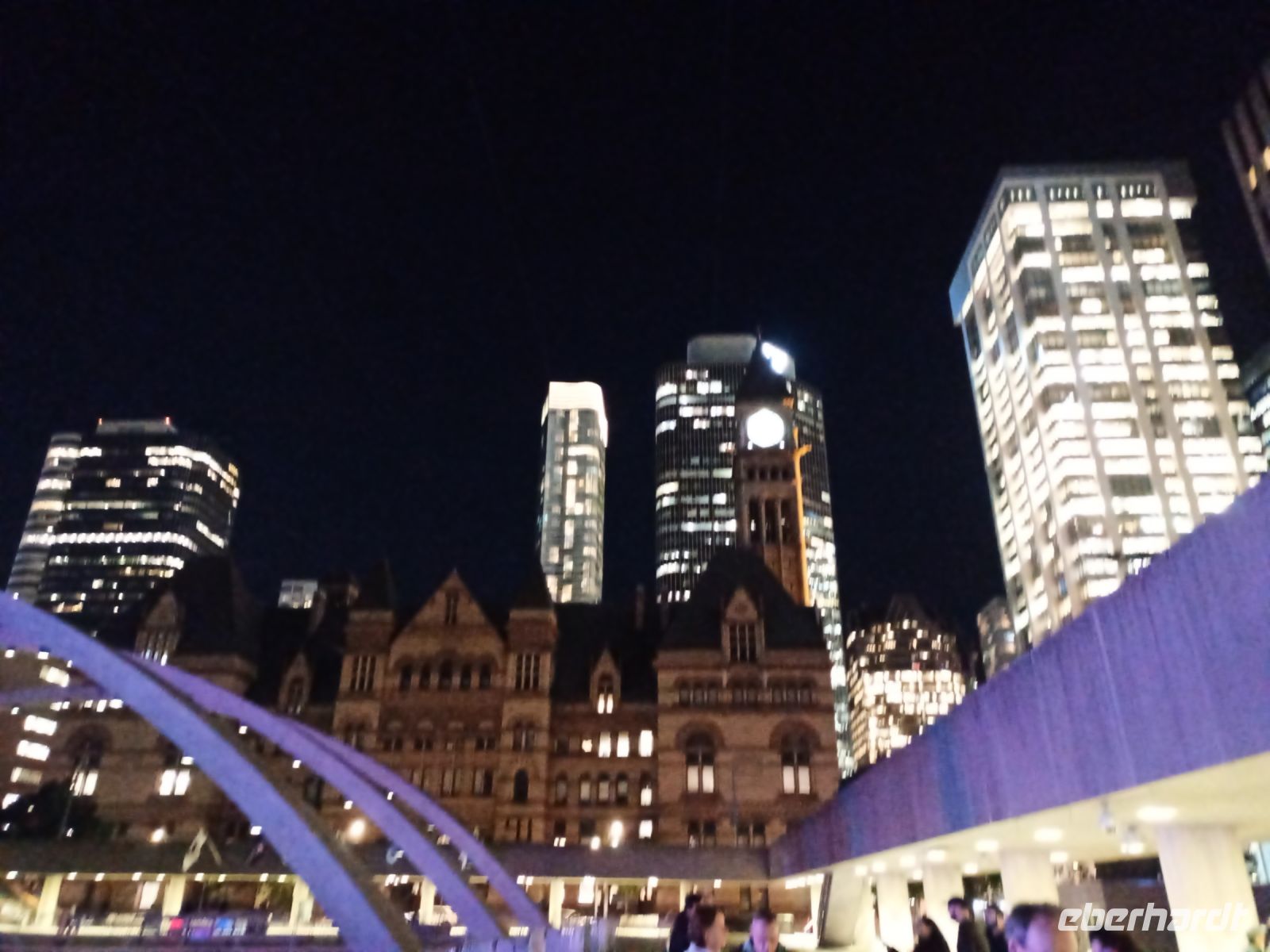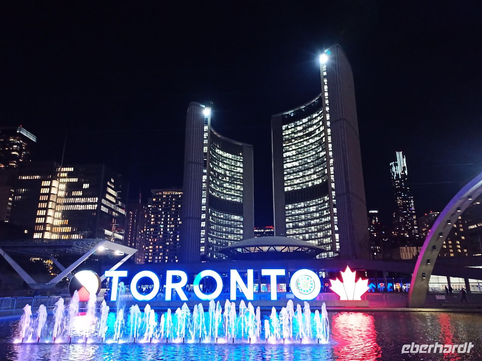 In der Abenddämmerung erreichen wir Kanadas größte Metropole Toronto. Was für ein Kontrastprogramm. Wir checken in unseren Hotel Chelsea mitten in der City ein. Ein Teil der Gruppe möchte ein Pub in der Nähe besuchen, ein Teil kommt mit mir; um die abendliche Beleuchtung vor dem Rathaus – der City Hall mit den markanten und farbenwechselnden TORONTO Schriftzug - zu sehen und ein paar bunte Fotos in die Fotoapparate einzufangen. Ein schöner Spaziergang entlang der Bay Street mitten der Skylines von Toronto. Auf dem Rückweg lassen wir den Abend in einem sehr gemütlichen Irisch Pub direkt am Hotel ausklingen und freuen uns, Toronto morgen bei Tageslicht zu erkunden.