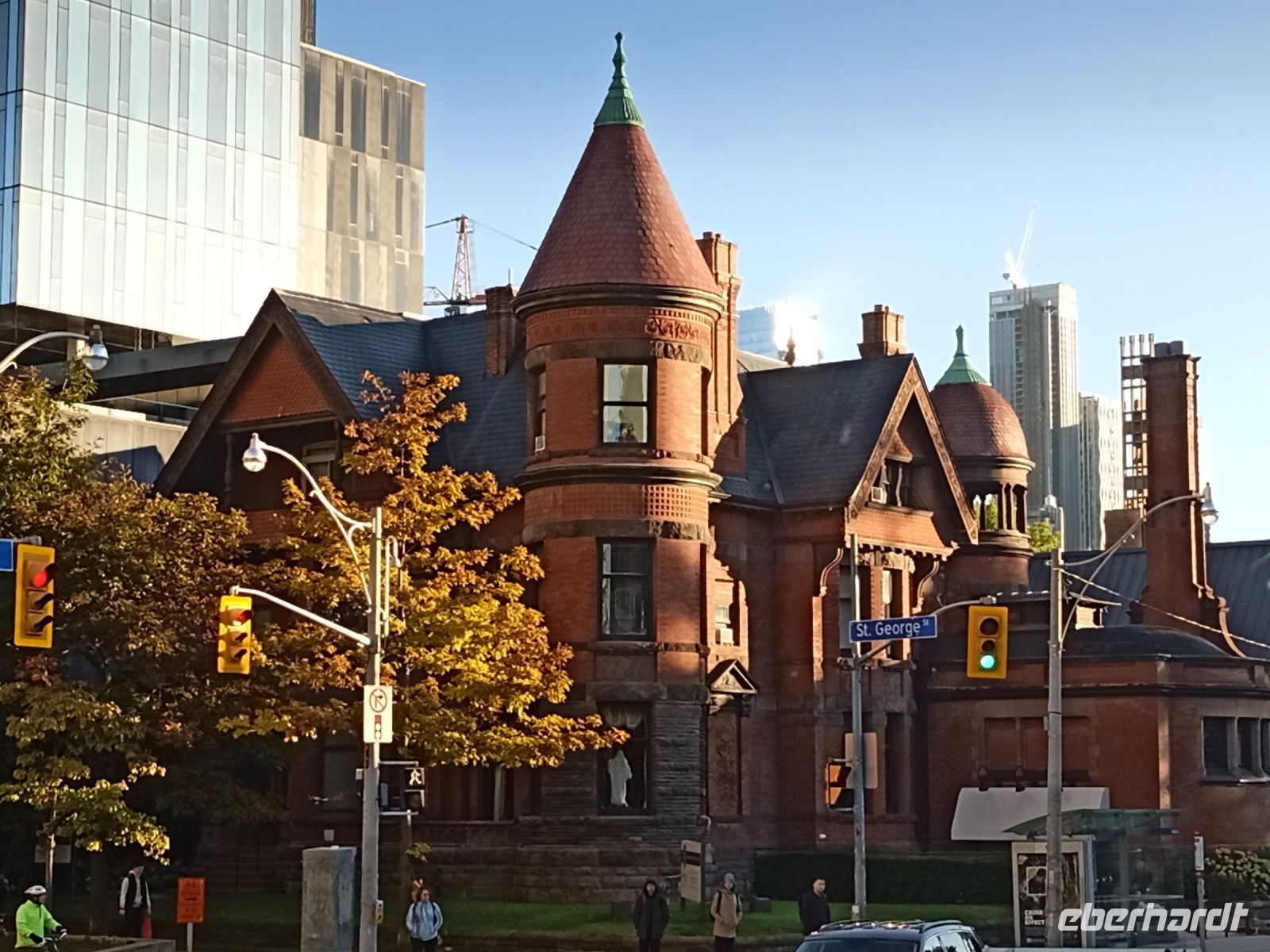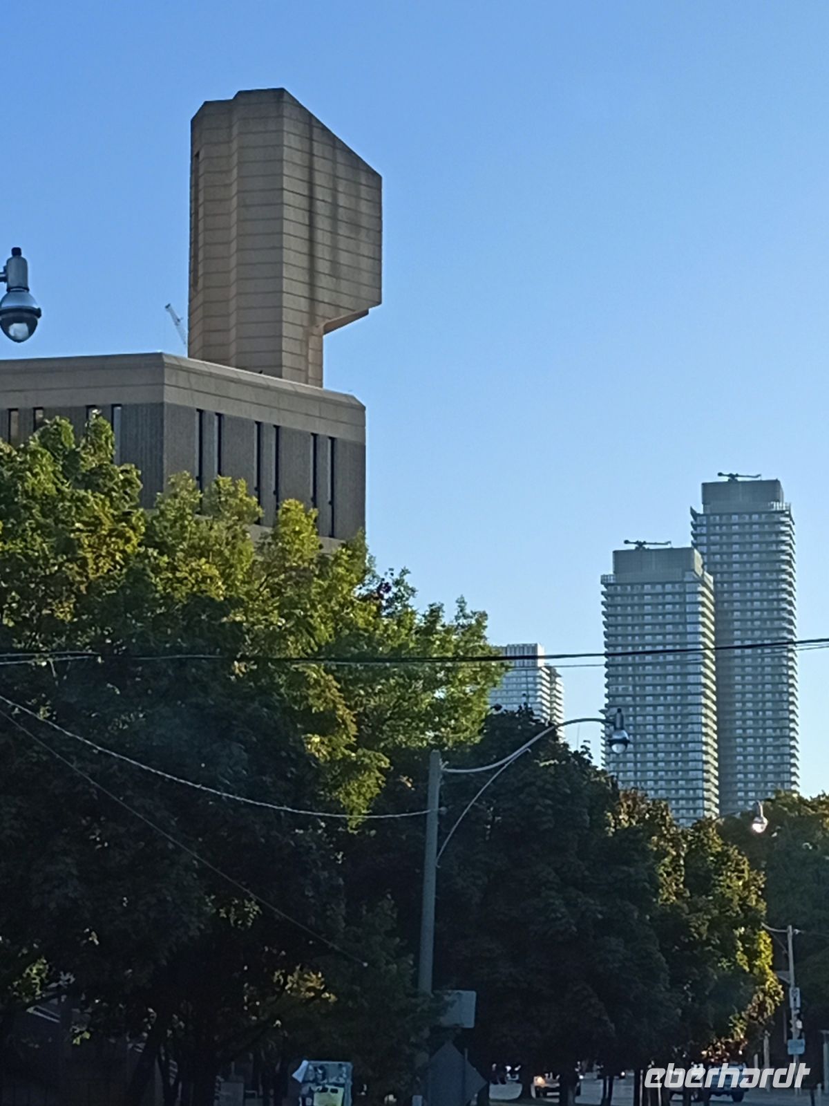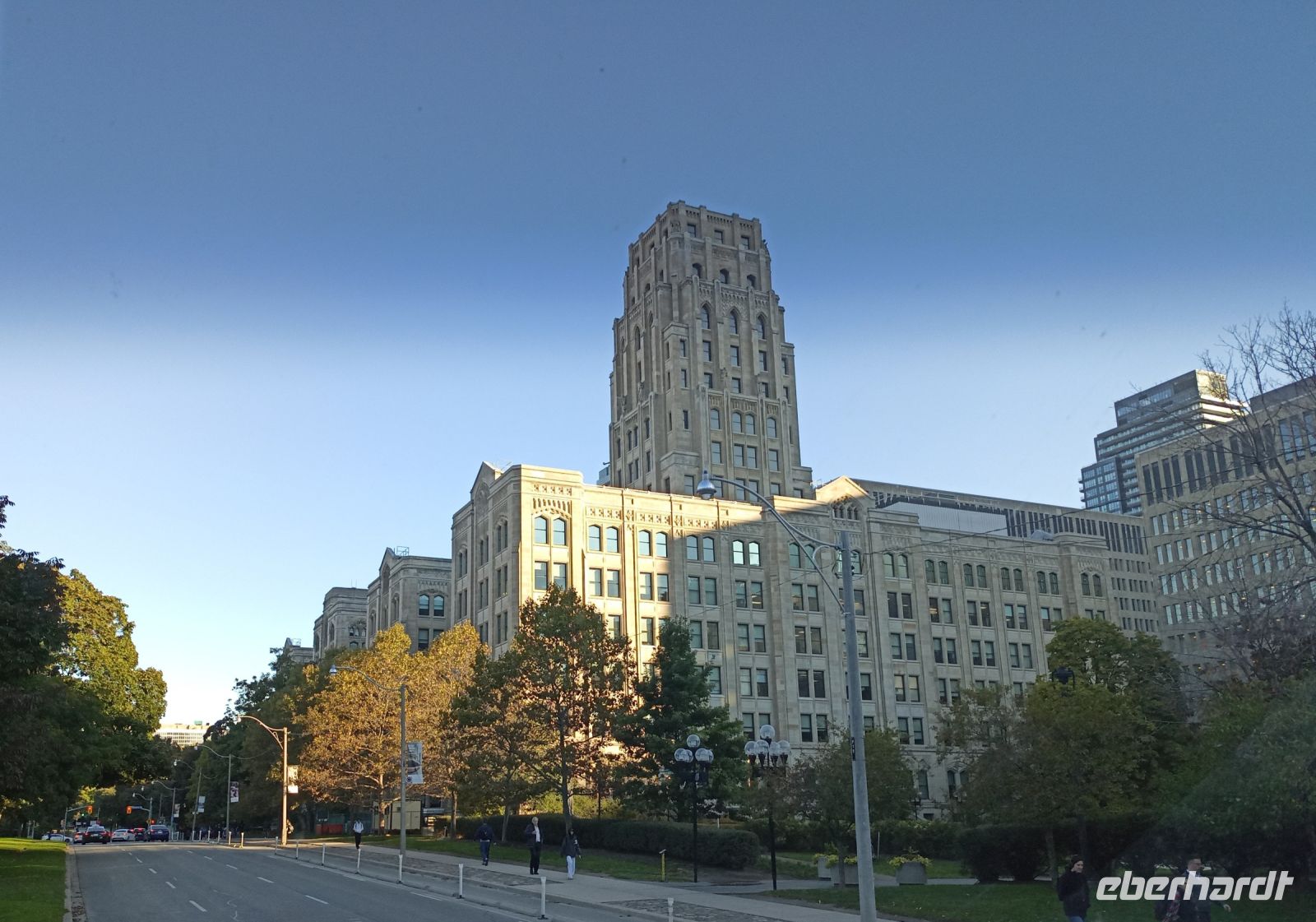 Wir machen uns mit dem Bus auf den Weg, da die Stadt recht weitläufig ist. Marion zeigt uns vom Bus einige interessante Stadteile und interessante Gebäude. Wir starten Richtung Bankenviertel, am alten und neuen Rathaus vorbei, dann fahren wir Richtung Universitäten Viertel. Toronto ist auch ein wichtiges Zentrum für Bildung und Entwicklung und beherbergt mehrere renommierte Universitäten. Die größte und bekannteste ist die Universität of Toronto und gehört zu den führenden Universitäten Kanadas und weltweit. Alleine diese Universität zählt etwa 64.000 Studierende.