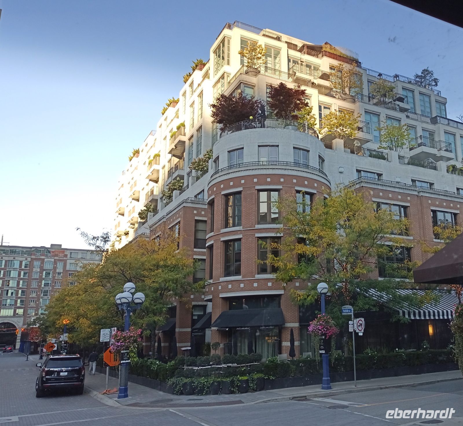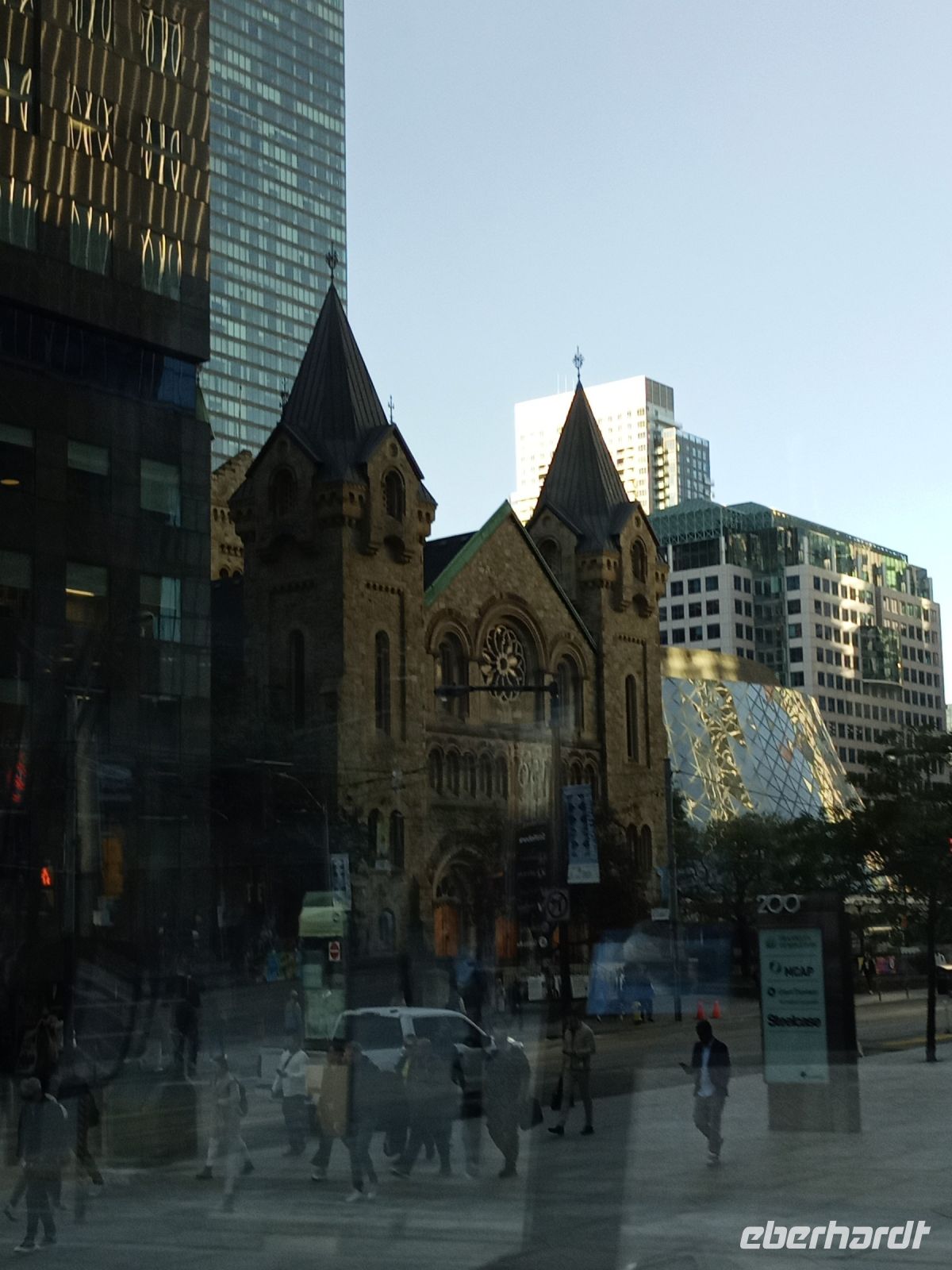 Auf dem Weg sehen wir immer wieder ein buntes Geflecht von Alt und Neu, wobei die neuen modernen Glashochhäuser überwiegen. Dennoch gibt es viele Parks, und kleine grüne Oasen zum Verweilen. Wir fahren auch über eine der China Towns in Toronto – es sieht wie eine Chinesische Stadt mitten im Toronto aus. Alle Beschriftungen sind auf Chinesisch. Nach offizieller Volkszählung von 2021 leben in der Metropolregion Toronto Area etwa 680.000 Personen chinesischer Abstammung.