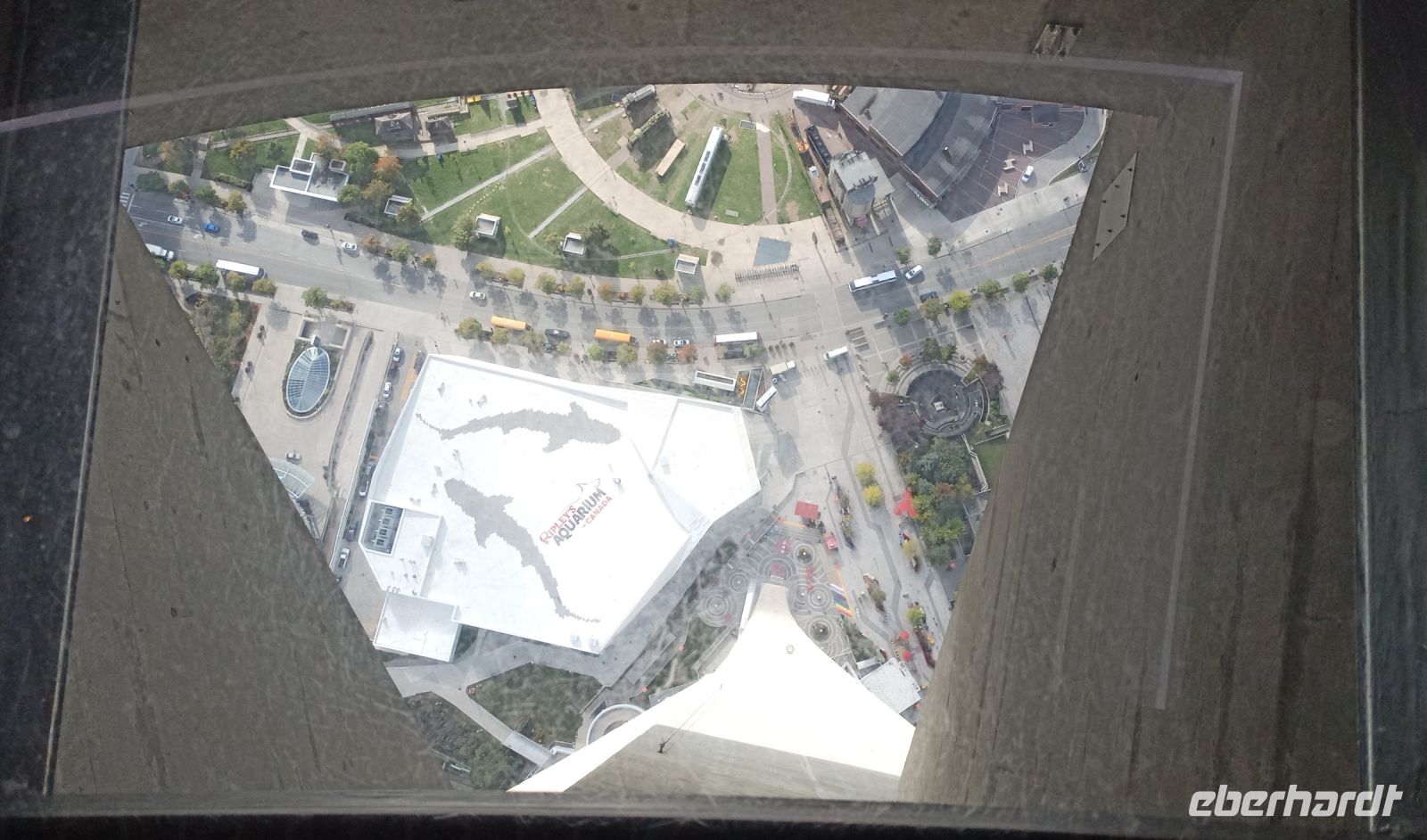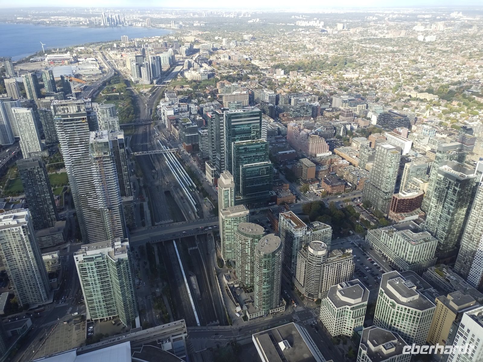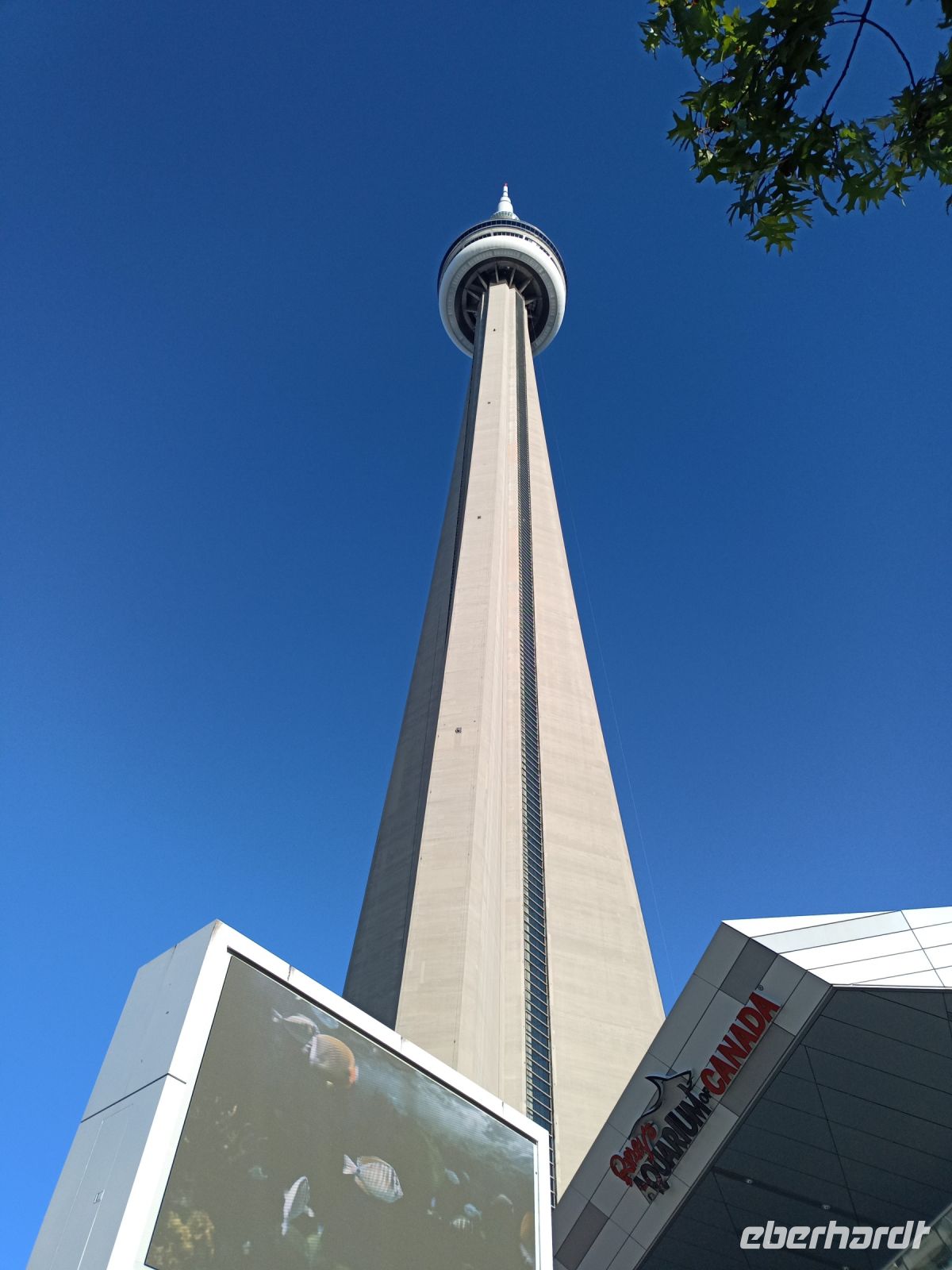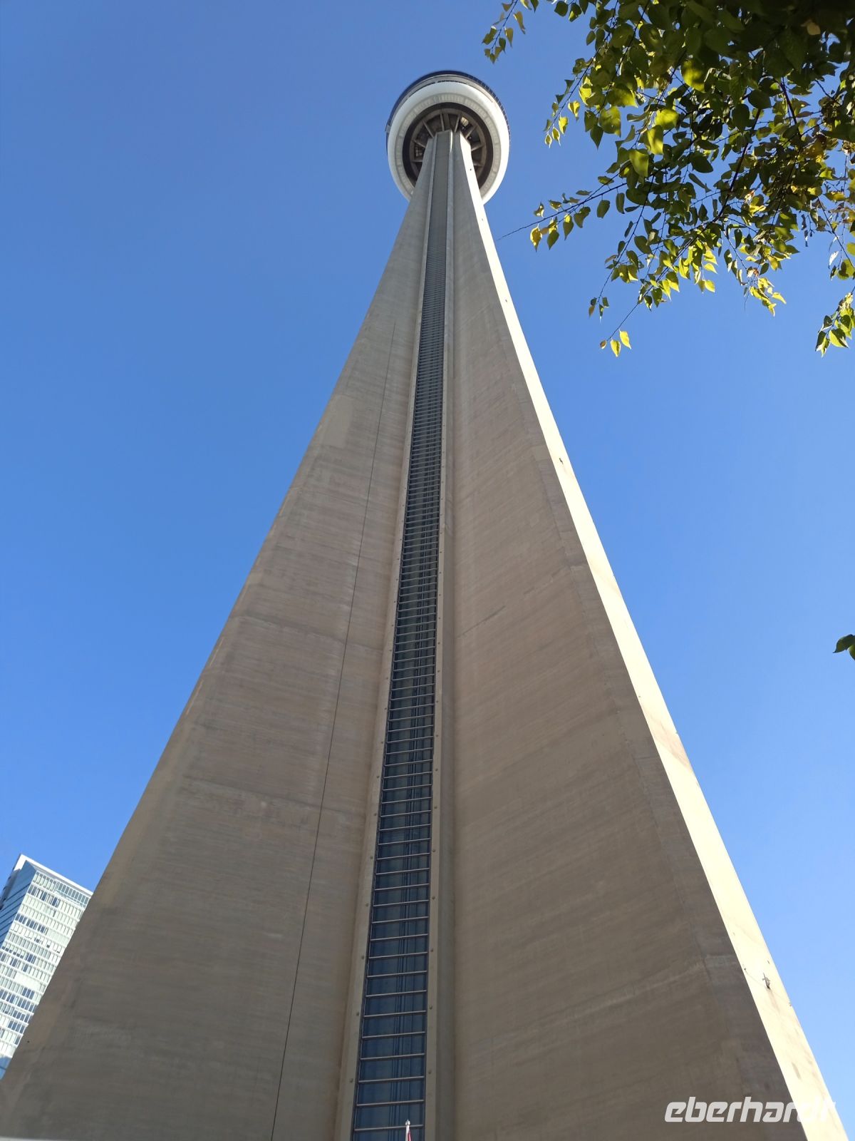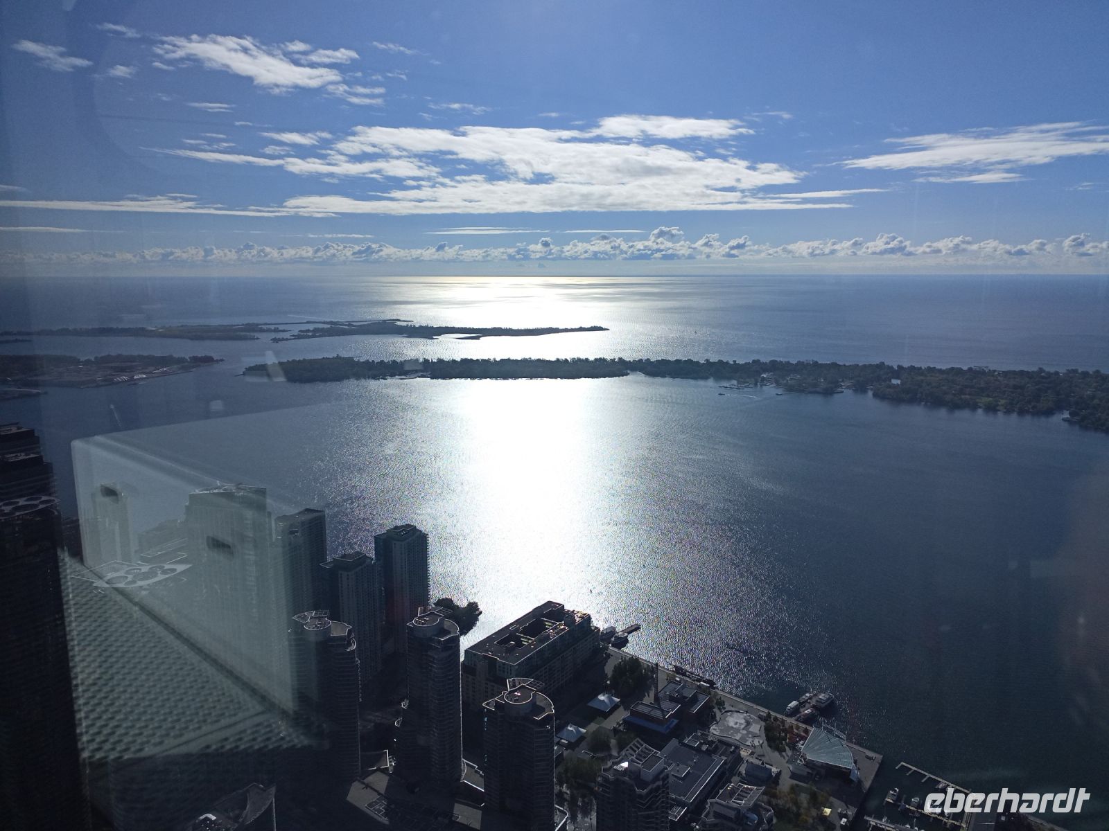 Jetzt aber in den Aufzug des CN Towers - offiziell „Canadian National Tower“. Der CN-Tower ist das Wahrzeichen der Stadt, mit einer Höhe von 553 Meter war er bis 2009 der höchste Fernsehturm der Welt und bis 2007 der höchste Turm der Welt. Zudem ist es das höchste freistehende und nicht abgespannte Bauwerk der Welt. Der Aufzug braucht gerade mal 60 Sekunden um die Aussichtsplattform in der Höhe von 346 Meter zu erreichen. Wir haben so ein Glück! - die Aussicht ist so klar, dass man meint jedes Hochhaus greifen zu können, wir sehen die Ausbreitung der Stadt, den Yachthafen und Ontario See. Wir laufen rund um die Aussichtsplattform und fotografieren von oben die wunderbare Kulisse der Stadt. Auch die Gäste wollen ein Porträt vor dieser außergewöhnlichen Kulisse als Erinnerung haben.