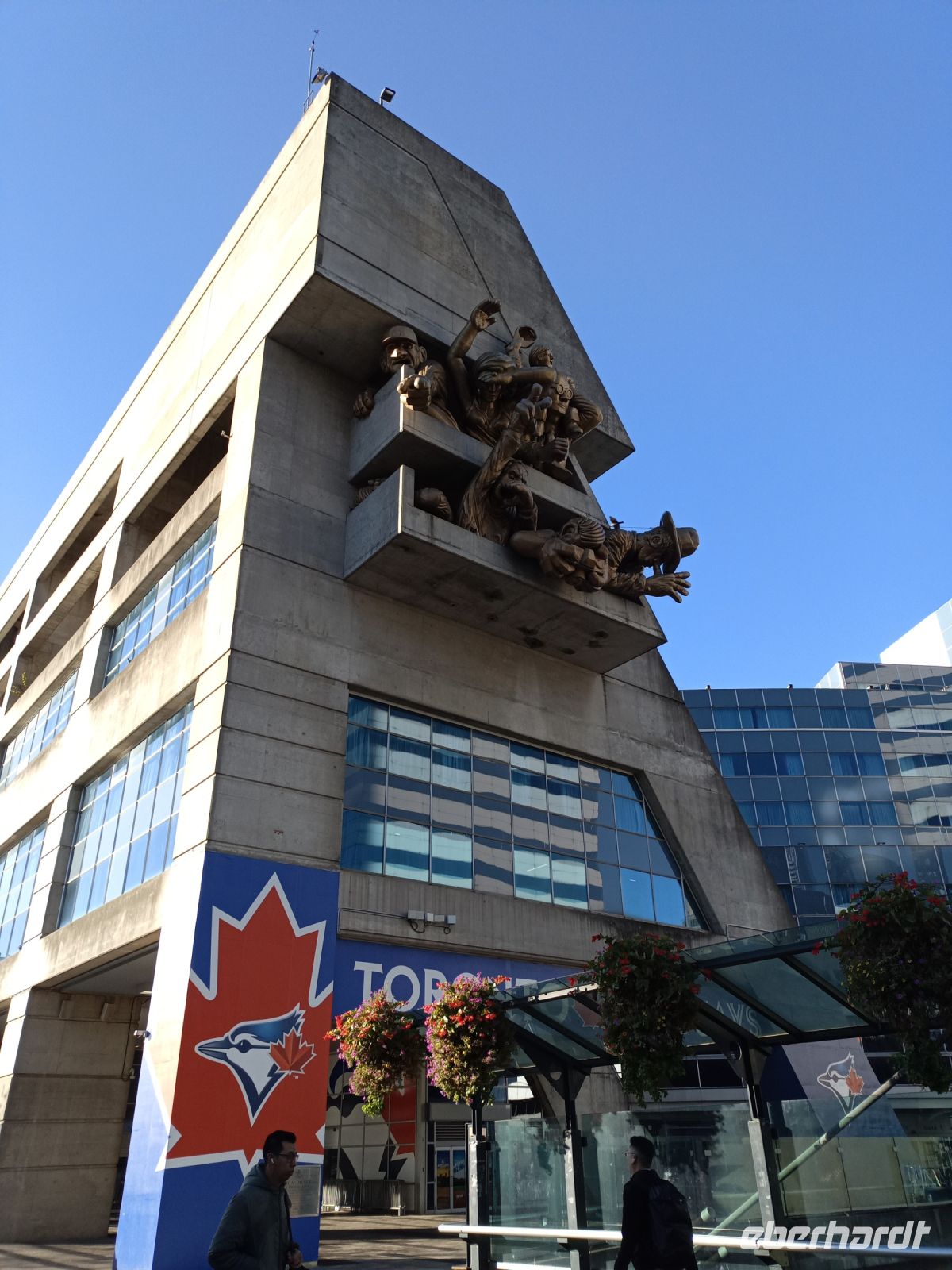 Nach der Runde fahren wir zum CN Tower. Auf Wunsch der Gäste haben wir den Besuch von CN Tower zusätzlich organisiert und das hat sich gelohnt. Wir haben noch ein paar Minuten Zeit und so betrachten wir von der Brücke - Rod Robbie Bridge - die Skulpturen „The Audience“ von Michael Snow auf der Rückseite des Roger Centrum. Sie sollen die Energie und den Geist der Fans zeigen, die die Stimmung in das Stadion bringen. Das Roger Center (früher als SkyDome bekannt) wurde 1989 eröffnet und beinruckte weltweit mit dem ersten voll beweglichen, motorisierten Dach, das bei jedem Wetter Veranstaltungen ermöglicht. Es hat eine Kapazität von 49.000 Sitzplätzen. Neben Baseballspielen finden hier auch Konzerte, Messen und andere Veranstaltungen statt.