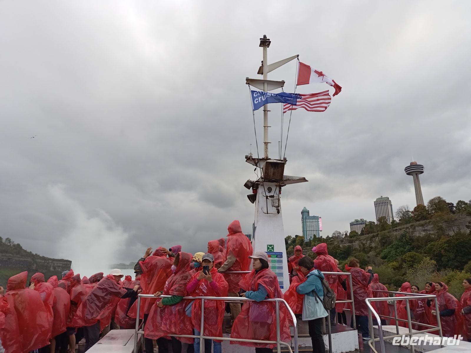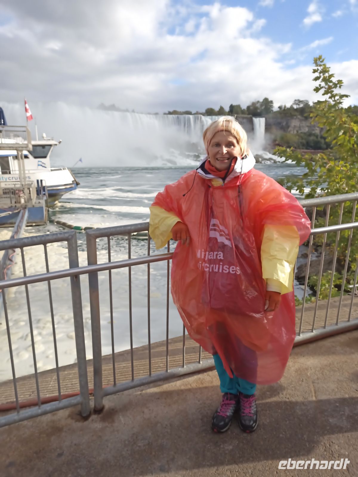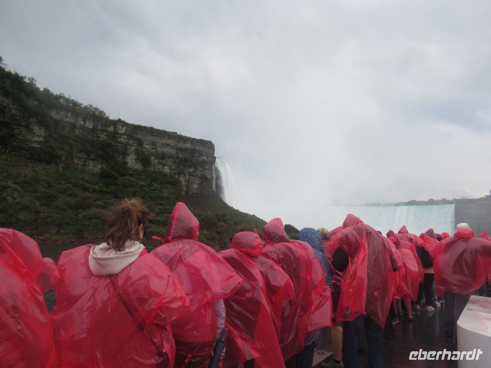 Leider ziehen einige Wolken heran und es beginnt zu tröpfeln – aber das ist eigentlich auch egal – denn wir werden sowieso etwas nass. Angekommen an der Anlegestelle von dem Schiff – hier werden wir mit roten Regencapes ausgestattet und schon geht es los. Wir amüsieren uns beim Anblick auf unsere „Verkleidung“, die aber durch etwas Wind wenig hilfreich ist. Die Niagara-Dusche kommt… Es ist ein überwältigendes Erlebnis so „hautnah“ zu erleben, wie die Massen von Wasser runterdonnern. Erst sehen wir den USA-Teil der Niagaras, die ca. 32 Meter hoch sind und dann den kanadischen Hufeisen „Horseshoe Falls“ die 57 hoch sind. Ein Naturerlebnis vom Feinsten. Nicht um sonst sind Niagara eines der berühmtesten Naturwunder der Welt, das jährlich Millionen von Besuchern aus aller Welt anzieht.