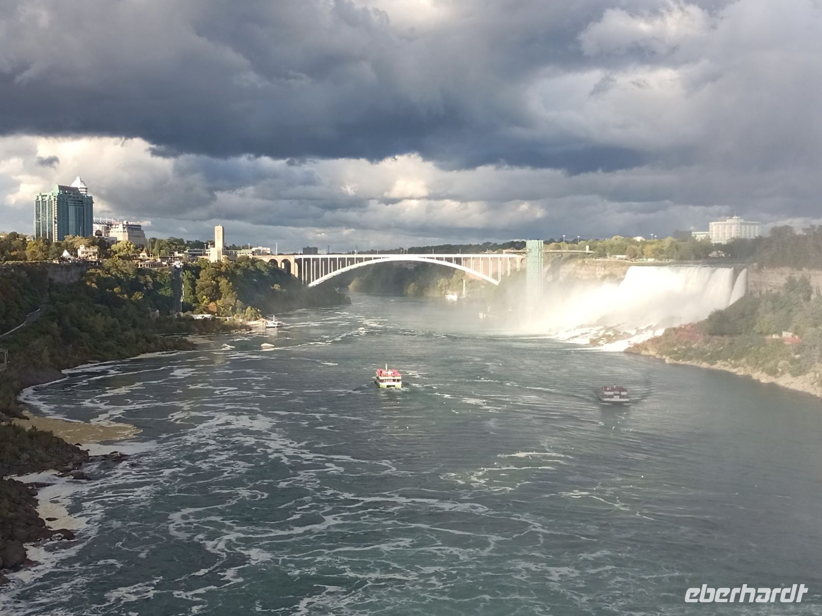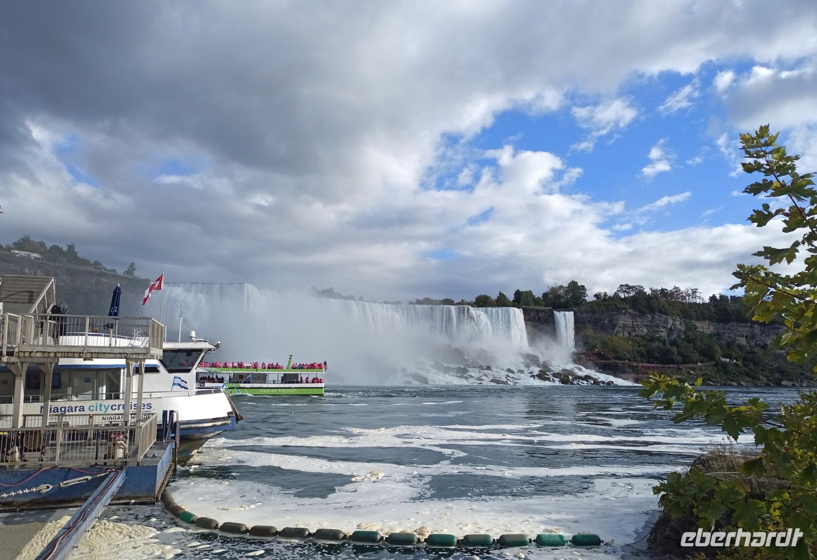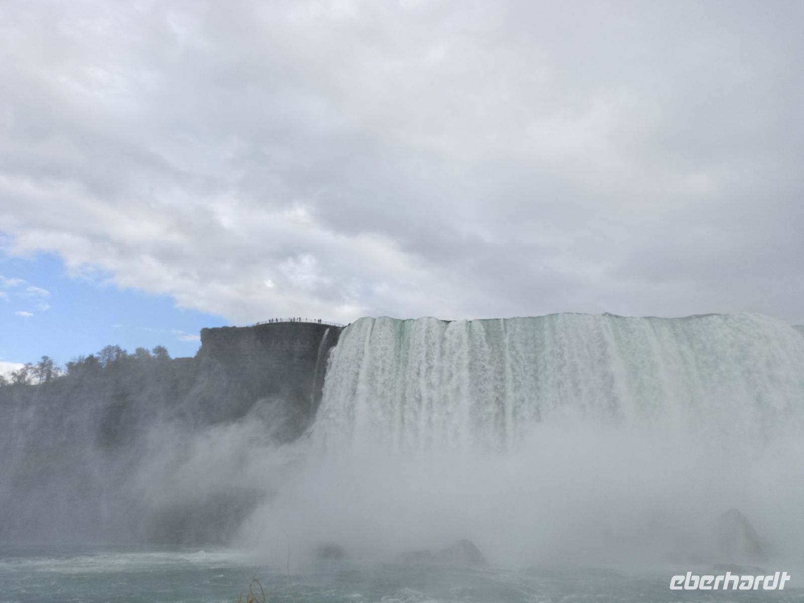 Leider ziehen einige Wolken heran und es beginnt zu tröpfeln – aber das ist eigentlich auch egal – denn wir werden sowieso etwas nass. Angekommen an der Anlegestelle von dem Schiff – hier werden wir mit roten Regencapes ausgestattet und schon geht es los. Wir amüsieren uns beim Anblick auf unsere „Verkleidung“, die aber durch etwas Wind wenig hilfreich ist. Die Niagara-Dusche kommt… Es ist ein überwältigendes Erlebnis so „hautnah“ zu erleben, wie die Massen von Wasser runterdonnern. Erst sehen wir den USA-Teil der Niagaras, die ca. 32 Meter hoch sind und dann den kanadischen Hufeisen „Horseshoe Falls“ die 57 hoch sind. Ein Naturerlebnis vom Feinsten. Nicht um sonst sind Niagara eines der berühmtesten Naturwunder der Welt, das jährlich Millionen von Besuchern aus aller Welt anzieht.