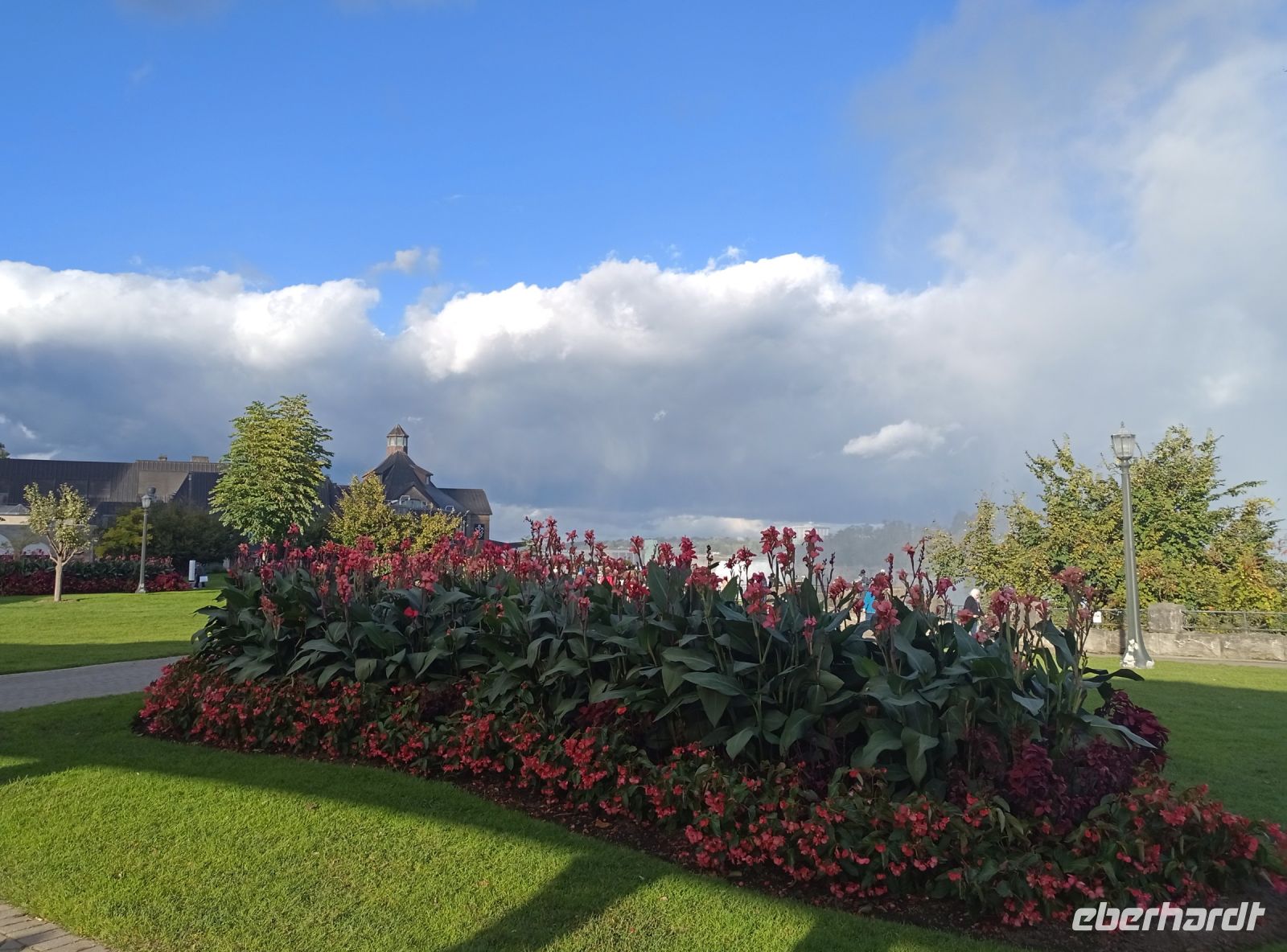 Unser Ziel sind die Butchart Gardens, ein berühmter privater botanischer Garten, der mit seiner Farbenpracht und Vielfalt beeindruckt. Da wir morgen den Flug zurück nach Deutschland antreten (müssen), erledigen einige Gäste das Online Check hier im Restaurant des Gartens, wo Wlan verfügbar ist, um sich Wunschplätze für den langen Flug zu sichern.