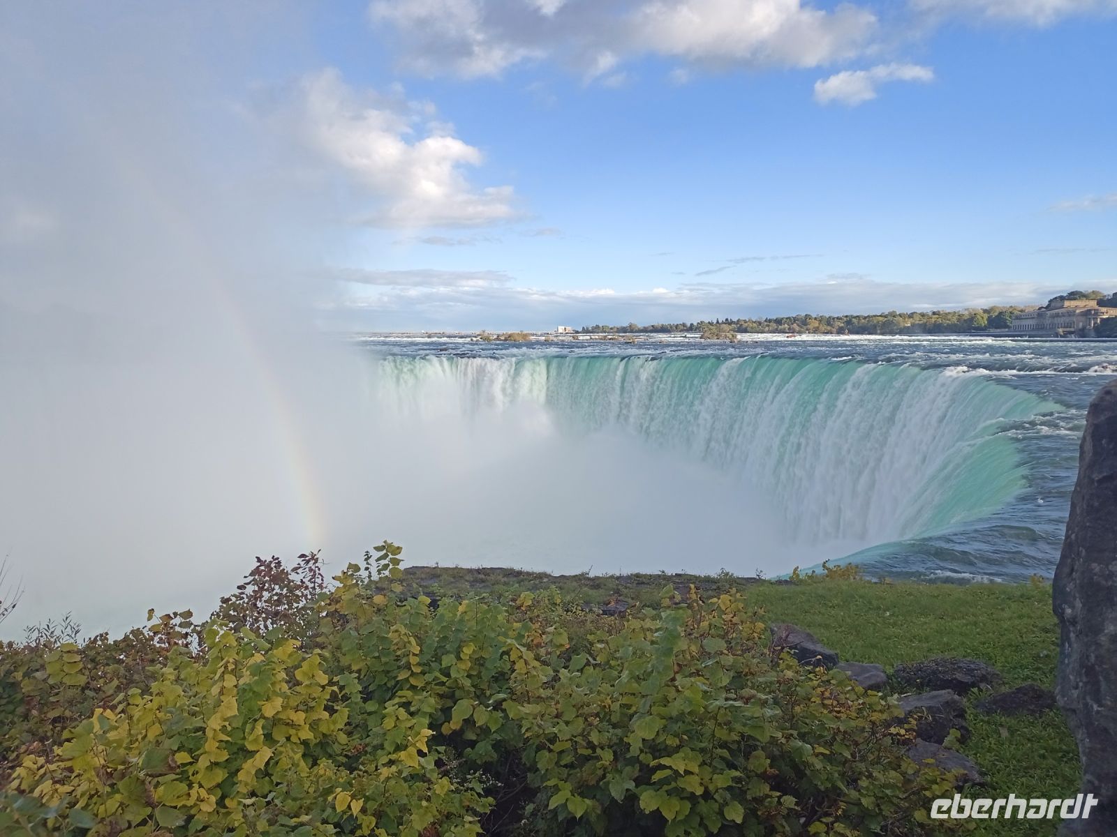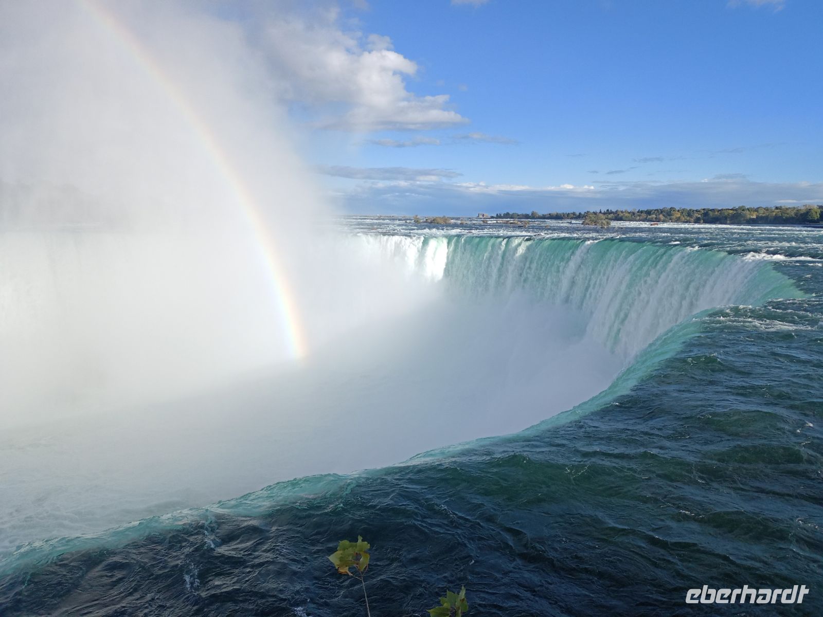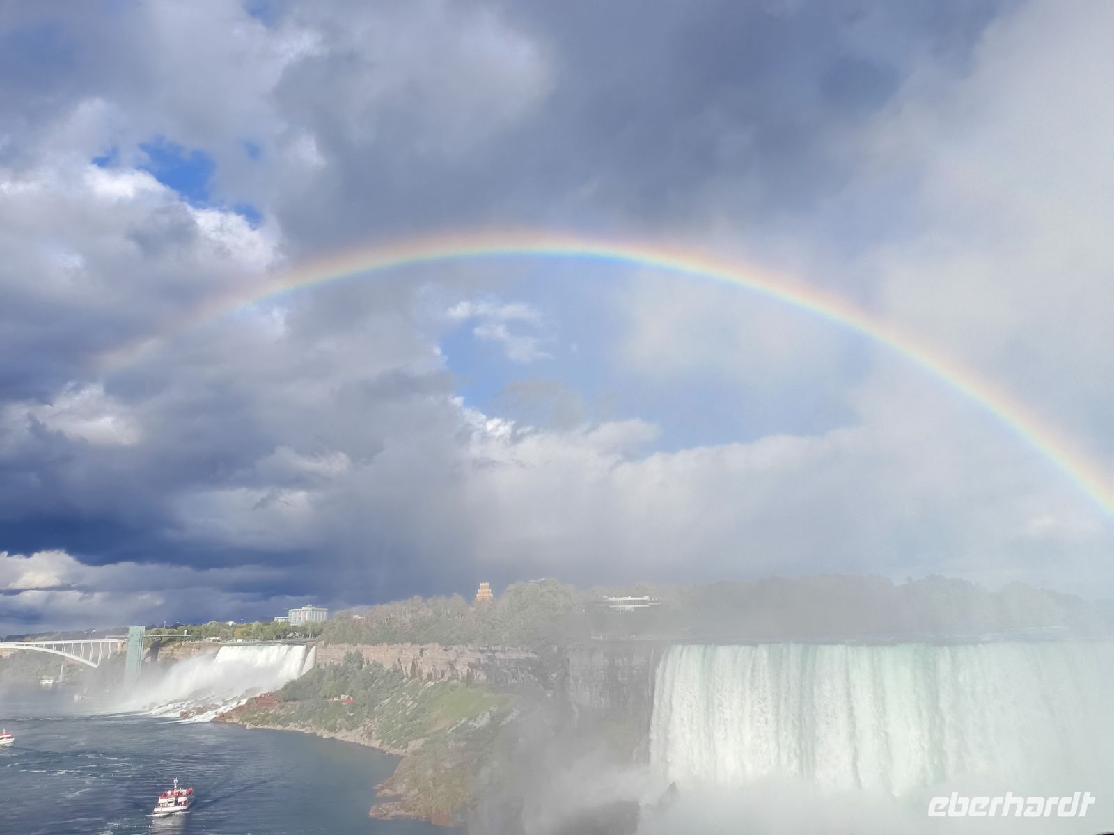 Nach dem Erlebnis ziehen wir unsere roten Capes aus und fahren dann kurz mit dem Bus zum Aussichtspunkt - Table Rock. Das Wetter hat es sich doch überlegt, und möchte uns nicht enttäuschen, pustet auf einmal die Wolken weg, die Sonne strahlt und durch die Gicht von den Niagaras bekommen wir einen wunderschönen Regenbogen. Was für ein Erlebnis – X mal fotografieren wir das Naturschauspiel von verschiedenen Perspektiven. Aber unser Gedächtnis hat sowieso alle gespeichert…