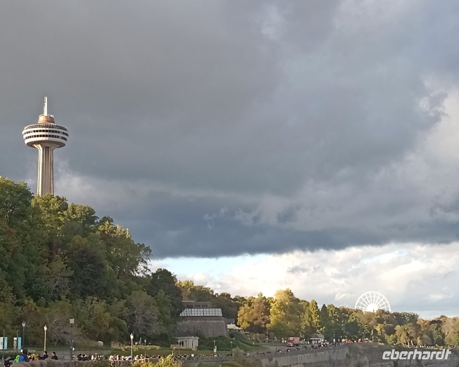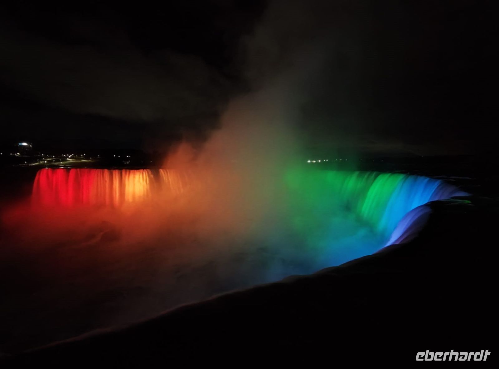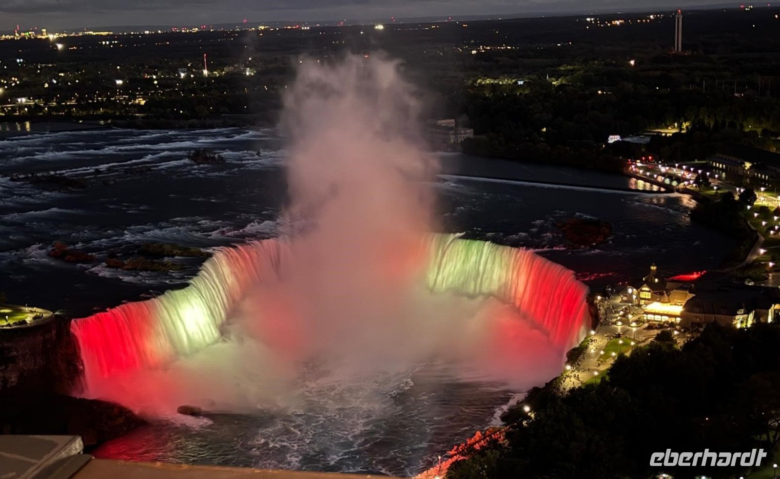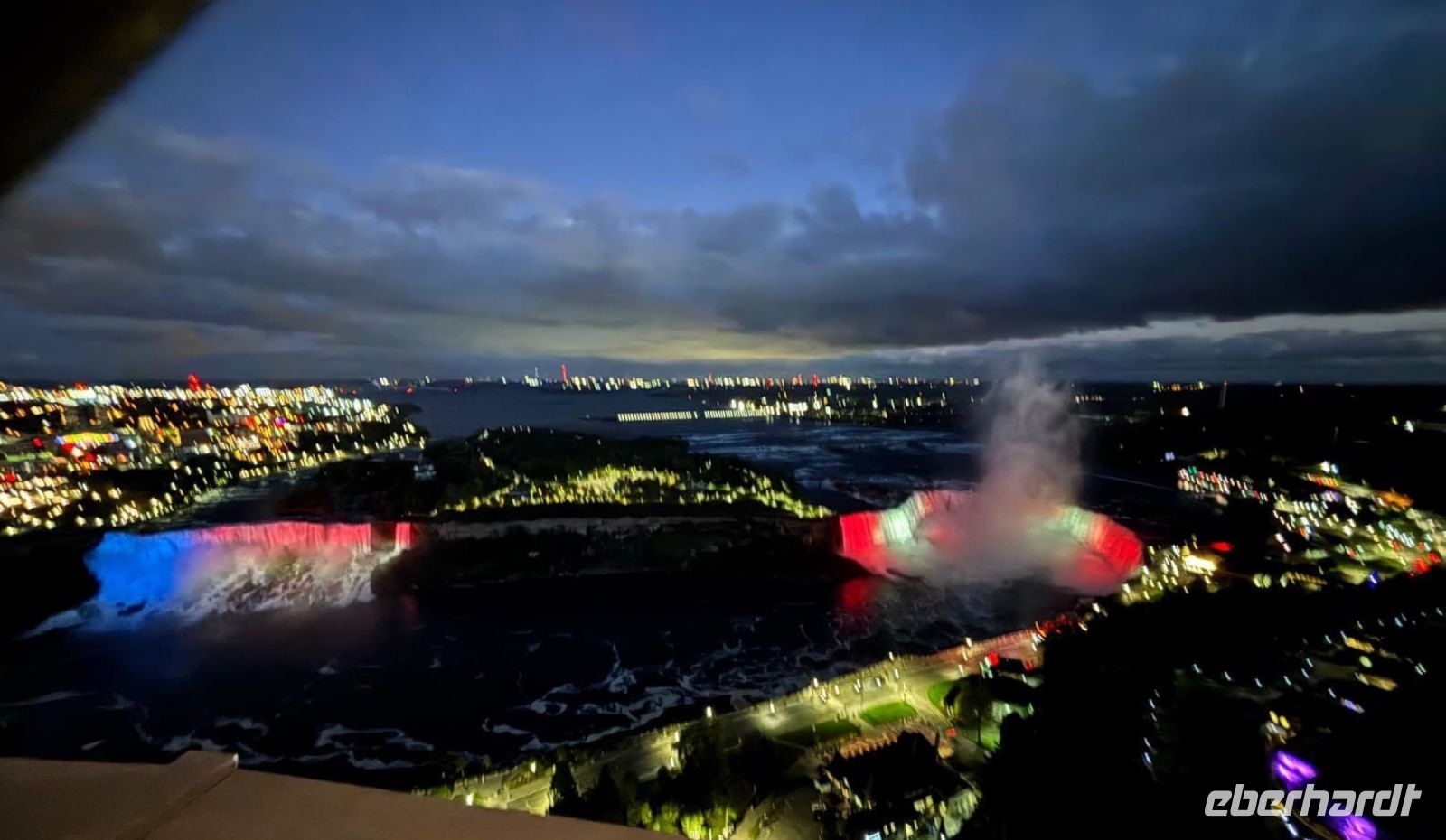 Wir fahren noch durch das Gebiet der Hotels und an den Skylon Tower. Marion gibt noch ein paar Empfehlungen zu umliegenden Restaurants, ich empfehle den Gästen einen Spaziergang zu den Niagara Fällen am Abend, wenn sie in allen Farben beleuchtet werden. Noch einmal ganz anderes Bild von diesem Naturschauspiel.