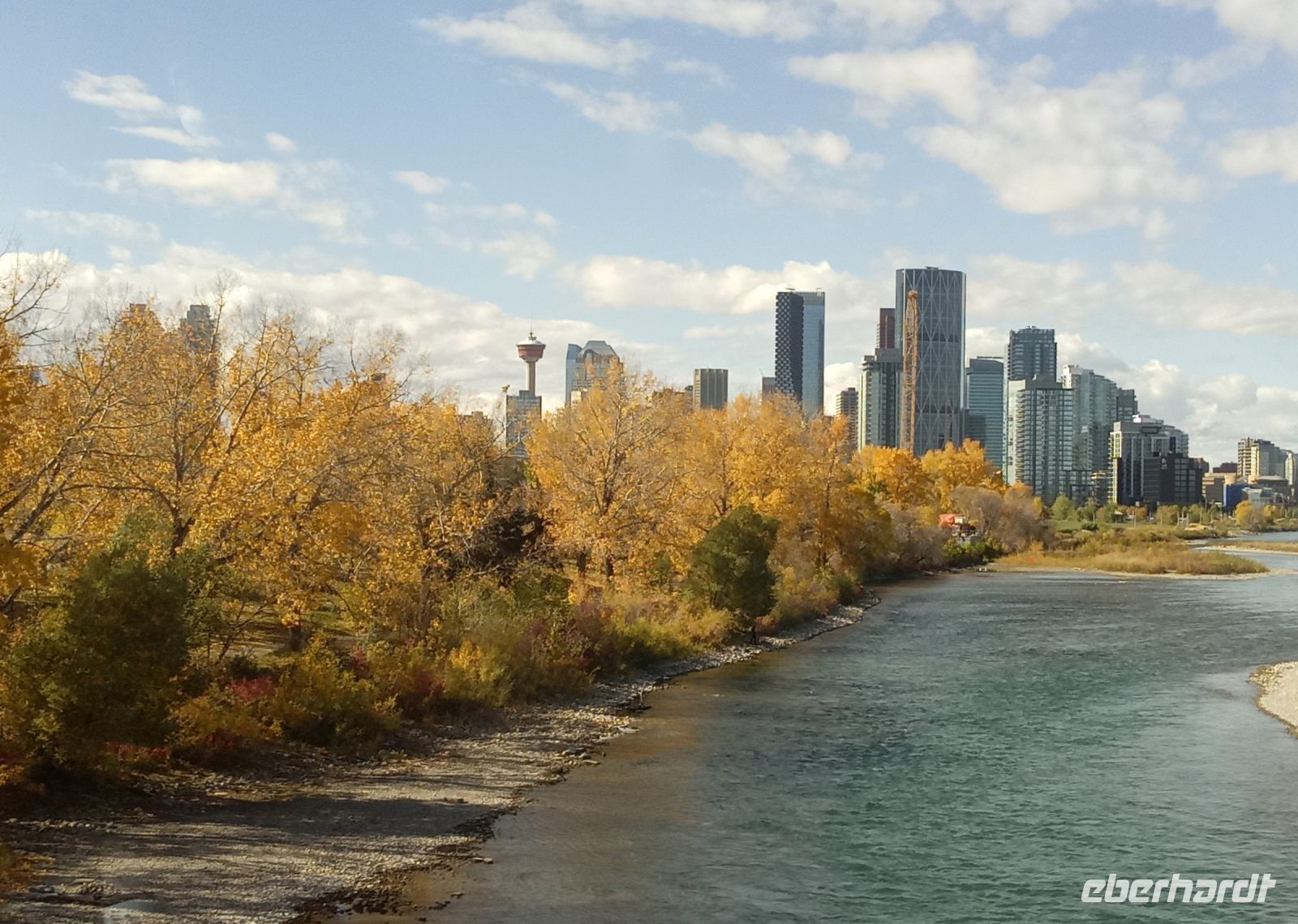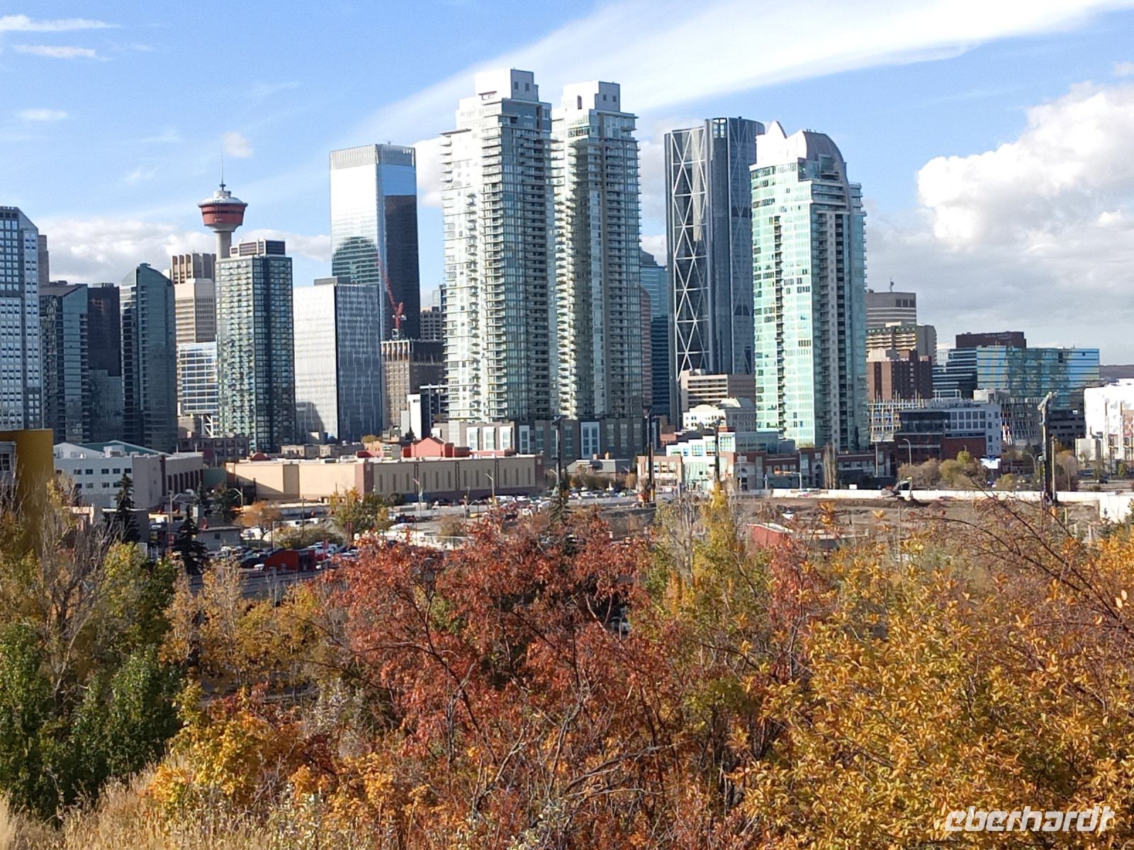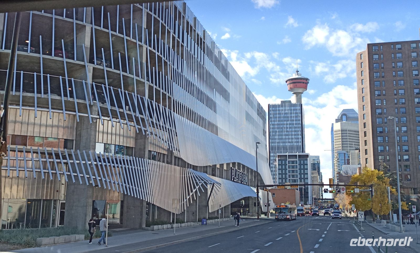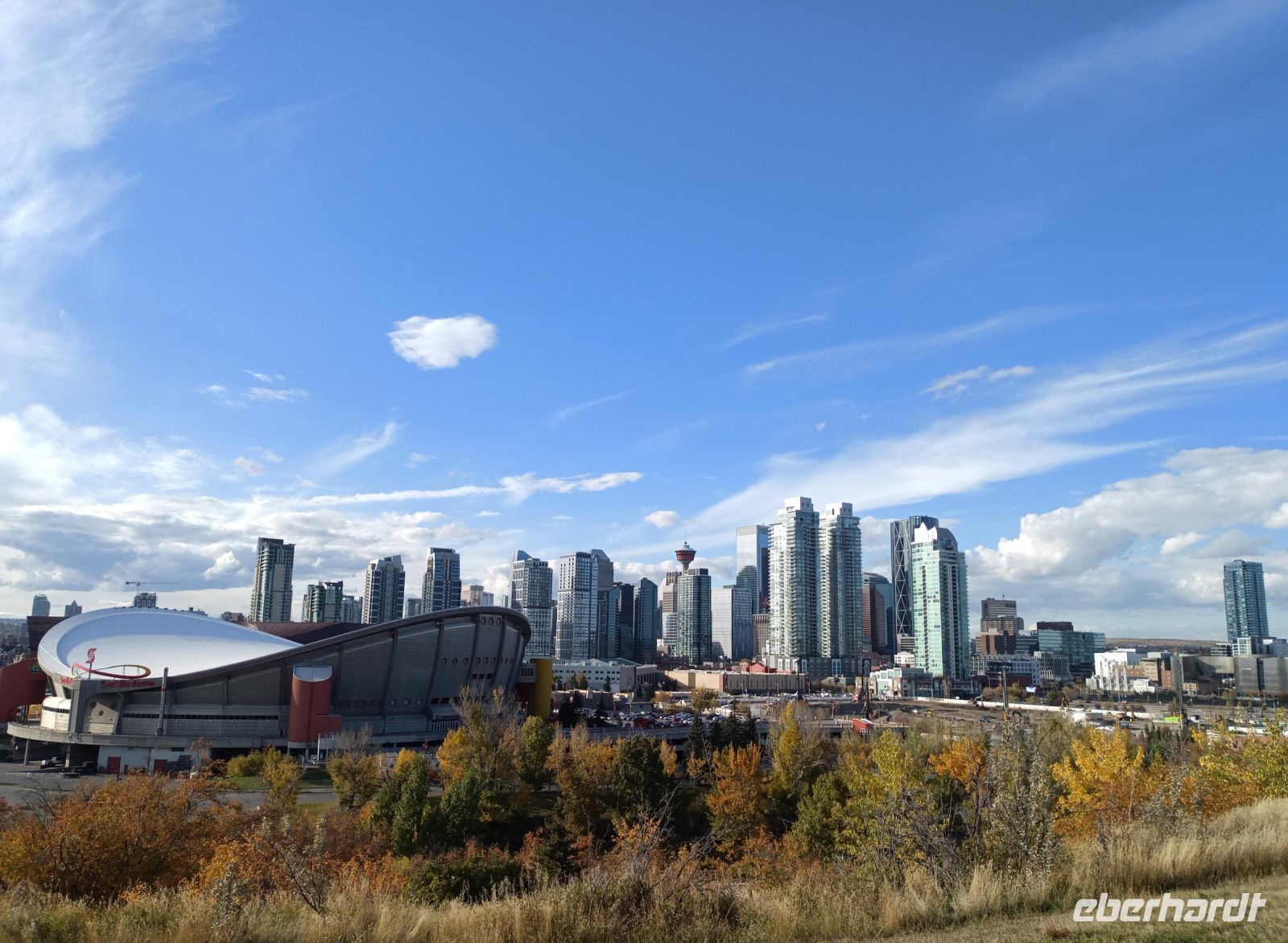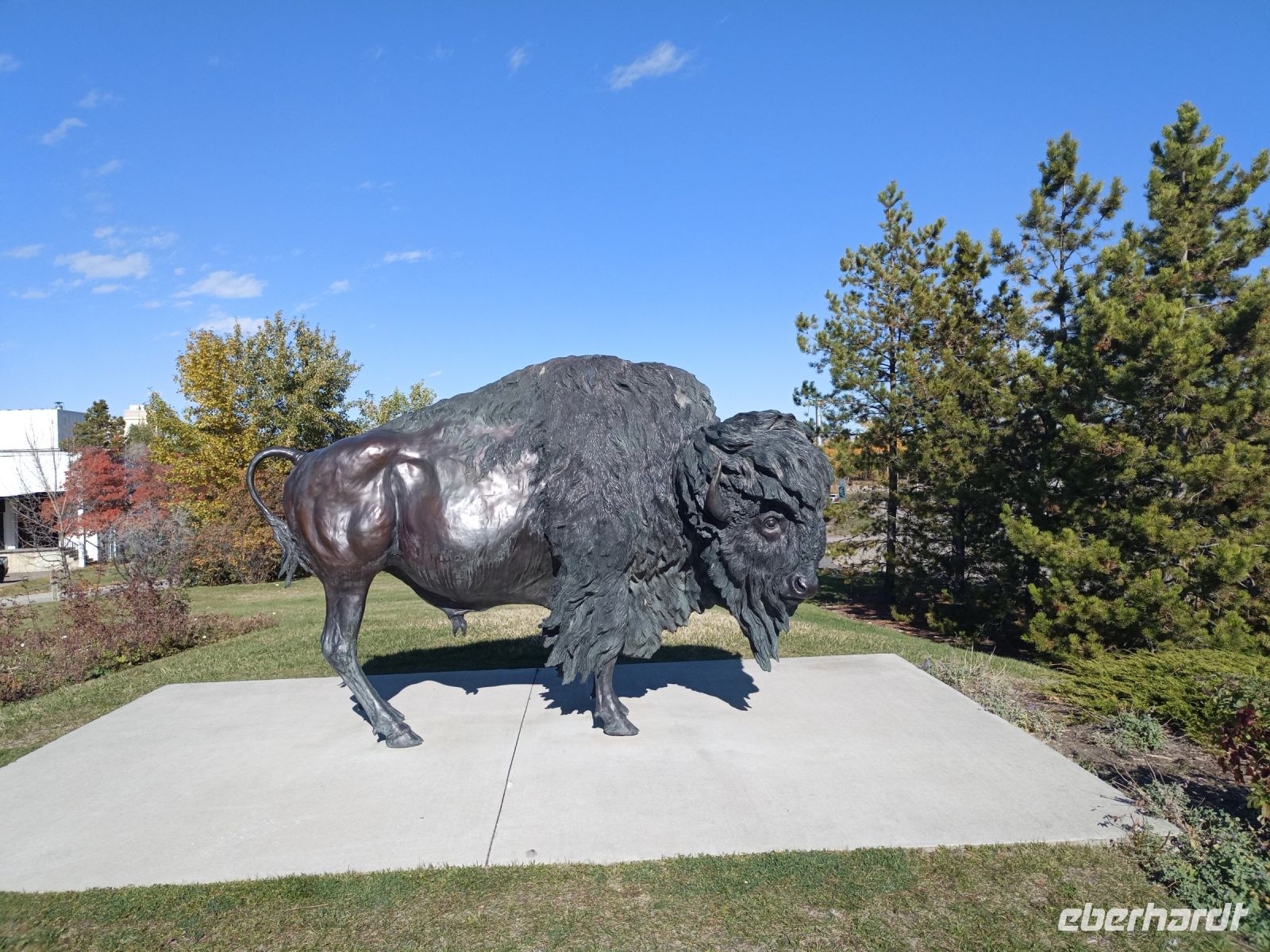 Calgary empfängt uns mit wunderbaren herbstlichen Sonnenwetter. Calgary liegt an dem Zusammenfuß der Flüsse Bow River und Ellbow River. Vor den Toren Calgarys halten wir an einem symbolträchtigen Ort: der beeindruckenden Bison Statue die an die Bedeutung der Bisons für die Ureinwohner und die frühen Siedler erinnert. Direkt daneben befindet sich das Denkmal für Colonel James MacLeod, eine historische Figur, die mit der Gründung der North-West Mounted Police eng verbunden ist. Wir fahren an imposanten Gebäuden aus Glas vorbei, mit einzigartiger moderner Architektur – Plattform Innovation Center, Zentralbibliothek. Bow Gebäude, Calgary Tower und vielen Geschäftstower. Die Sonne glitzert in der Glasfassaden und spiegelt die umliegenden Hochhäuser. Dazwischen findet man immer wieder etwas ältere historische Gebäude – wie ein Mosaik aus alt und neu.