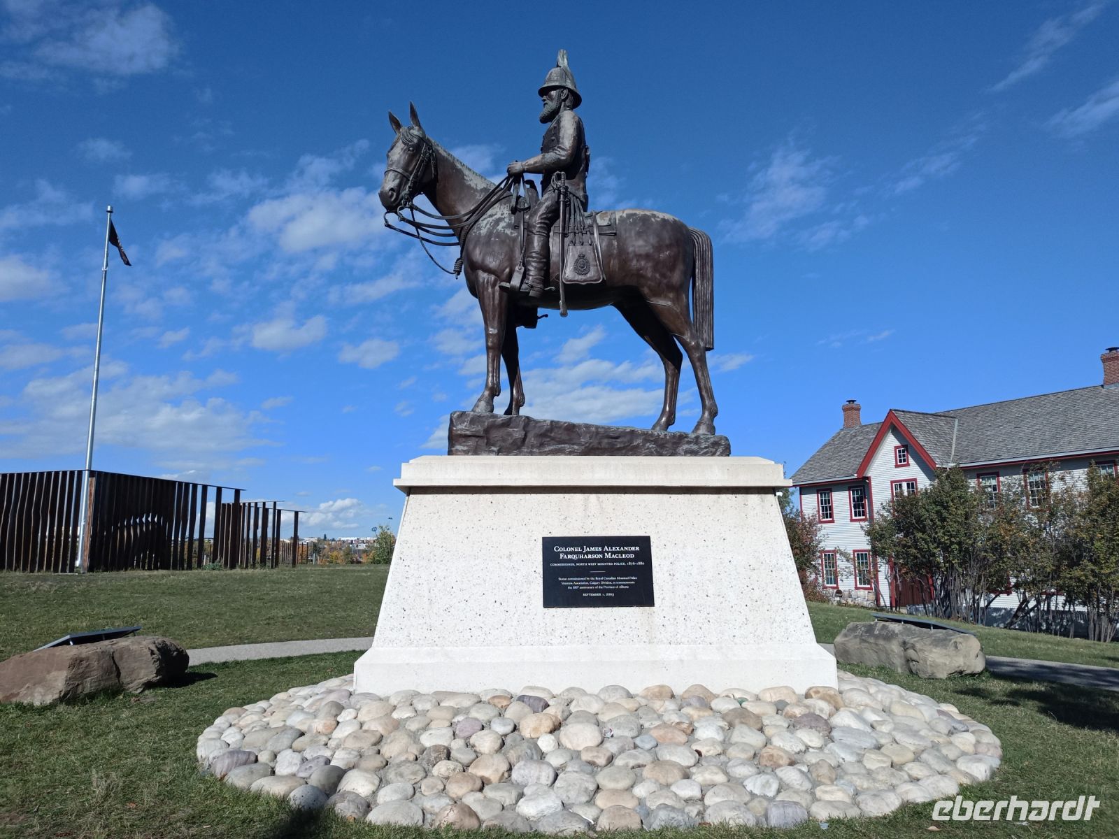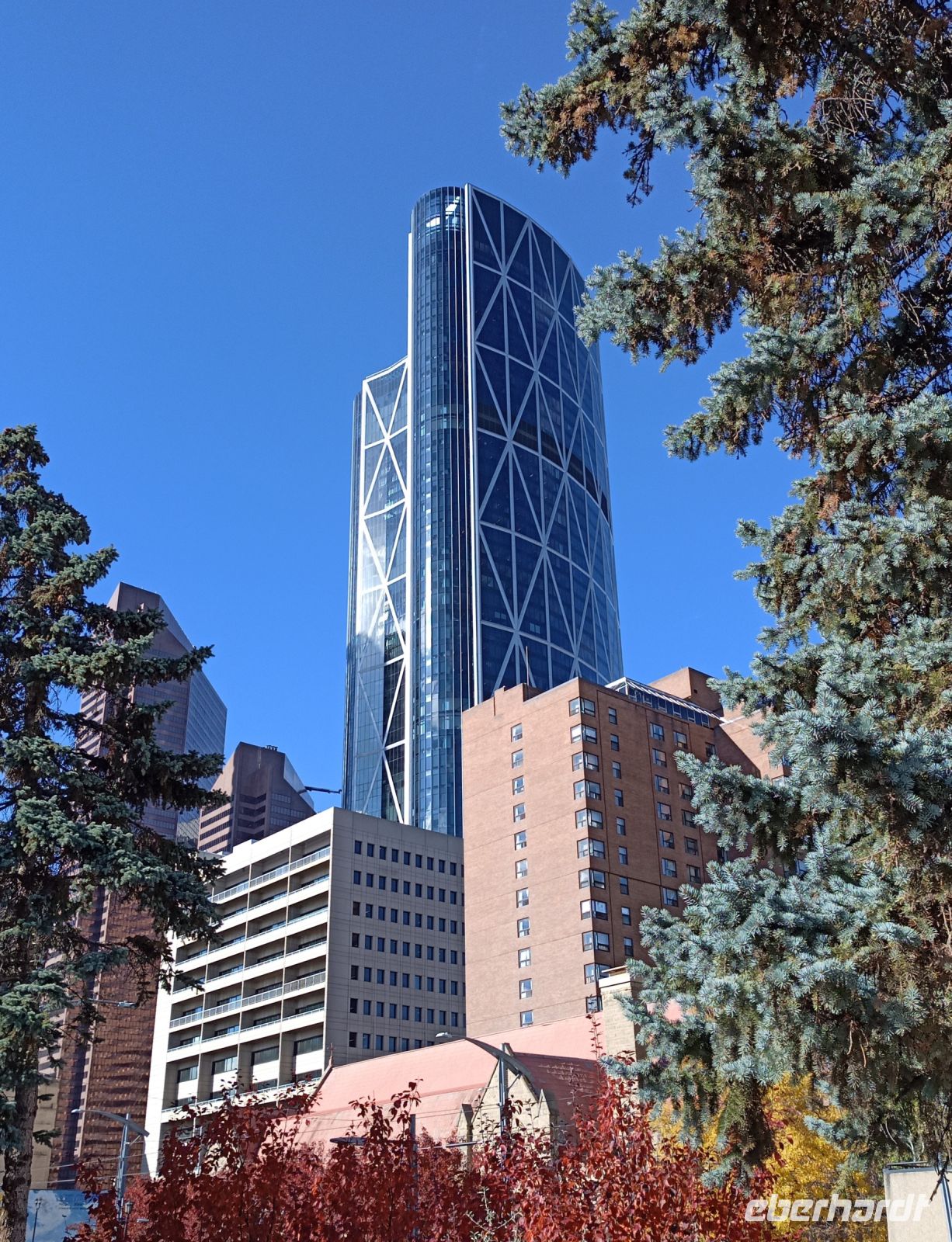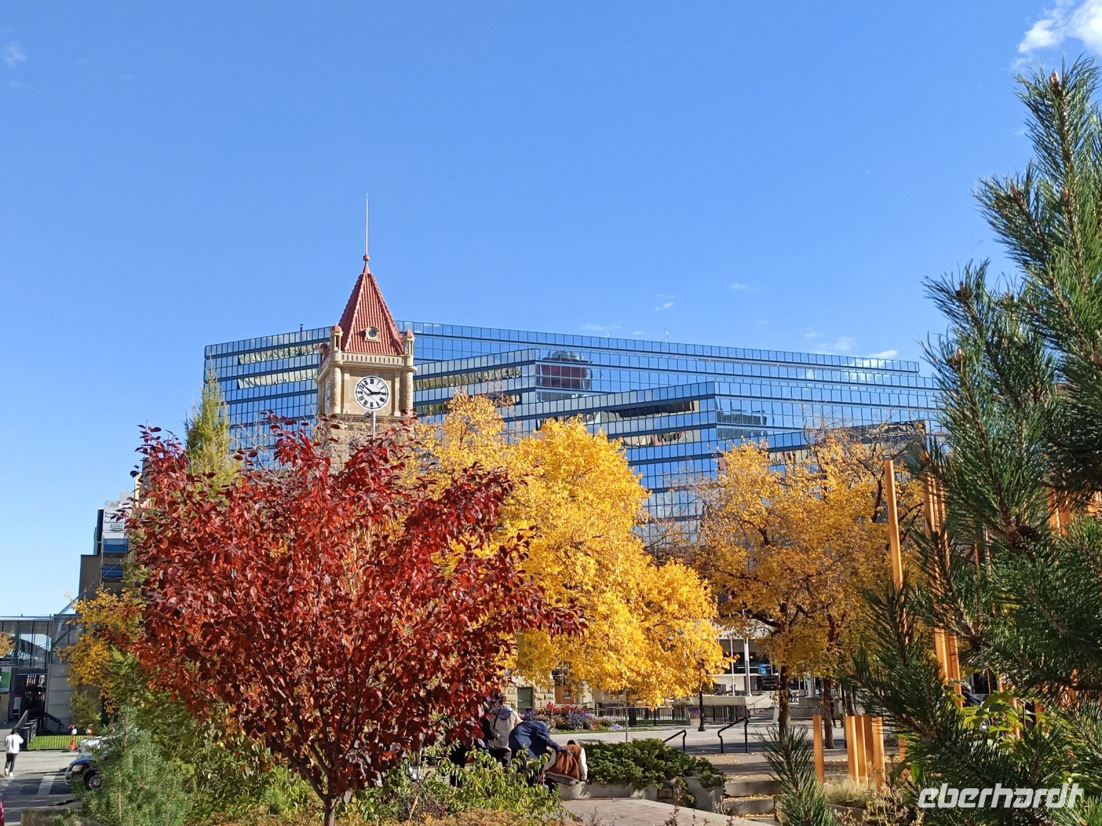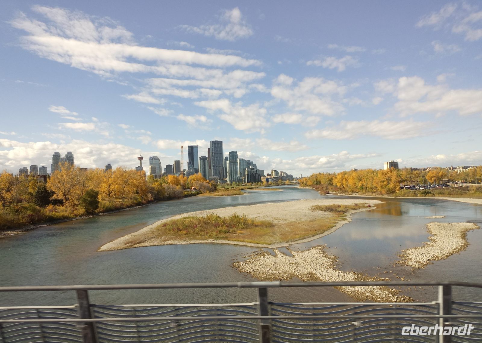 Calgary empfängt uns mit wunderbaren herbstlichen Sonnenwetter. Calgary liegt an dem Zusammenfuß der Flüsse Bow River und Ellbow River. Vor den Toren Calgarys halten wir an einem symbolträchtigen Ort: der beeindruckenden Bison Statue die an die Bedeutung der Bisons für die Ureinwohner und die frühen Siedler erinnert. Direkt daneben befindet sich das Denkmal für Colonel James MacLeod, eine historische Figur, die mit der Gründung der North-West Mounted Police eng verbunden ist. Wir fahren an imposanten Gebäuden aus Glas vorbei, mit einzigartiger moderner Architektur – Plattform Innovation Center, Zentralbibliothek. Bow Gebäude, Calgary Tower und vielen Geschäftstower. Die Sonne glitzert in der Glasfassaden und spiegelt die umliegenden Hochhäuser. Dazwischen findet man immer wieder etwas ältere historische Gebäude – wie ein Mosaik aus alt und neu.