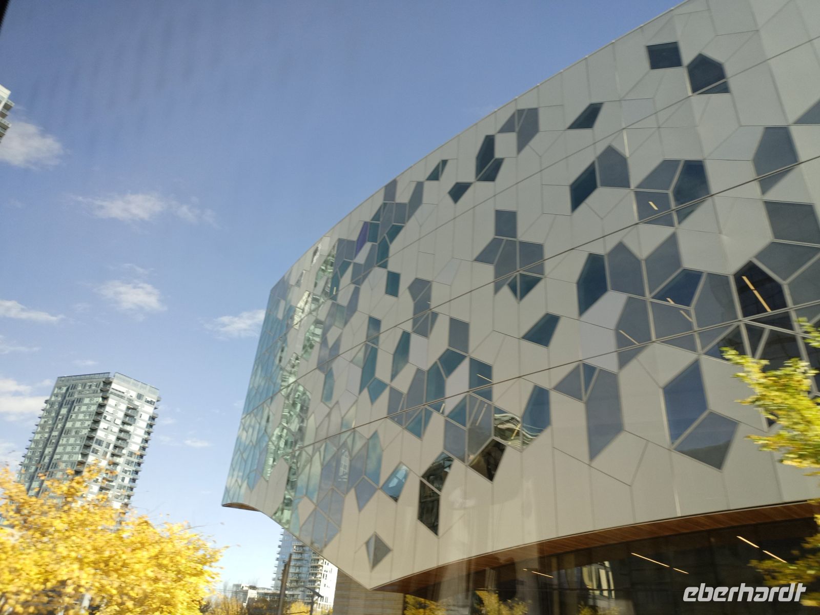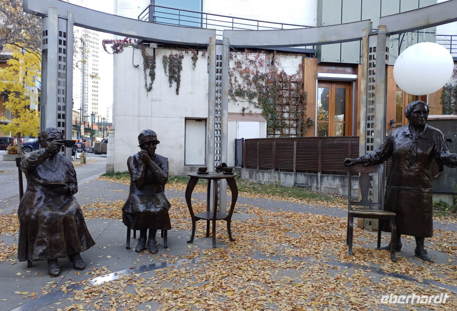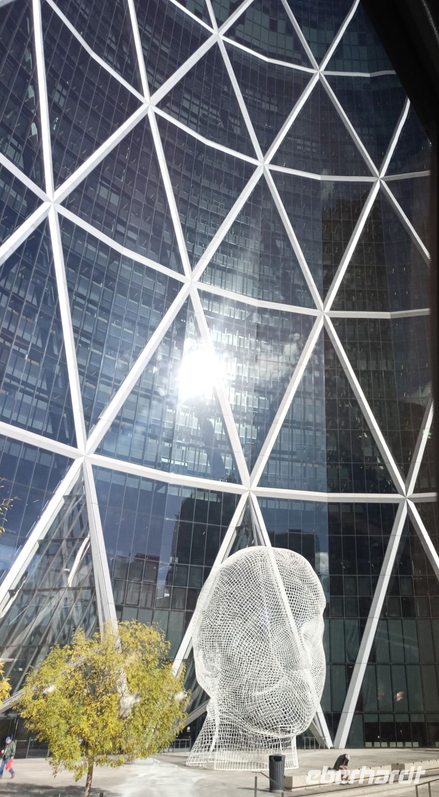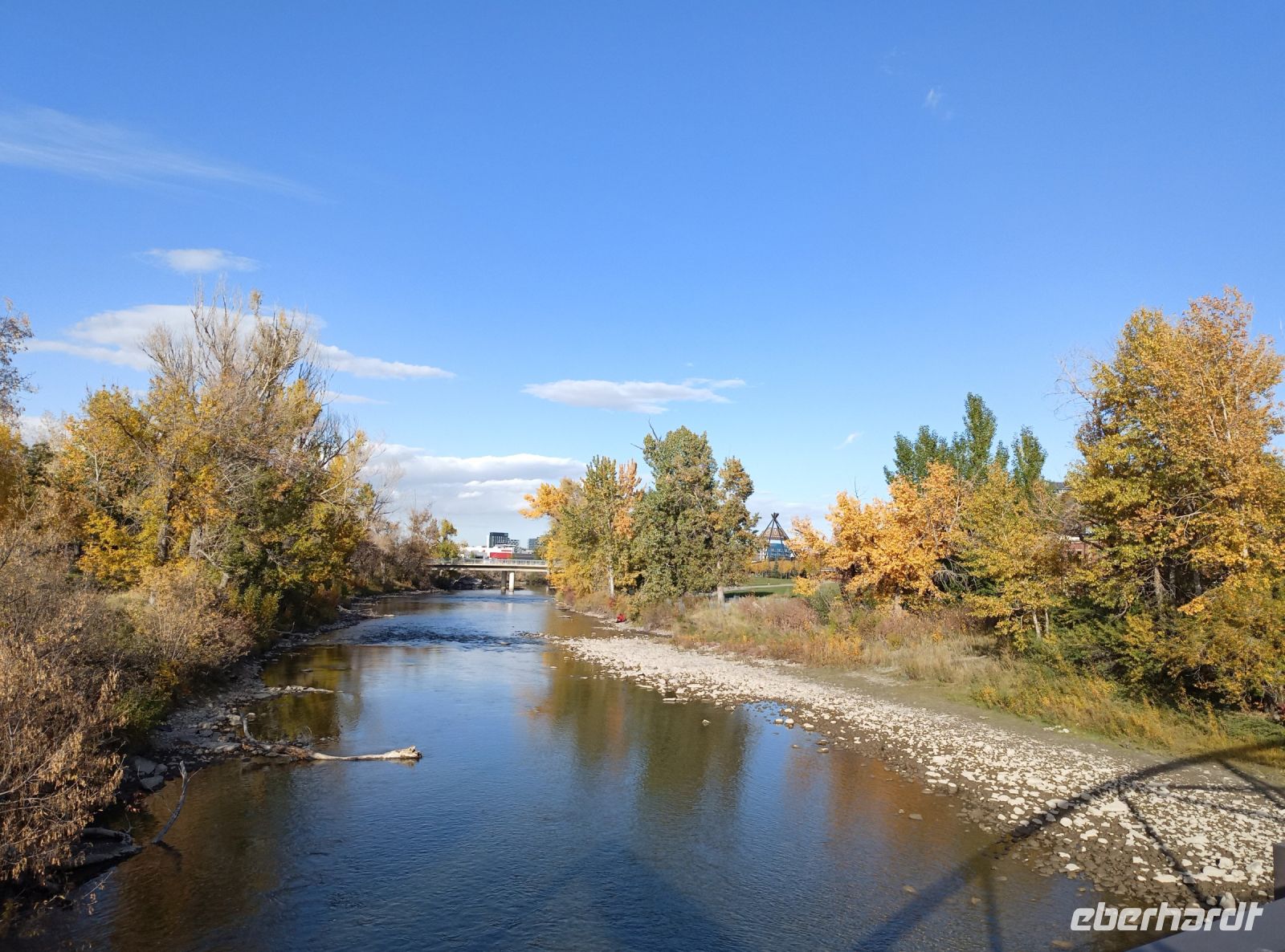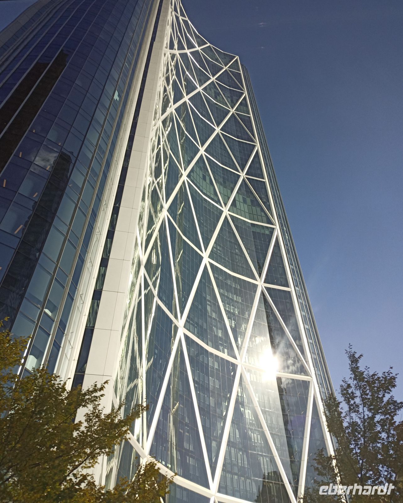 Calgary empfängt uns mit wunderbaren herbstlichen Sonnenwetter. Calgary liegt an dem Zusammenfuß der Flüsse Bow River und Ellbow River. Vor den Toren Calgarys halten wir an einem symbolträchtigen Ort: der beeindruckenden Bison Statue die an die Bedeutung der Bisons für die Ureinwohner und die frühen Siedler erinnert. Direkt daneben befindet sich das Denkmal für Colonel James MacLeod, eine historische Figur, die mit der Gründung der North-West Mounted Police eng verbunden ist. Wir fahren an imposanten Gebäuden aus Glas vorbei, mit einzigartiger moderner Architektur – Plattform Innovation Center, Zentralbibliothek. Bow Gebäude, Calgary Tower und vielen Geschäftstower. Die Sonne glitzert in der Glasfassaden und spiegelt die umliegenden Hochhäuser. Dazwischen findet man immer wieder etwas ältere historische Gebäude – wie ein Mosaik aus alt und neu.